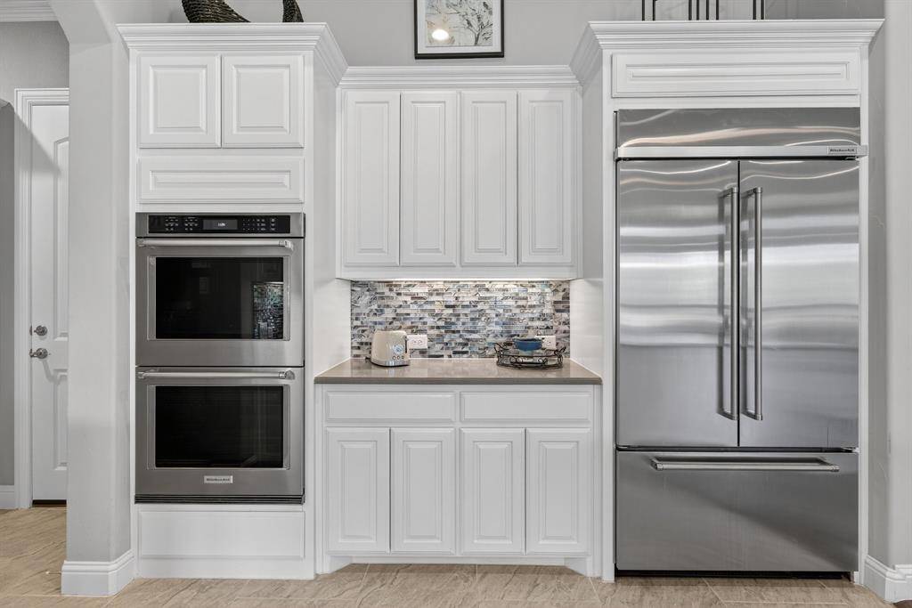 The chef's kitchen is as functional as it is beautiful, with an oversized quartz island, gas cooktop with pot filler, built-in KitchenAid fridge, and abundant storage. The private primary suite offers a spa-like bath and a huge walk-in closet connecting directly to the laundry room complete with sink, shelves, hanging space, and room for an extra refrigerator.