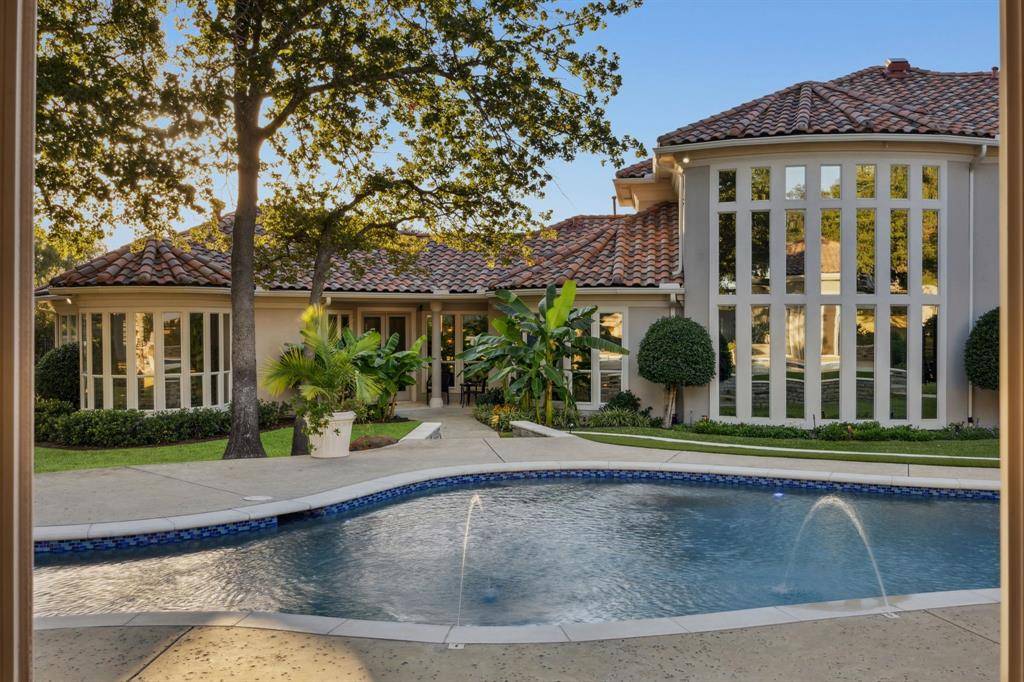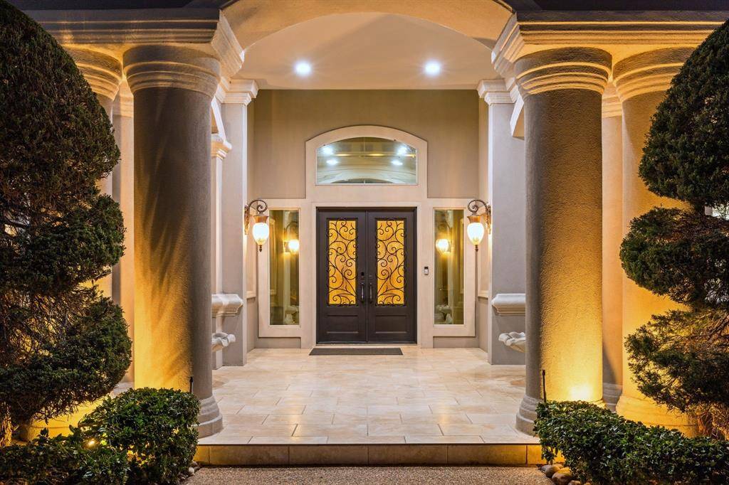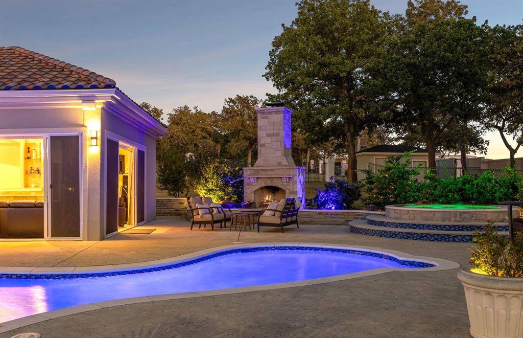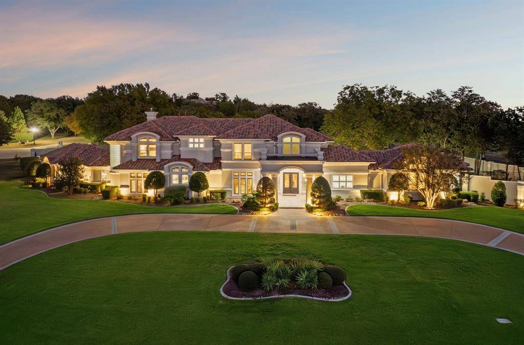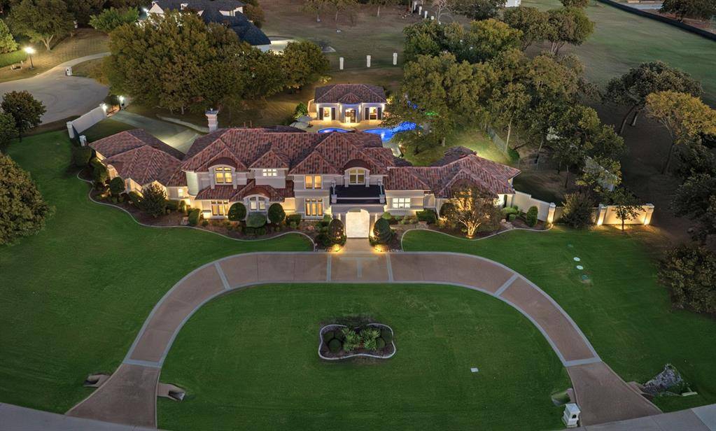 Experience luxury living in the prestigious 24 hr guard gated golf community The Estates at Tour 18, that feeds into exemplary Argyle ISD. With over 7,100+ sq ft of custom construction featuring the extraordinary recent cabana, exterior stone FP, spa and gorgeous hardscape and gardens. Perfectly positioned on a rare corner and cul-de-sac 2 acre+ lot that combines refined design, smart home technology and tranquil year round indoor-outdoor living. Step through double glass + iron doors into a dramatic entry with soaring cathedral ceilings, a striking curved staircase and floor to ceiling windows. The open concept dining area connects to a butler's pantry and walk-in food pantry with a sleek pocket door and temperature-controlled wine room. The gourmet kitchen features custom wood cabinetry, concealed refrigerator, pot filler, stainless appliances, central island, and bar seating that flows into the breakfast nook and family room with a fireplace, media wall and walk-in bar. The large executive office showcases handsome floor-to-ceiling built-ins with panoramic windows of the backyard. The private primary retreat features extra large sitting area, dual sided fireplace, coffee bar, wellness room, dual vanities, soaking tub, glass-enclosed shower, and an expansive walk-in closet with additional large cedar closet. Upstairs includes spacious secondary bedsuites, a game room with balcony, kitchenette and bar, allowing flexible living spaces. The next level resort-style backyard showcases the meandering resort pool, extra large separate stone spa, freestanding stone FP, and the recent luxury cabana equipped with full kitchen, separate dining room and living space — grill, large stone island bar, dishwasher, ice maker, warming oven, and refrigerator. Finished with a Spanish tile roof, gated motor court, extensive sound and security systems, additional parking for events + five-car garage. An amazing estate and well priced opportunity to own in the coveted golf community.