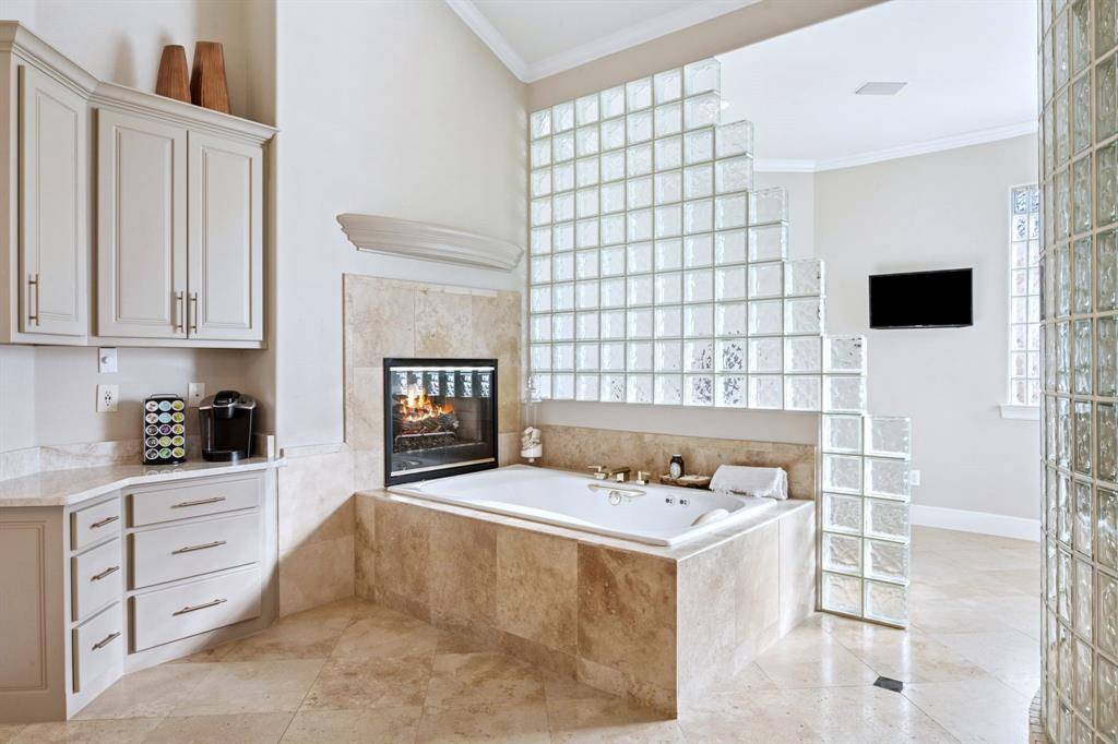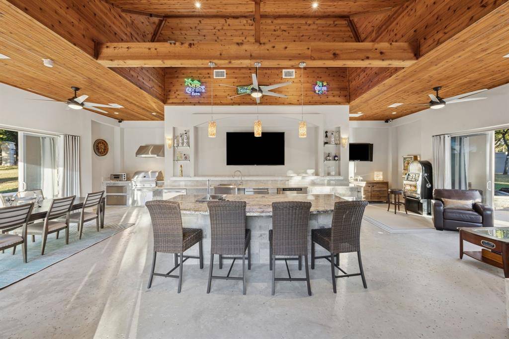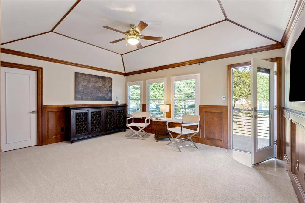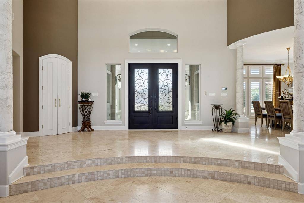 Experience luxury living in the prestigious 24 hr guard gated golf community The Estates at Tour 18, that feeds into exemplary Argyle ISD. With over 7,100+ sq ft of custom construction featuring the extraordinary recent cabana, exterior stone FP, spa and gorgeous hardscape and gardens. Perfectly positioned on a rare corner and cul-de-sac 2 acre+ lot that combines refined design, smart home technology and tranquil year round indoor-outdoor living. Step through double glass + iron doors into a dramatic entry with soaring cathedral ceilings, a striking curved staircase and floor to ceiling windows. The open concept dining area connects to a butler's pantry and walk-in food pantry with a sleek pocket door and temperature-controlled wine room. The gourmet kitchen features custom wood cabinetry, concealed refrigerator, pot filler, stainless appliances, central island, and bar seating that flows into the breakfast nook and family room with a fireplace, media wall and walk-in bar. The large executive office showcases handsome floor-to-ceiling built-ins with panoramic windows of the backyard. The private primary retreat features extra large sitting area, dual sided fireplace, coffee bar, wellness room, dual vanities, soaking tub, glass-enclosed shower, and an expansive walk-in closet with additional large cedar closet. Upstairs includes spacious secondary bedsuites, a game room with balcony, kitchenette and bar, allowing flexible living spaces. The next level resort-style backyard showcases the meandering resort pool, extra large separate stone spa, freestanding stone FP, and the recent luxury cabana equipped with full kitchen, separate dining room and living space — grill, large stone island bar, dishwasher, ice maker, warming oven, and refrigerator. Finished with a Spanish tile roof, gated motor court, extensive sound and security systems, additional parking for events + five-car garage. An amazing estate and well priced opportunity to own in the coveted golf community.