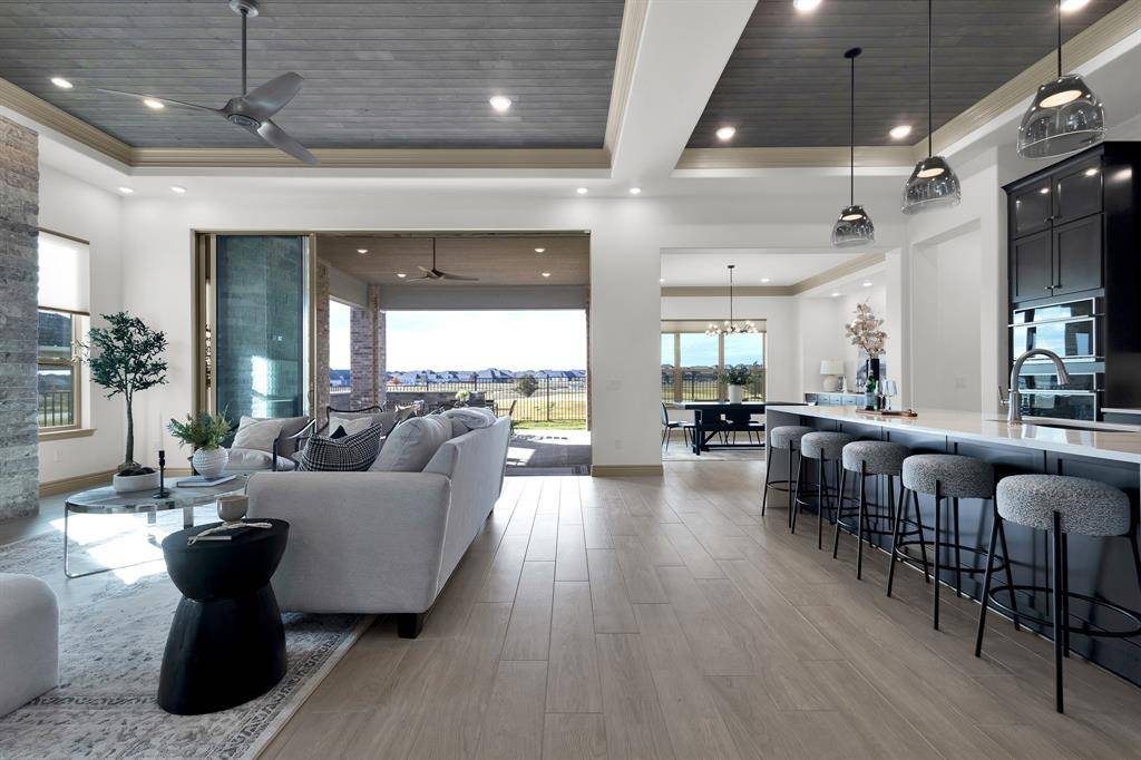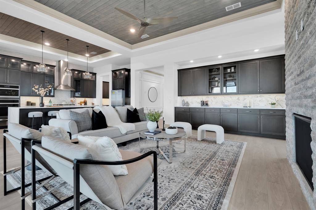 A Masterpiece on the North 5th Tee Box — The Avalon at its Absolute Finest! Discover one of the most extraordinary brand-new homes in Robson Ranch — a breathtaking Avalon floor plan positioned perfectly on the North 5th tee box, crafted with custom finishes! The expansive open layout is anchored by a showpiece chef's kitchen featuring Quartz waterfall countertops, GE Monogram Smart appliances, lighted glass cabinetry, and an impressive butler's pantry. Every detail has been elevated — from the wood tongue-and-groove ceilings in the kitchen and great room to the striking stone fireplace that defines the space. Massive stackable sliding glass doors blur the line between indoor and outdoor living, guiding you to an oversized covered patio with its own fireplace — all overlooking the manicured golf course for unmatched views. The primary suite is a retreat unto itself, complete with its own stackable sliders, spa-level finishes, and a curbless walk-in shower wrapped in designer tile. A large walkthrough custom closet adds a boutique-level touch, providing elegant storage and exceptional functionality. The outdoor transformation is just as impressive — with over $100,000 in professional landscaping, hardscaping, and a custom retaining wall, creating a private, polished, and low-maintenance oasis worthy of the home's interior. Even the garage makes a statement, featuring a 4' extension, full epoxy flooring, and upgraded finishes. Every inch of this home reflects luxury, craftsmanship, and thoughtful design. It is a true entertainer's paradise — brand new, never lived in, and ready for you!
