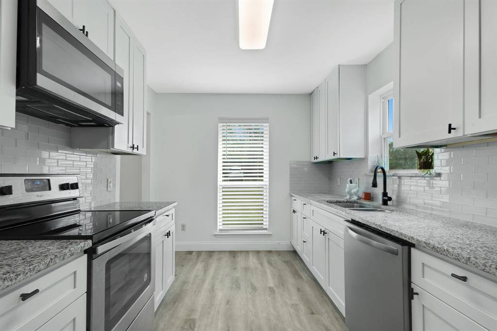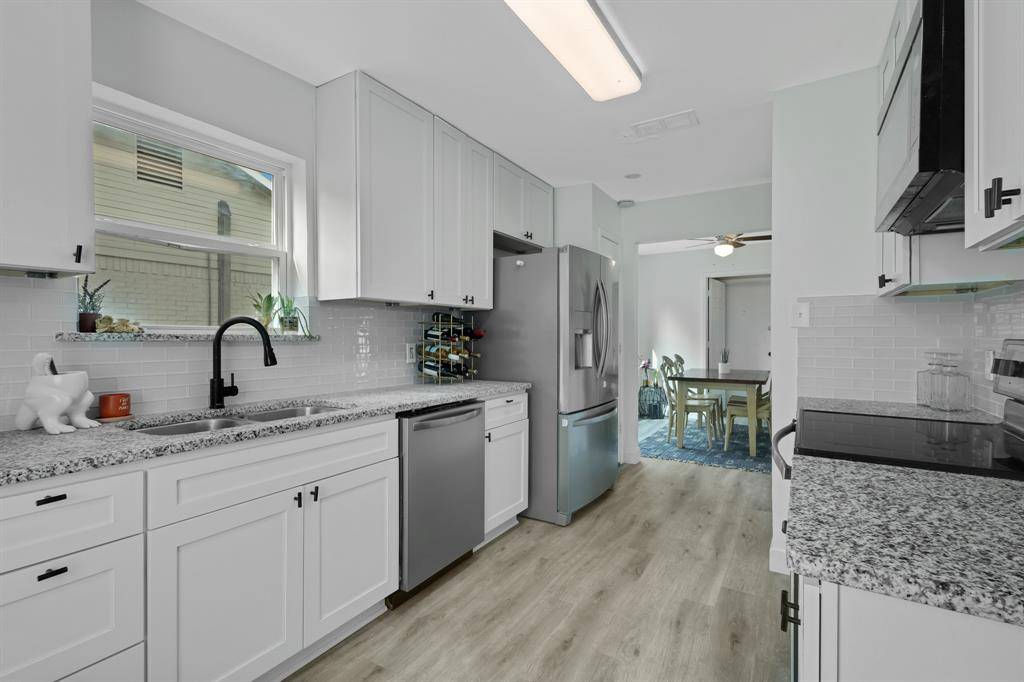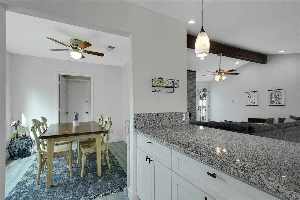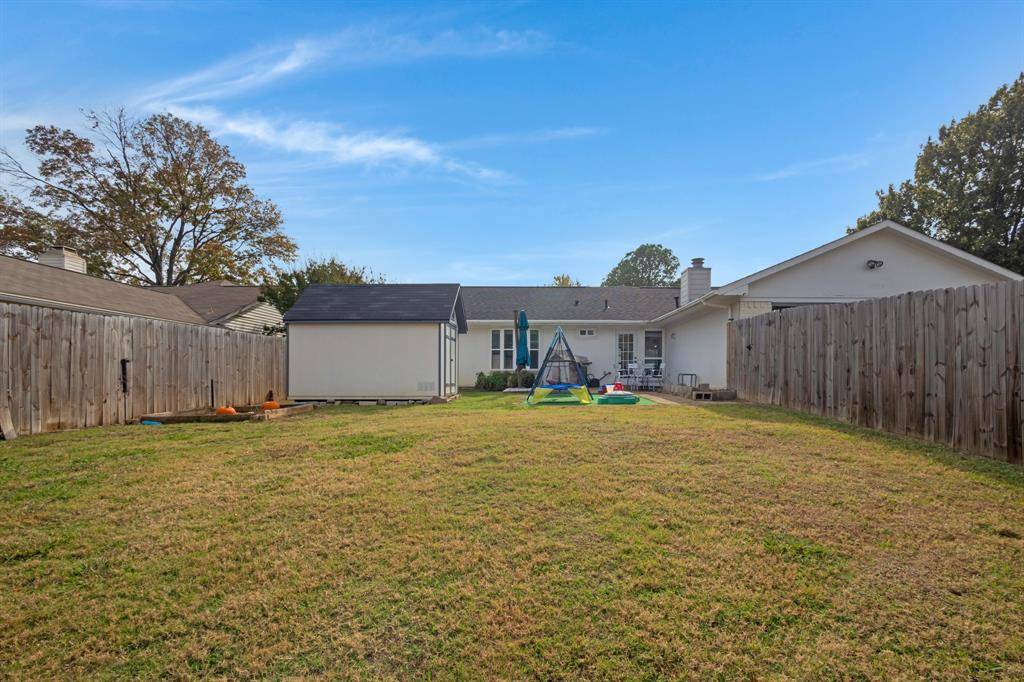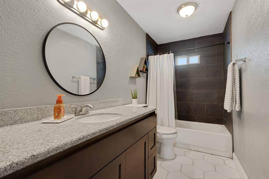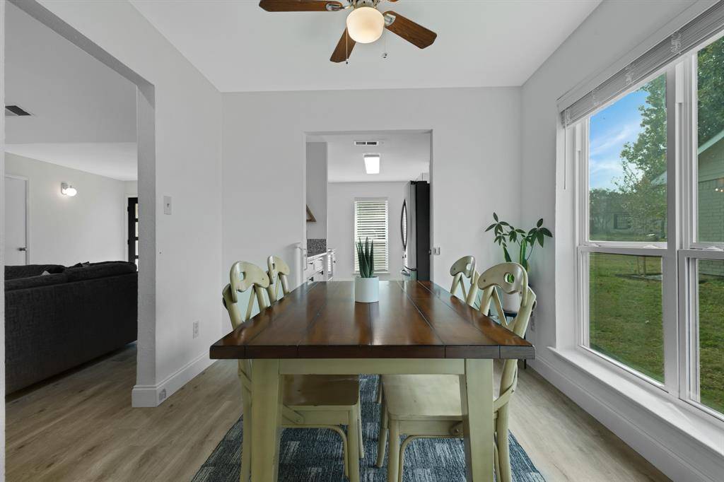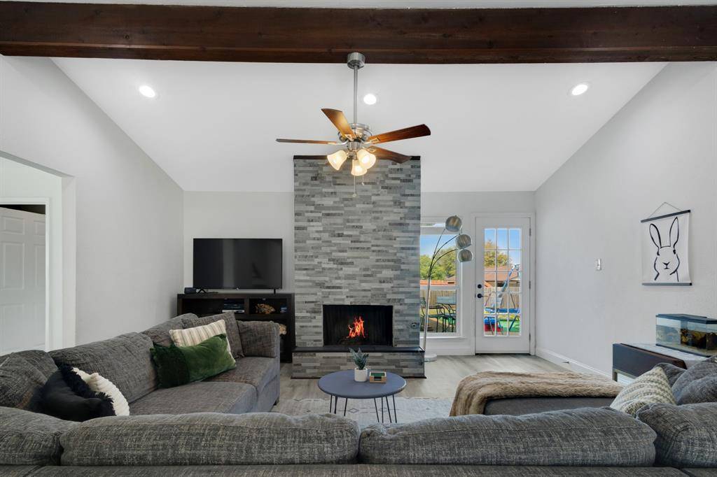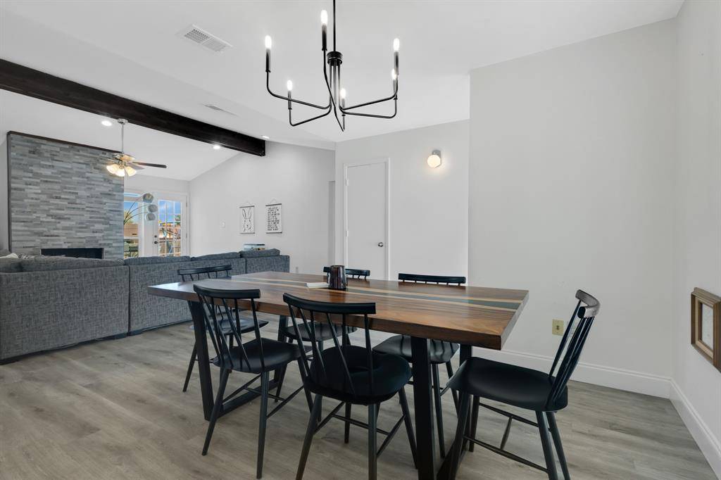 Step into this beautifully updated one story, 3 bed, 2 bath home centrally located in the heart of Lewisville. Light and bright throughout, the home features cathedral ceilings and vinyl flooring that flows seamlessly from room to room with no carpet in this home! The inviting living area showcases a striking floor to ceiling decorative tile fireplace, creating a stunning focal point and opens to the dining area with natural light pouring over the space. The updated kitchen offers granite countertops, stainless steel appliances, and plenty of counterspace with a pass-through serving area or breakfast bar creating a more open feel between the spaces. A separate breakfast nook outside the kitchen can be easily closed off to be utilized as an office or playroom. Enjoy peace of mind with updated PEX plumbing in the home, a 1 year old roof, newer windows, garage door & HVAC system. Schedule a showing today to tour the home in person and truly appreciate the thoughtful touches that make this house a great home! Outside, a large backyard provides ample space for play, pets, or entertaining, complete with an open patio perfect for outdoor dining and a shed for your storage needs. A charming covered front porch adds to the home's welcoming curb appeal. This is the ideal blend of comfort, style, and convenience. Ask an agent for the link to the Virtual tour!