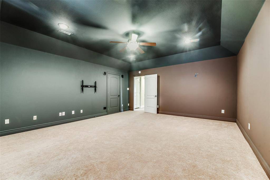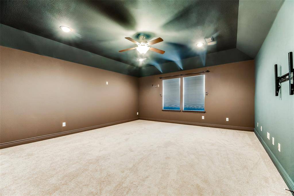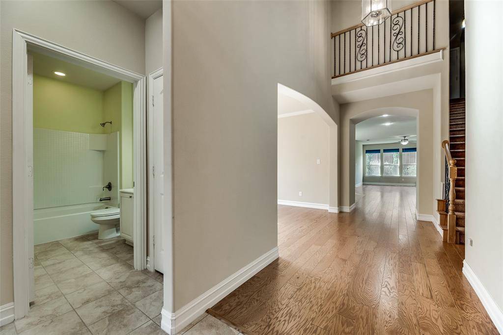 Prepare to be captivated by this stunning, highly upgraded 3-bedroom, 3-bathroom residence designed for modern living and sophisticated entertaining, all within a prime location just minutes from major corporate headquarters and premier shopping. Step inside onto rich hardwood floors beneath soaring ceilings, illuminated by decorative, energy-saving LED lighting, and enjoy the cozy ambiance of the beautiful stone fireplace in the spacious family room, which features a genius study and or planning area with custom built-in cabinetry. The chef's dream kitchen boasts sleek granite countertops, a functional island, a large walk-in pantry, and an abundance of cabinet space. The private main-level Master Suite is your spa-like sanctuary, complete with a deep garden tub, separate shower, dual sinks, and a truly HUGE walk-in closet, while a convenient guest bedroom, full bath, and separate study are also located downstairs. Upstairs, discover a massive, versatile area including a full bedroom and bathroom, alongside the ultimate HUGE media room, prewired for immersive 7.1 surround sound—perfect for movie nights. With quick access to HWY 121, the Toyota Headquarters, and Stonebriar Mall, this turn-key, feature-packed home offers an unbeatable lifestyle opportunity.