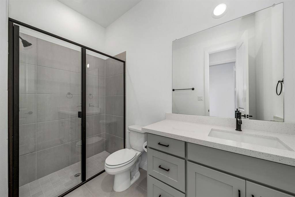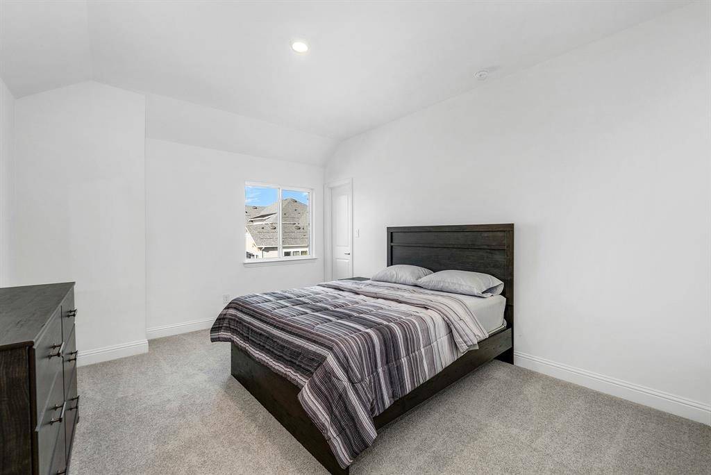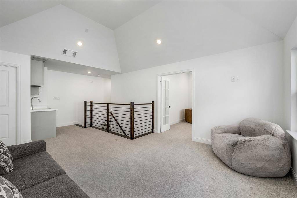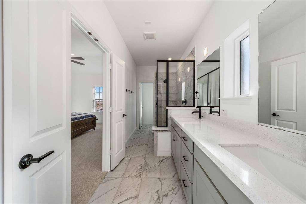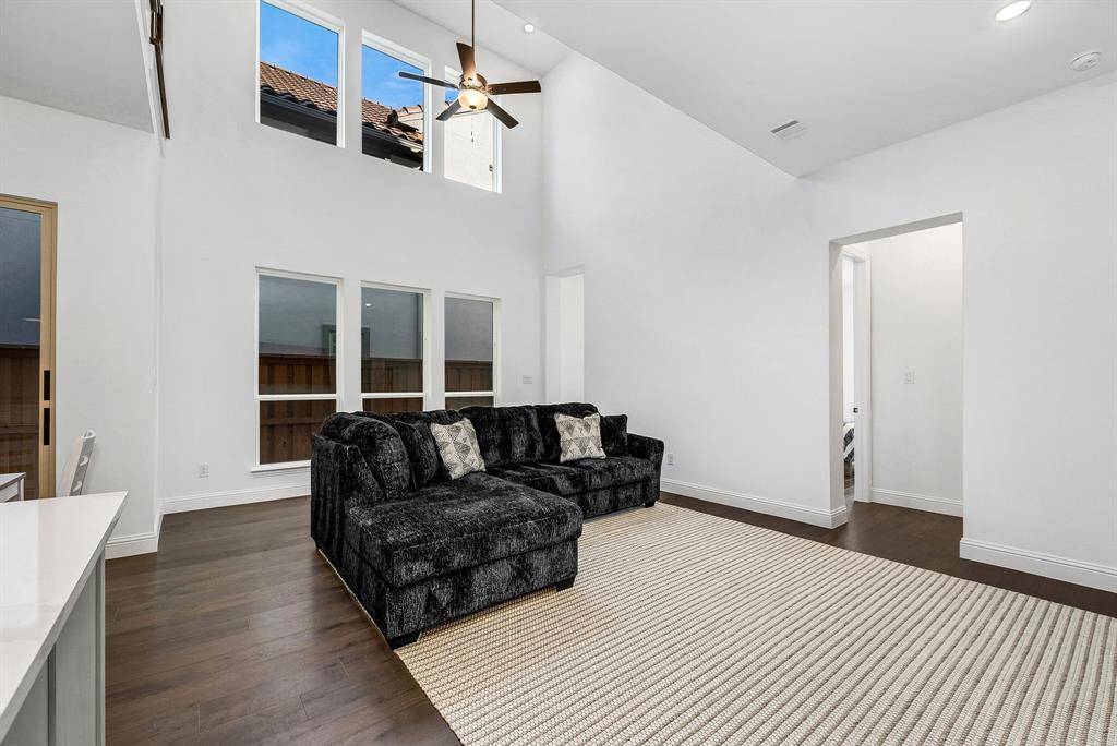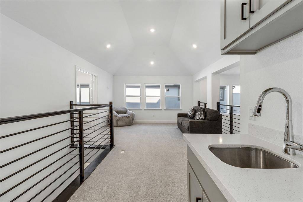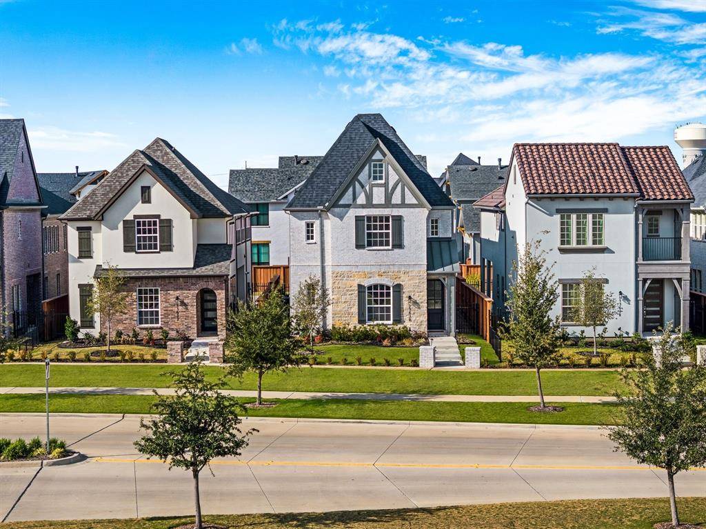 Rare park-front views, walkable resort-style amenities, and a low-maintenance lifestyle—just moments from the PGA District, Fields Ranch golf, and future Fields West for premier shopping, dining, and entertainment. This modern two-story home offers bright, open living and peaceful green surroundings. A stone-and-brick exterior with a small covered porch leads into an engineered wood foyer with a coat closet. The spacious living room features soaring ceilings. The main level includes a guest bedroom with engineered wood floors and walk-in closet, served by a full bath with quartz vanity and a walk-in tile shower. The kitchen offers a 6-burner gas cooktop, built-in microwave and electric oven, quartz island with deep stainless sink, dishwasher, and breakfast bar. The open concept dining nook is complete with sliding doors to a small covered patio and narrow wraparound yard. A butler's pantry with quartz counters and double-door pantry provides extra storage.Upstairs, the open game room overlooks the living area and features a wet bar with stainless sink and quartz countertop. A secondary bedroom includes a walk-in closet and vaulted detail, with a nearby full bath featuring tile, quartz, and a glass-enclosed tub-shower combo. An additional bedroom with French doors and walk-in closet provides a flexible work or hobby space. The primary suite features a vaulted ceiling, fan, and walk-in closet. The ensuite bath includes dual quartz vanities, an oversized black-framed glass shower, and a second walk-in closet.The utility room offers tile flooring, upper cabinets, and space for full-size washer and dryer. Enjoy premier community amenities including two resort-style pools, clubhouse, fitness center, and tennis and pickleball courts—plus an activities director curating events for connection. Live in the heart of Fields Frisco with unmatched convenience and lifestyle!