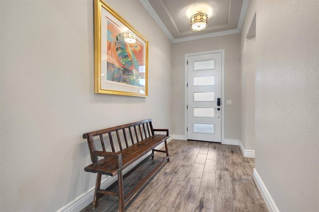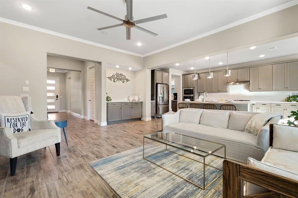 This stunning, light-filled home showcases an open-concept design and thoughtful upgrades throughout. The chef's kitchen features quartz countertops, a spacious butler's pantry, and abundant cabinetry—combining beauty and functionality. Custom lighting enhances every room, while the wood-look tile flooring adds warmth, durability, and style. A versatile and oversized Den provides generous space for work or relaxation, and the expanded laundry room includes space for an additional refrigerator plus extra storage. The spacious primary suite offers comfort and privacy, creating a peaceful retreat. Step outside to a fully fenced backyard with an extended patio and automatic patio screens—perfect for year-round enjoyment. The home also includes an RKIN OnliSoft Pro Salt-Free Water Conditioner and a Whole-House Carbon Filtration System for clean, soft water throughout. Bright, inviting, and move-in ready—this exceptional home won't last long!