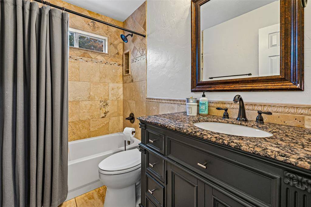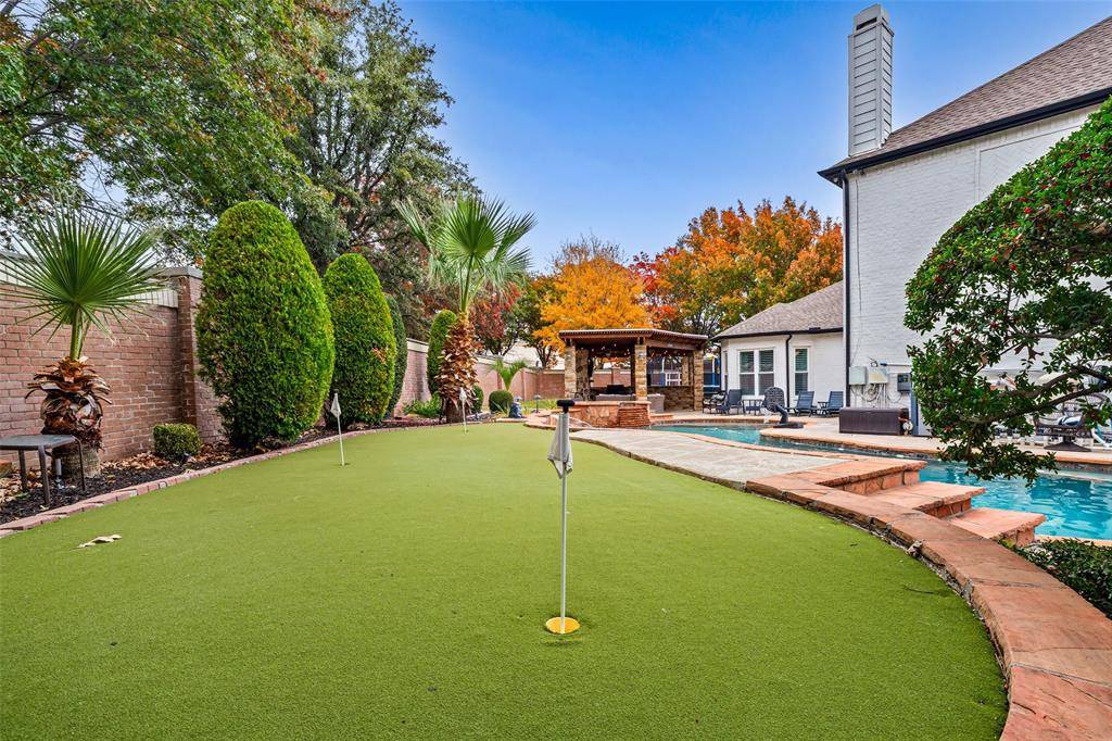 Back yard of your dreams! Back yard boasts oversize lagoon style heated pool with separate spa and waterfall feature. Custom putting green surrounds the back side of pool. Awesome outdoor living room and custom kitchen including speaker system, sink, refrigerator, icemaker, and built in gas grill! As you wrap around the back side of house plenty of patio space for large dining area and additional space for other cooking! Inside doesn't disappoint with 5 bedrooms and 4 full bathrooms. Master has own HVAC system and updated bathroom with large shower and rain shower with body sprays. Huge kitchen island with breakfast area. Living room, separate dining room, office, and another full bedroom and bathroom complete the downstairs. Upstairs has another living area with built in bar area and sink. 3 bedrooms and 2 full bathrooms upstairs with 10 seat stadium seating movie room that you will absolutely love!