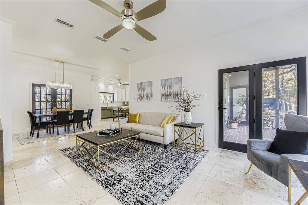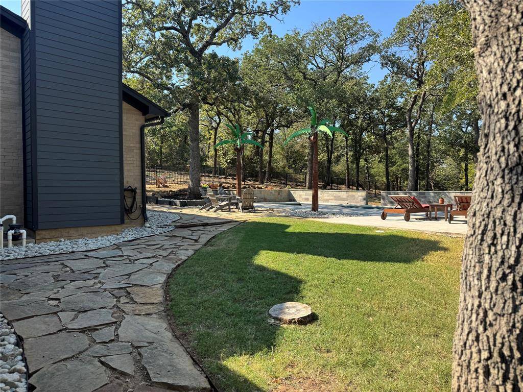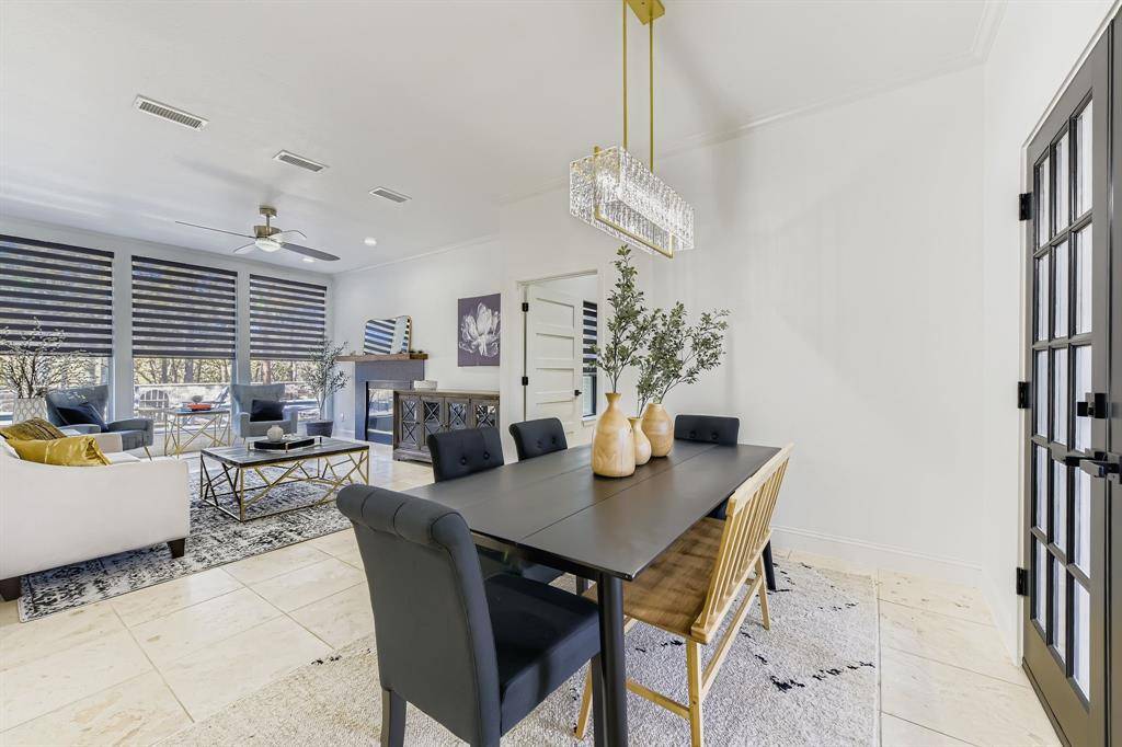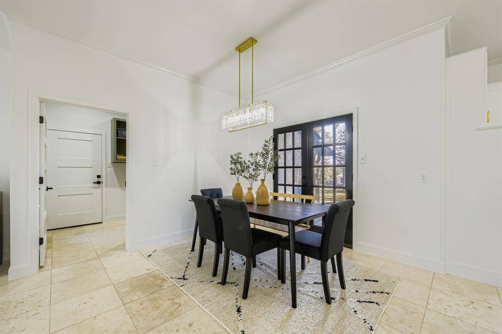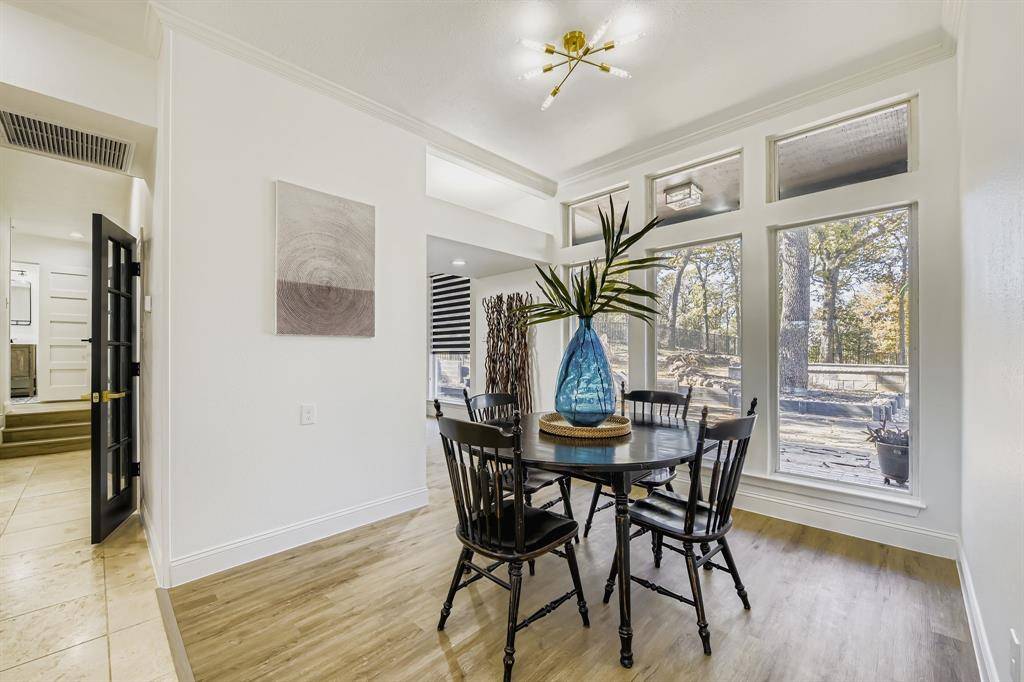 Newly renovated modern contemporary home situated on nearly two acres in Argyle ISD, offering exceptional privacy, peace, and quiet. A long driveway leads to this thoughtfully redesigned residence, featuring brushed gold-toned finishes, clean lines, and a striking see-through fireplace connecting the dining room with wet bar to the master bedroom, creating a unique and elegant focal point. Abundant natural light fills the home, enhancing its modern aesthetic and connection to the outdoors. French doors open to a charming outdoor breakfast nook, perfect for enjoying morning coffee while surrounded by serene natural views. The expansive, tranquil setting provides a rare opportunity to enjoy refined contemporary living with the space and seclusion of acreage.