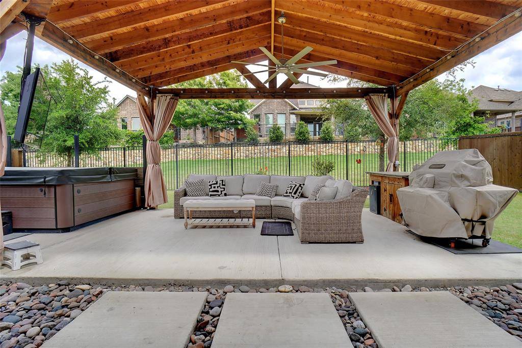 Step outside to your private backyard oasis, complete with a covered patio, outdoor kitchen-entertaining area, and a hot tub (negotiable). A Jellyfish Lighting system—perfect for year-round holiday or mood lighting—is already installed and remotely controlled.