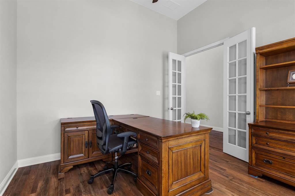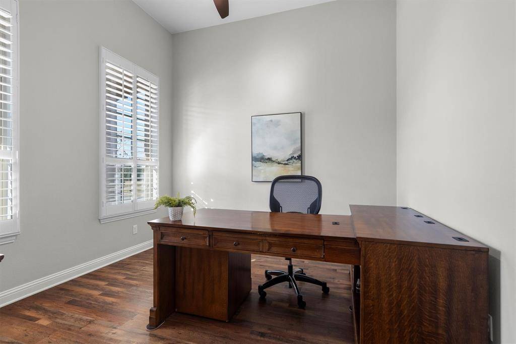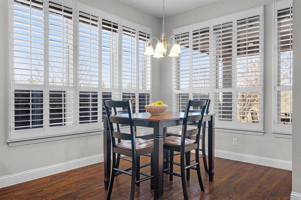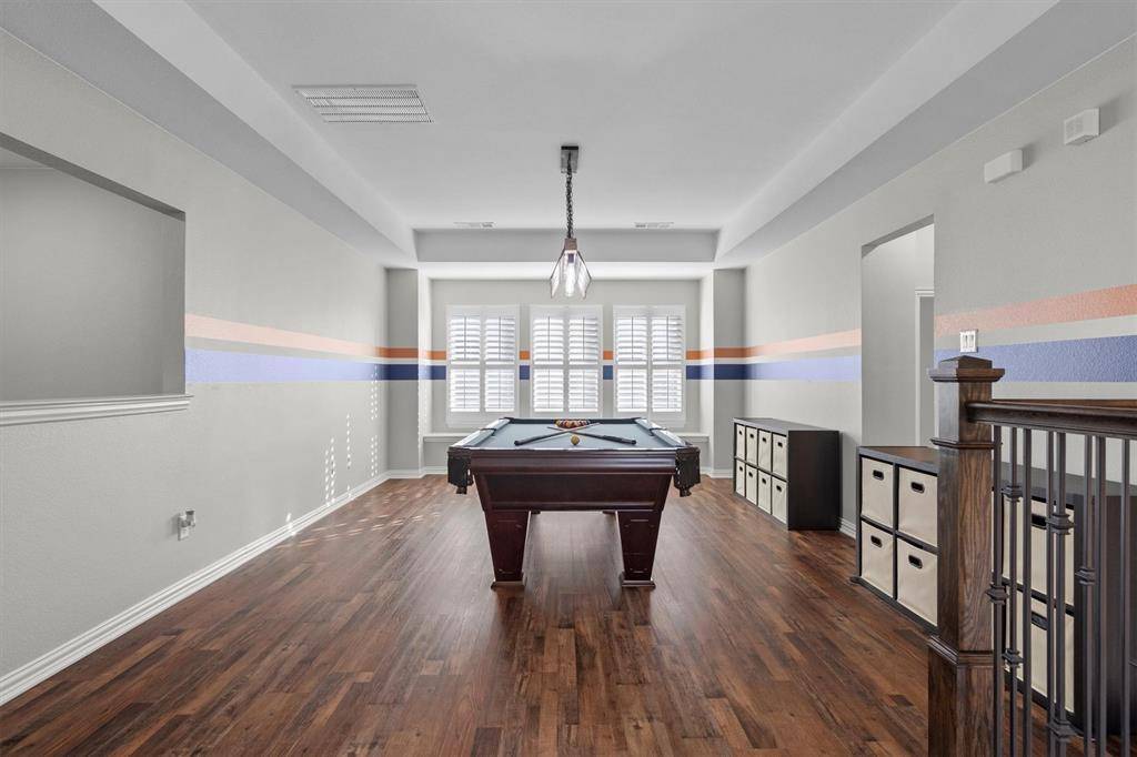 Welcome home! Located in the sought-after Harvest community, this beautiful corner-lot home offers the perfect blend of comfort and convenience. Enjoy peaceful mornings on the inviting front porch before stepping inside to find plantation shutters throughout the home, adding timeless style and privacy. Just off the entry is a quiet home office, ideal for remote work or studying, followed by a formal dining room perfect for intimate dinners and special gatherings. The living room serves as the heart of the home, offering a warm and welcoming atmosphere for everyday living and entertaining. The kitchen is a standout, featuring a massive island with breakfast bar, newly painted built-in cabinetry, hand scraped wood floors, stainless steel appliances, and a dedicated breakfast area for casual dining. The spacious primary suite is a true retreat with gorgeous bay windows and Hunter Douglas cellular shades, creating a serene space to relax and unwind. The ensuite bathroom includes dual sinks, a garden tub, and a luxurious walk-in shower. Downstairs also includes a convenient half bath and utility room. Upstairs, you'll find a large game room complete with a newly installed pool table light fixture, three additional bedrooms, and two full bathrooms, along with new carpentry details that add character and charm. The backyard offers ample space for pets and kids to play, making this home ideal for both entertaining and everyday enjoyment. HOA dues include a basic TV & Internet package. Don't miss the opportunity to call this Harvest gem your own!