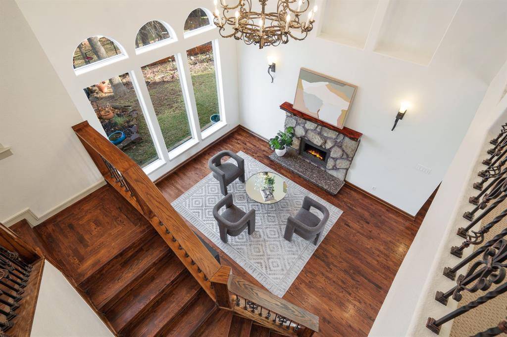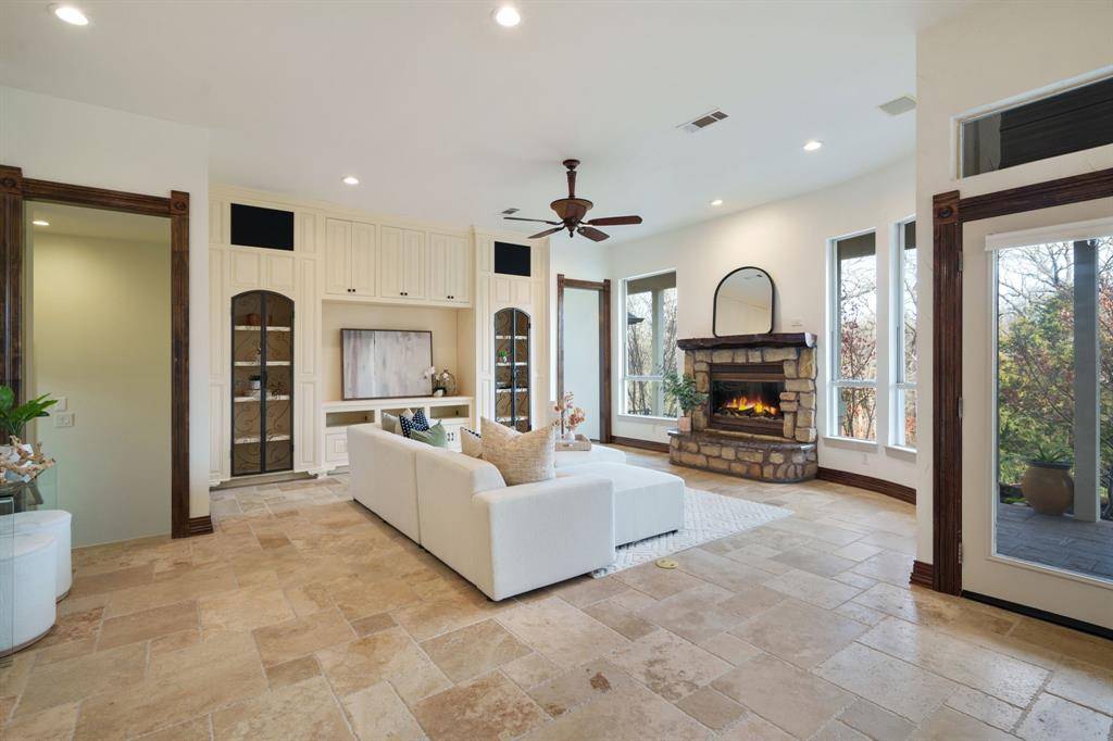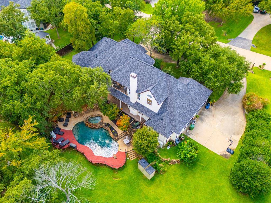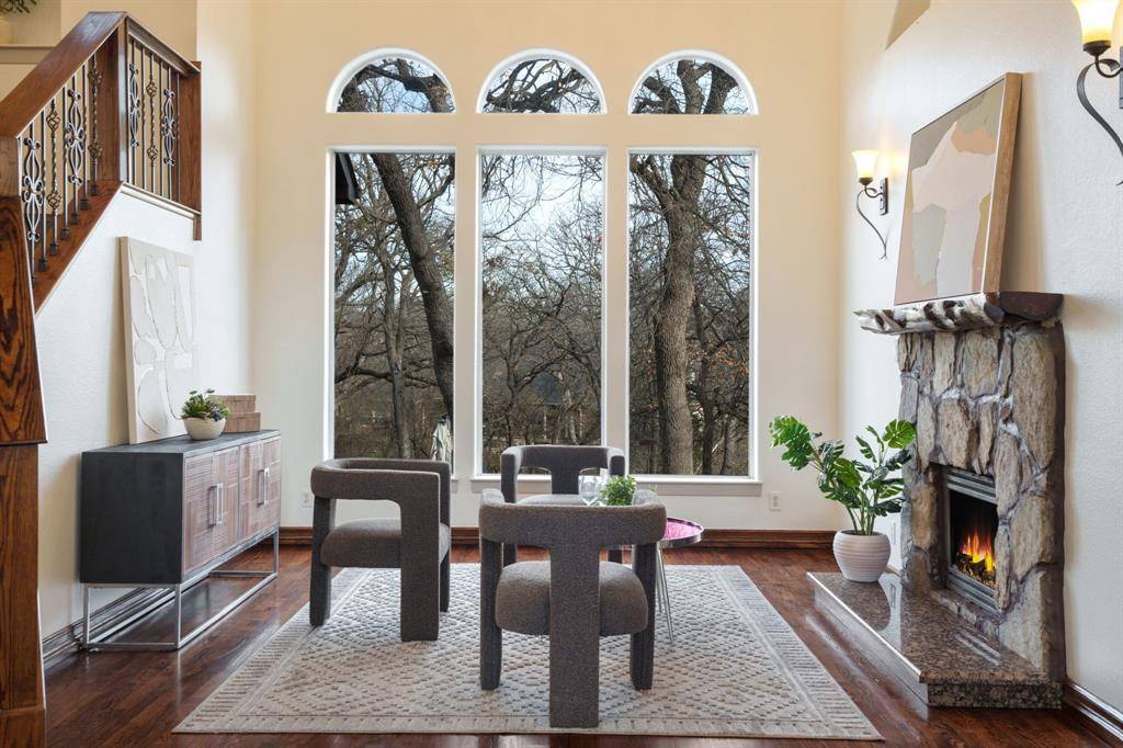 Fresh and NEW for YOU! The property was JUST updated with new interior paint, new carpet and modern lighting fixtures. Be welcomed to a refreshed home in a premier Flower Mound neighborhood. The residence sits on a sprawling, lush lot and is filled with refined details and functional spaces. Inside, you'll find extraordinary architecture, three fireplaces, and soaring ceilings throughout. No details were left behind in the recently remodeled state-of-the-art kitchen boasting luxurious granite countertops and backsplash, stone accents, built-in fridge, wine cooler, and coffee espresso machine. The downstairs primary retreat offers a fireplace, wall of windows with lush views, patio access, a hidden cedar closet safe room, and a spa-like bath with dual vanities and a separate tub. This incredible floorplan boasts a second downstairs bedroom that can be used as a flex space or home gym, an office, formal dining, and den plus spacious family room. Upstairs offers two additional bedrooms with en-suite baths and a massive game room. Step outside and immerse yourself in the private backyard oasis, where there's plenty of room to play, relax, and entertain. This warm welcoming and light-filled residence is a must-see! Thoughtful additions include a large laundry room with sink and laundry chute. Outdoor enthusiasts will appreciate the home's prime location with easy access to Lake Grapevine and the scenic Twin Coves hiking trails, perfect for fishing, kayaking, and exploring nature. Plus, you're only minutes from all the shopping, dining, and entertainment Flower Mound has to offer. Bonus, Tesla charger remaining with the home.