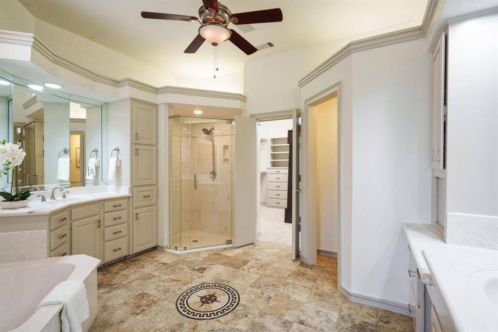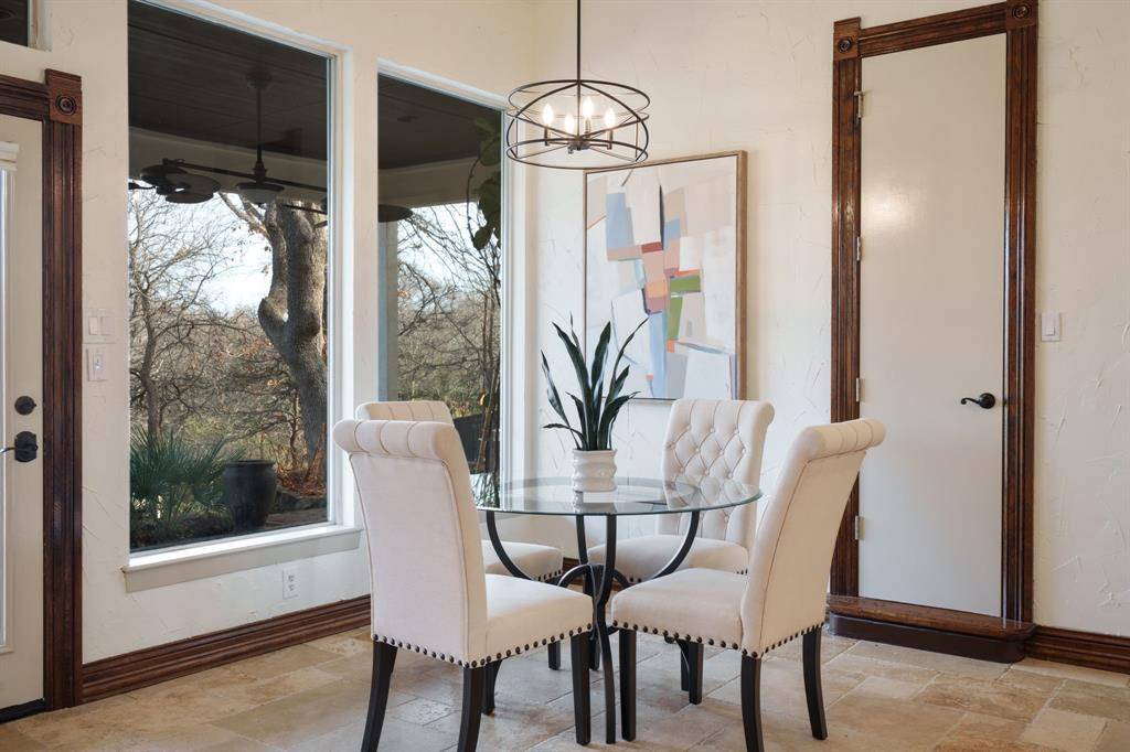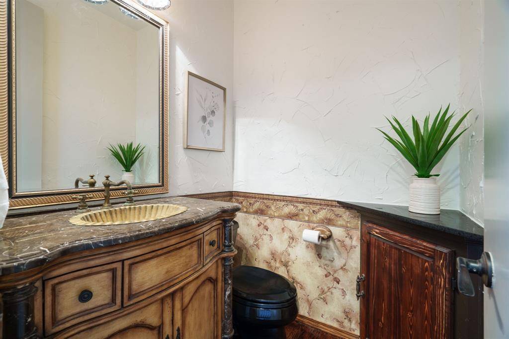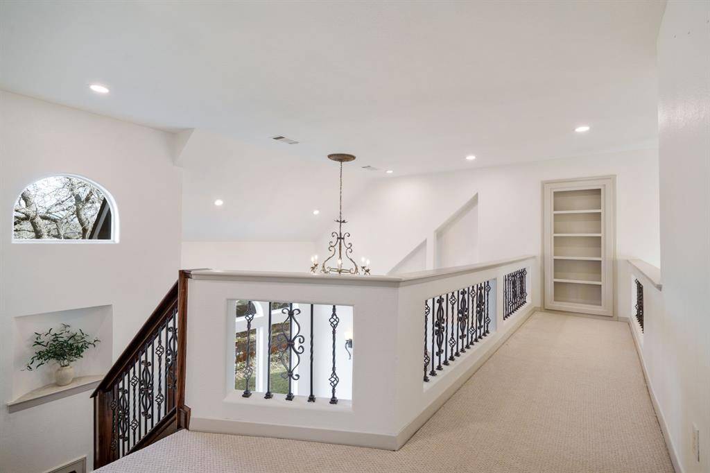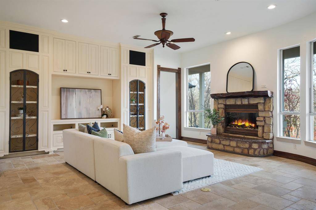Fresh and NEW for YOU! The property was JUST updated with new interior paint, new carpet and modern lighting fixtures. Be welcomed to a refreshed home in a premier Flower Mound neighborhood. The residence sits on a sprawling, lush lot and is filled with refined details and functional spaces. Inside, you'll find extraordinary architecture, three fireplaces, and soaring ceilings throughout. No details were left behind in the recently remodeled state-of-the-art kitchen boasting luxurious granite countertops and backsplash, stone accents, built-in fridge, wine cooler, and coffee espresso machine. The downstairs primary retreat offers a fireplace, wall of windows with lush views, patio access, a hidden cedar closet safe room, and a spa-like bath with dual vanities and a separate tub. This incredible floorplan boasts a second downstairs bedroom that can be used as a flex space or home gym, an office, formal dining, and den plus spacious family room. Upstairs offers two additional bedrooms with en-suite baths and a massive game room. Step outside and immerse yourself in the private backyard oasis, where there's plenty of room to play, relax, and entertain. This warm welcoming and light-filled residence is a must-see! Thoughtful additions include a large laundry room with sink and laundry chute. Outdoor enthusiasts will appreciate the home's prime location with easy access to Lake Grapevine and the scenic Twin Coves hiking trails, perfect for fishing, kayaking, and exploring nature. Plus, you're only minutes from all the shopping, dining, and entertainment Flower Mound has to offer. Bonus, Tesla charger remaining with the home.