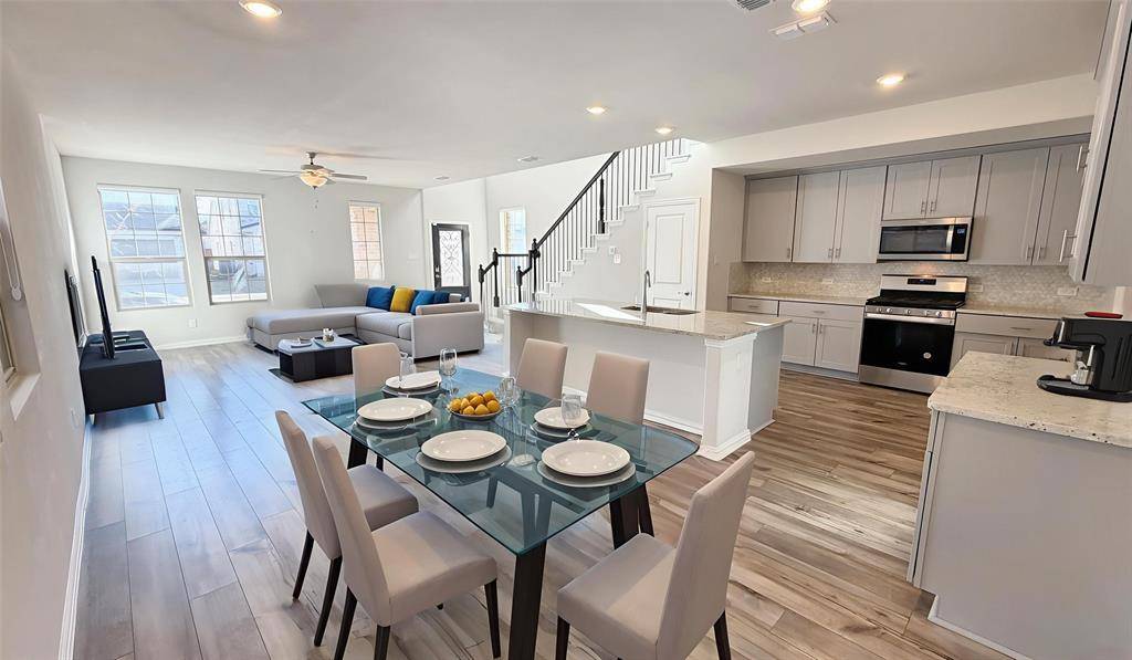 A functional, well-appointed kitchen featuring a center island, built-in microwave, ample cabinetry, and a seamless flow into the dining area perfect for everyday meals and entertaining