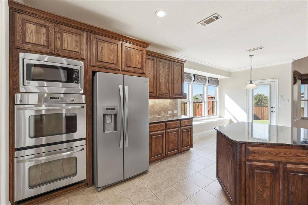 Presenting a distinguished Bud Bartley–built residence offering 4,264 square feet of well-appointed living space on a desirable corner lot. This two-story home features four bedrooms, three and one-half bathrooms, a private study with glass French doors, a bonus room, a dedicated media room, and an additional upstairs living area. The gourmet kitchen is equipped with granite countertops, premium stainless-steel appliances, a gas cooktop, central island, double ovens, a butler's pantry with wine refrigerator, a new microwave, and a breakfast area. Washer, dryer, and refrigerator convey with the property. The open living area offers hand-scraped wood flooring, soaring ceilings, built-in cabinetry, abundant natural light, and a stone gas fireplace. The primary suite, located on the main level, includes an adjacent bonus room suitable for a nursery, home office, or fitness space. Additional features include a freshly painted exterior garage door and an epoxy-finished garage interior. The spacious backyard provides outdoor enjoyment, while the community offers walking and biking trails, playgrounds, and fishing ponds. Conveniently located near Lewisville Lake, area dining, and The Shops at Highland Village. Notable updates include a replaced roof (2017), new fencing (August 2022), upstairs HVAC system (October 2022), and a new downstairs furnace (October 2024).