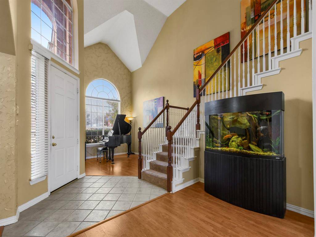 Step into the dramatic foyer that opens to elegant formal living and dining areas. The chef's kitchen features a breakfast bar, center island, gas range and abundant cabinet and counter space - flows seamlessly into the breakfast nook , 2nd stair case, and spacious family room *The family room is highlighted by a stunning two-story fireplace, 22 foot ceilings, wall of windows that floods the home with natural light * Secluded Oversized primary suite is downstairs, includes a sitting area, luxurious soaking tub, separate shower and separate vanities PLUS a 12x11 walkin closet *Downstairs secondary bedroom with bath is an ideal guest or Mother inlaw suite. * Front Grand staircase leds to a beautiful catwalk and three additional oversized bedrooms PLUS a Gameroom *Extra Storage closets throughout * Designer details abound,, including dual staircases, soaring 22-foot ceilings, an elegant catwalk, crown molding, chair rail accents and generous closet space — truly no wasted space * The backyard offers a peaceful setting with a beautiful line of mature trees in the spring.* Upgrades include microwave 2025, water heater 2024, board on board fence 2021, both HVAC units 2016 * Located just minutes from top rated schools and premier shopping, dining and entertainment at the Shops of Highland Village!