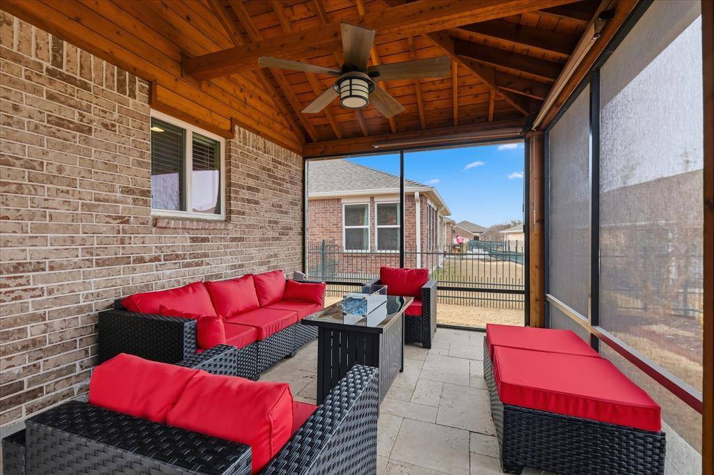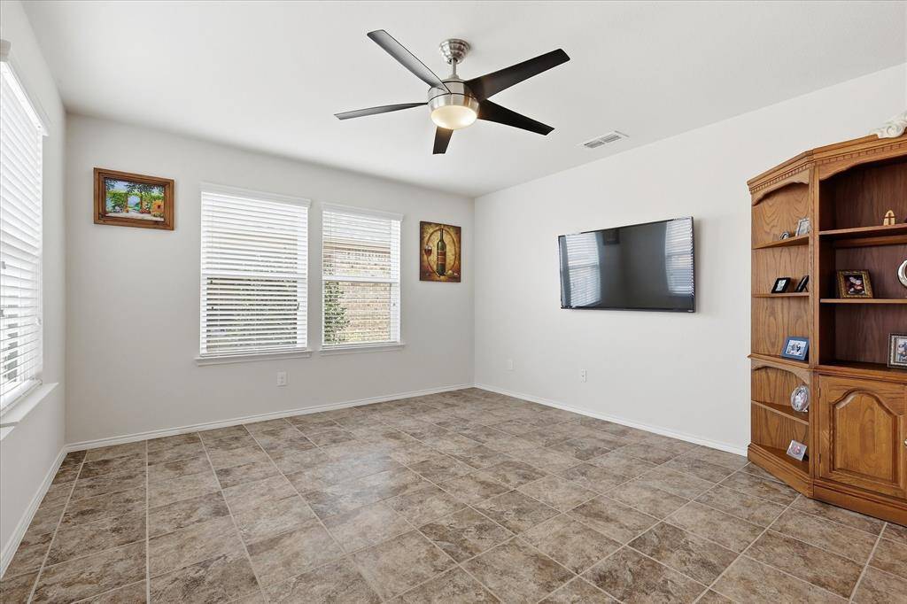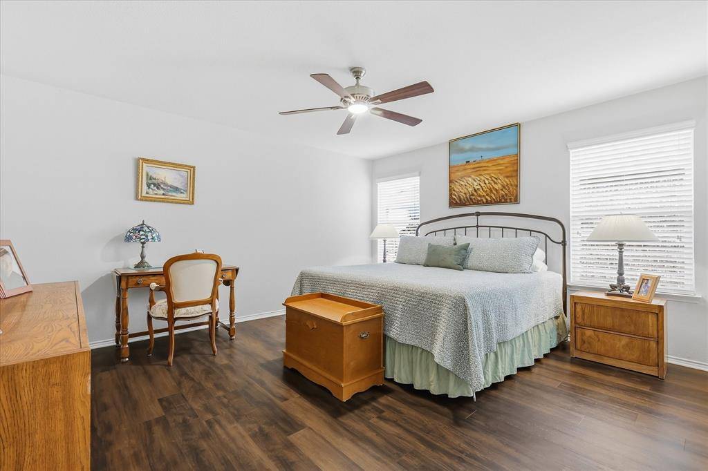 Beautifully maintained Taft Street Model Home in the sought after 55+ Community of Frisco Lakes. This floor plan is open and filled with natural light and offers a built-in sunroom solarium with access to a screened patio, extended patio area and fenced backyard. The kitchen boasts easy to maintain tile flooring, a gas range, ample cabinets, granite counters and a kitchen island. Escape to your primary suite with an ensuite bathroom complete with a walk in shower, walk in closet, dual sinks and ample cabinets. Your office, guest bedroom and bathroom are located at the front of your home for privacy. Wood floors in the Living Room, Bedrooms and Office. Kitchen, Sunroom and Bathrooms have tile floors. Frisco Lakes 55+ community boasts an array of amenities designed to enrich your lifestyle including scenic walking paths, picturesque ponds, pickleball courts and a pristine golf course. Immerse yourself in the vibrant social scene at the amenity centers where endless opportunities for recreation and camaraderie await.