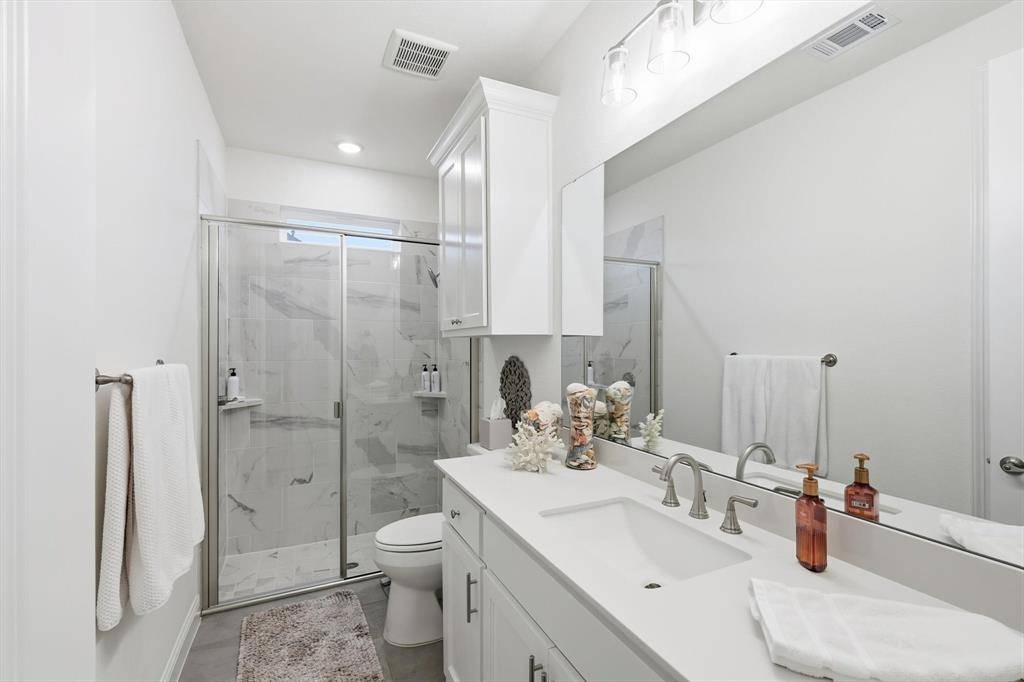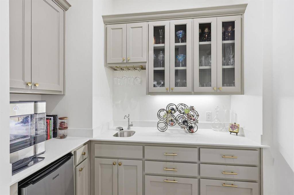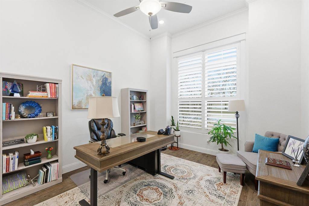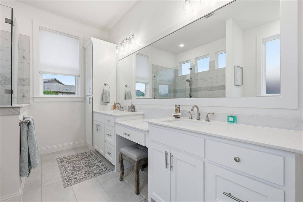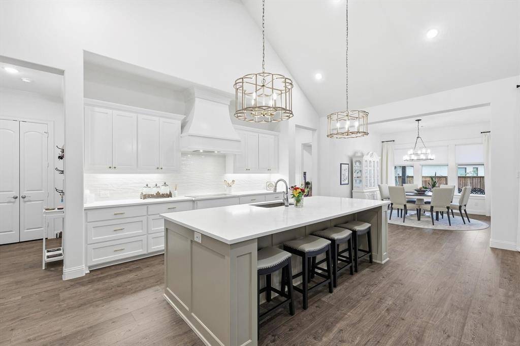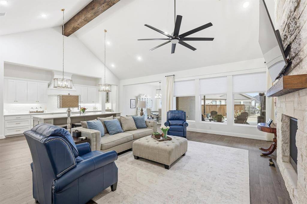 Stunning one-story modern farmhouse showcasing refined luxury and thoughtful design throughout. The expansive open floor plan is anchored by an incredible chef's kitchen featuring a statement oversized island, premium appliances, custom cabinetry and elegant coffee bar, ideal for entertaining and everyday living. Incredible wet bar and butler's pantry with lots of built-in storage, sink and drink refrigerator. Rich wood floors lead through to beautifully appointed living area with lovely fireplace and private study. The home offers 5 spacious bedrooms, including a truly private and luxurious primary suite with spa-inspired bath, upscale finishes, and a serene retreat feel. Incredible laundry room leads directly to primary closet for ultimate convenience, lots of extra storage and room for second refrigerator. This fantastic layout offers so many perks including exceptional storage throughout. Designer lighting, curated finishes and sophisticated decorator touches elevate every space, creating a perfect balance of warmth, comfort and high-end style. Lovely yard with large, covered patio, perfect to enjoy family fun.