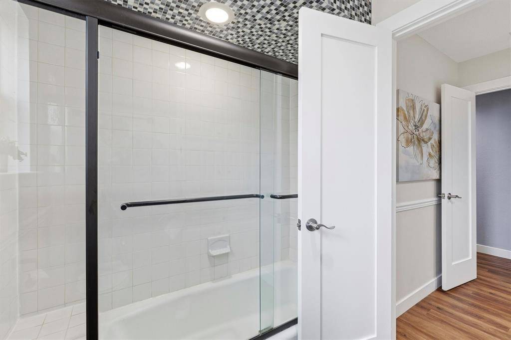 The primary suite is a true retreat, highlighted by dramatic ceiling height, a striking wood-accent feature wall, and direct access to the private fenced patio and backyard — complete with a gate leading to serene creek access. The ensuite bath offers a soaking tub, separate shower, expansive closet space, and dedicated dressing area.