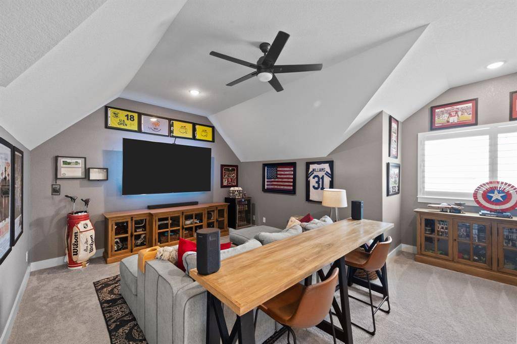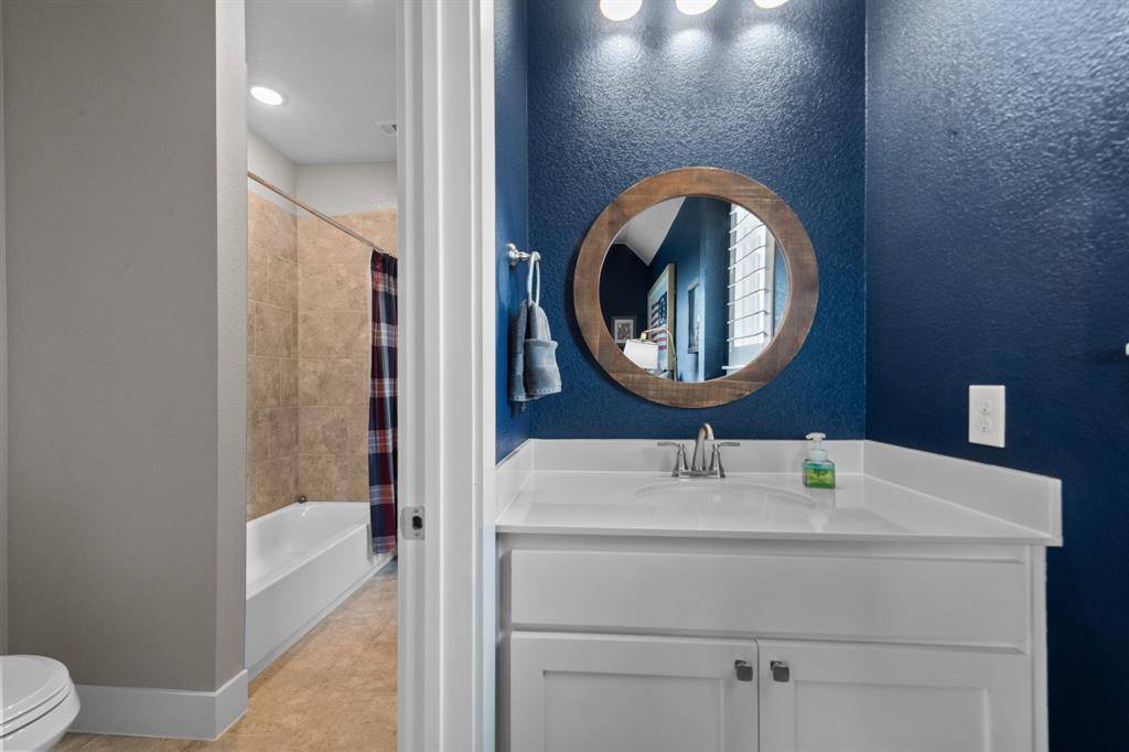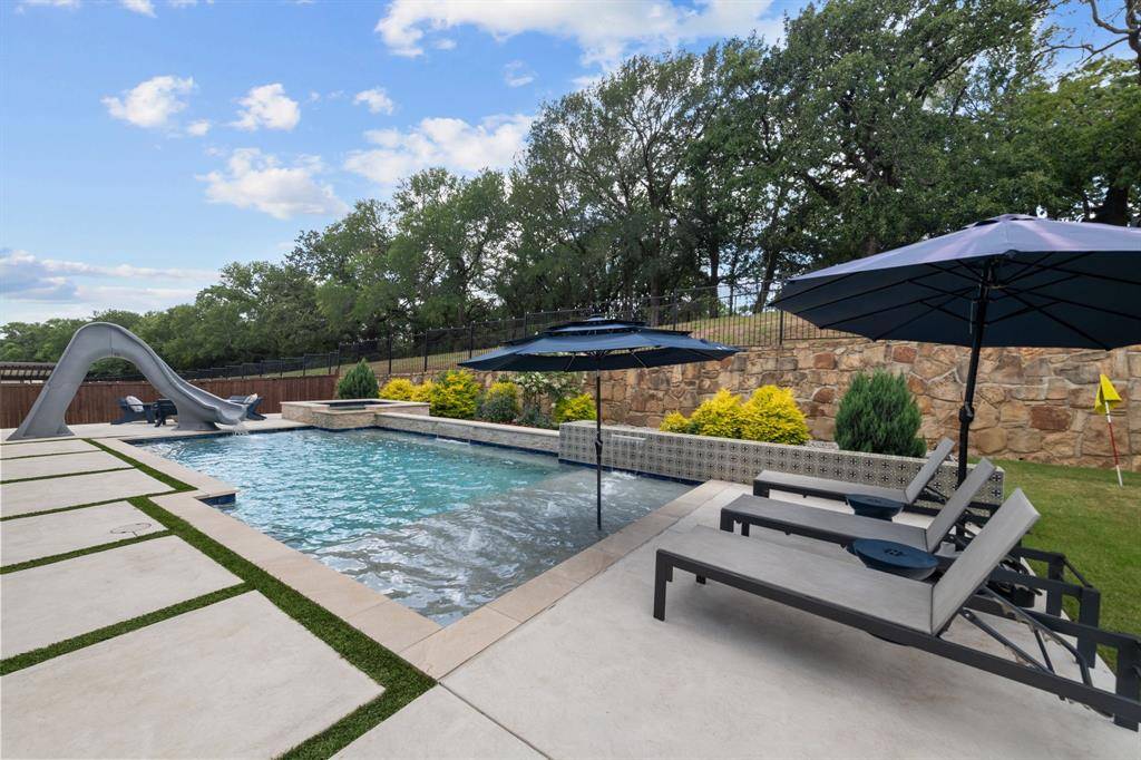 Welcome home to this well-appointed estate in sought-after 5T Ranch, where no detail has been overlooked. Upon stepping in, one quickly realizes there are custom touches throughout the home, from the upgraded kitchen to the resort-style backyard oasis. Moving through the main floor is effortless because of the functional floor plan that flows from the grand two-story foyer to the main living, kitchen, and dining room. Once in the kitchen, the homeowner will enjoy Cafe appliances, an oversized counter-height island, large walk-in pantry, and decorative luxury lighting. From the kitchen, one can enjoy views of the dining room and main living area, with vaulted ceilings, a focal-point fireplace, and a wall of windows overlooking the outdoor living spaces. The primary suite is an escape with board-and-batten wall, views of the backyard, spa-like bath with rainfall shower, soaking tub, and custom closet. Other main floor highlights are a sophisticated study with built-in cabinets and a private guest suite with a walk-in closet. Continuing upstairs, a split staircase will take you to your secluded game room away from the hustle of the rest of the home, and on the other side, you will find two bedrooms with a Jack and Jill bath and walk-in closets. Outside, the designer touches continue with a covered patio featuring an outdoor kitchen with a built-in grill and fridge, which will please any grill master, as well as automatic screens and a large fan to cool off during those warm Texas summers. The backyard pool is the center of the fun, with a hot tub, tanning ledge, waterslide, and water feature all overlooking the community walking trail with large trees. This property has so many designer upgrades, it is a must see!