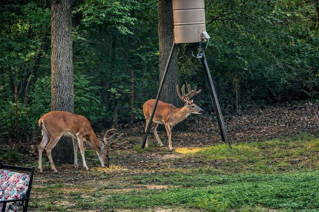 Nestled on a beautifully wooded .67-acre corner lot in the private, gated community of Corinth Forest, this custom two-story home offers exceptional privacy and refined comfort. Featuring 4 bedrooms, 2.5 baths, and a striking 14-foot wood-beamed office that can serve as a fourth bedroom, the home showcases thoughtful design throughout, including a split-bedroom layout, walk-in closets, solid core 10-foot doors, ceiling fans, breakfast bar, and abundant built-ins. The first floor is enhanced by custom decorative stamped and stained concrete flooring, detailed crown molding, and 6-inch baseboards. A dramatic 22-foot vaulted living room with two-story plantation shutters frames breathtaking views of the covered two-tier deck and adjoining Army Corps of Engineers wooded property. The backyard is a true retreat with a trellis, pond and fountain, winding flagstone path, and attached stone fire pit, all backing to Veal Branch Springs Creek just steps away as it flows toward Lewisville Lake. Residents enjoy neighborhood amenities including a private stocked fishing pond with lighted fountain, pool, tennis and basketball courts, and park areas. Modern conveniences include hardwired Cat-7 fiber internet with 2GB capability, wireless access points, multi-camera monitored security, voice-controlled multi-room media, WiFi lighting, Alexa integration, Google Nest thermostats, and three HVAC systems (including new upstairs unit in 2024). Additional updates include fresh paint (2026), new plush carpet in the primary suite (2026), and complete aerobic septic system component replacements (2022–2024). A 250-gallon propane tank services the custom cast stone gas fireplace, water heaters, and gas dryer. The oversized 3-car garage features insulated steel-back doors for climate moderation and ample space for a boat or workshop. An irrigation system completes this exceptional property surrounded by abundant wildlife and serene natural beauty.