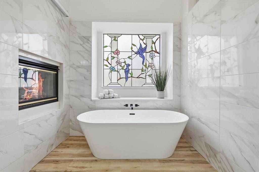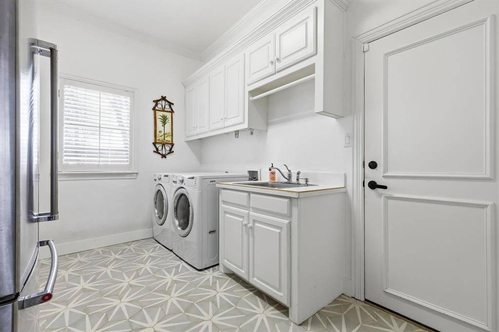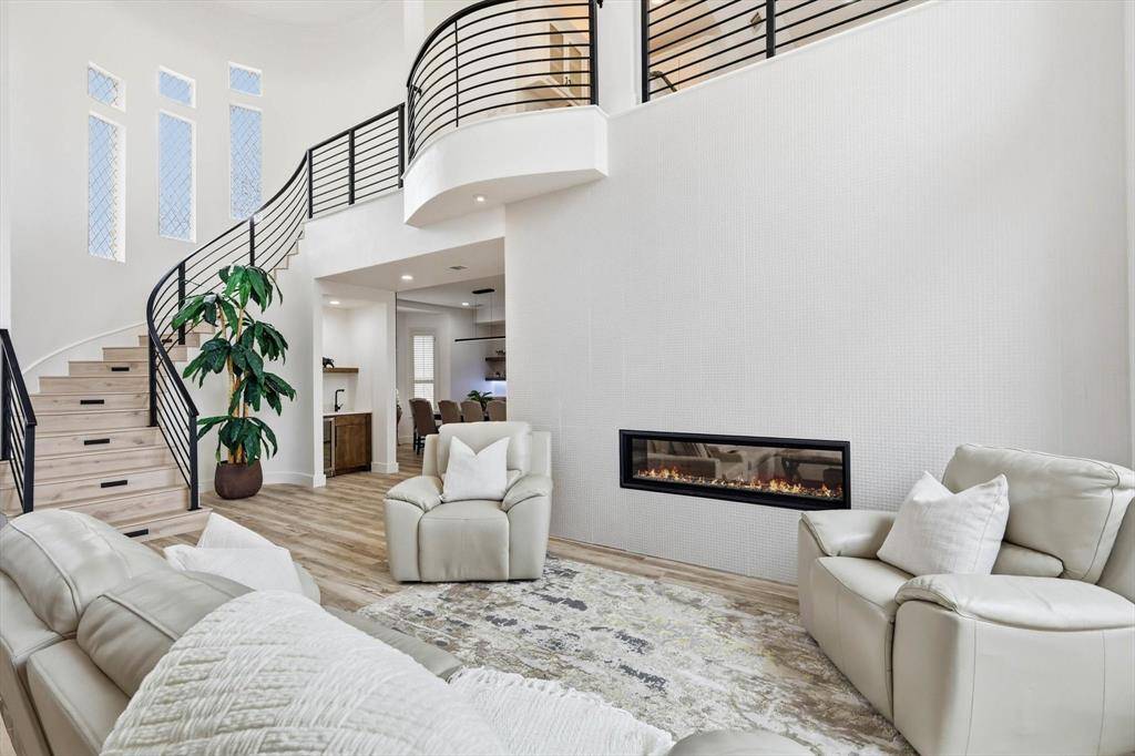 The home offers 5 bedrooms. Walk-in closets are featured in 4 bedrooms and 3 private en-suites. Motorized window shades, tasteful designer lighting, a hidden dining-room door, two double-sided fireplaces, a spacious laundry room, and a luxurious primary bath elevate the home even further. Expansive living areas, a sophisticated modern aesthetic, and a striking iron pivot front door create a home that feels both refined and unforgettable. The interiors reflect thoughtful, substantial renovations rather than surface-level updates.