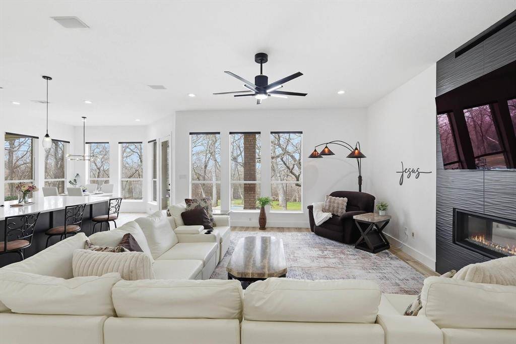 A rare offering in the Peninsula at Twin Coves! This extensively remodeled modern residence sits on a beautifully wooded one-acre lot with direct back-gate trail access to Grapevine Lake.