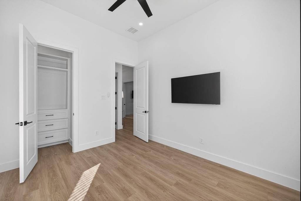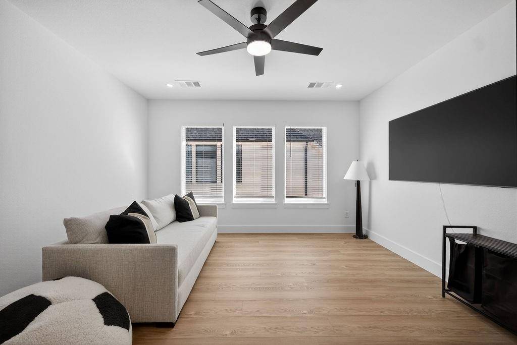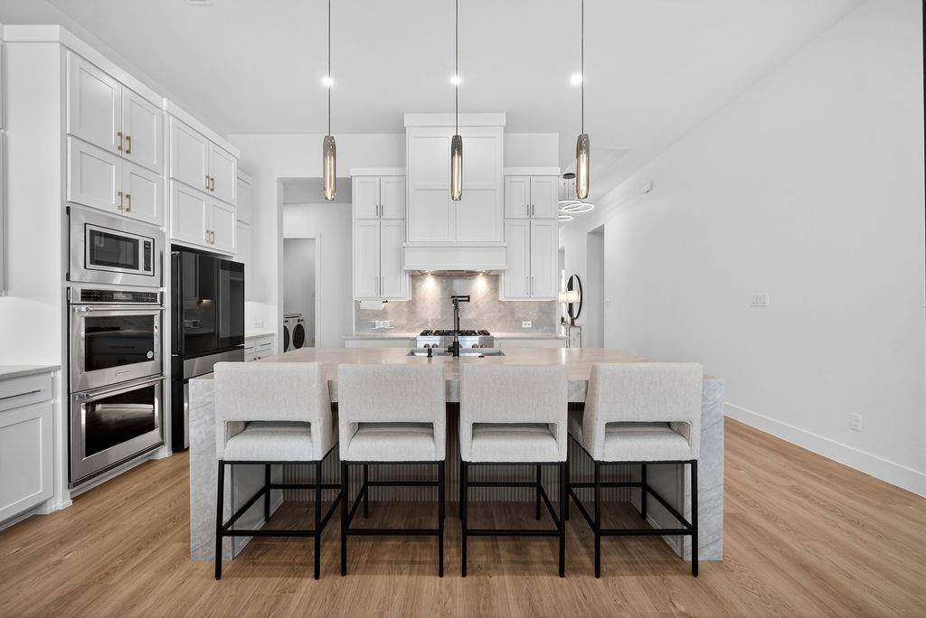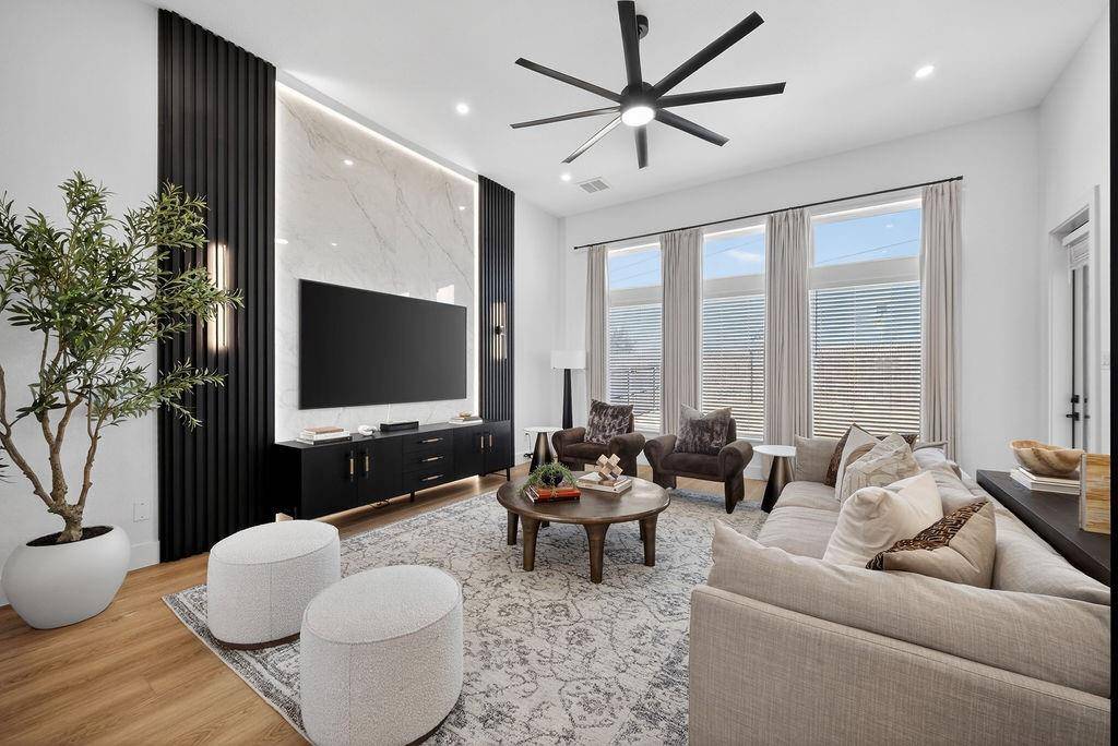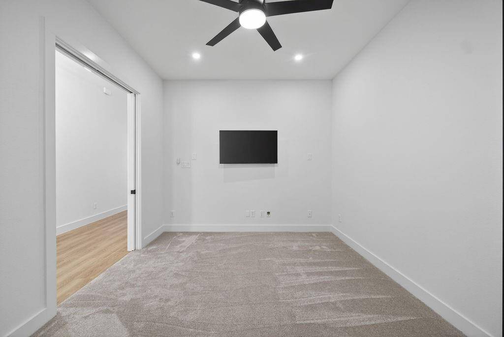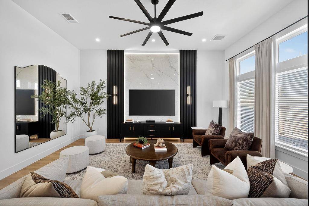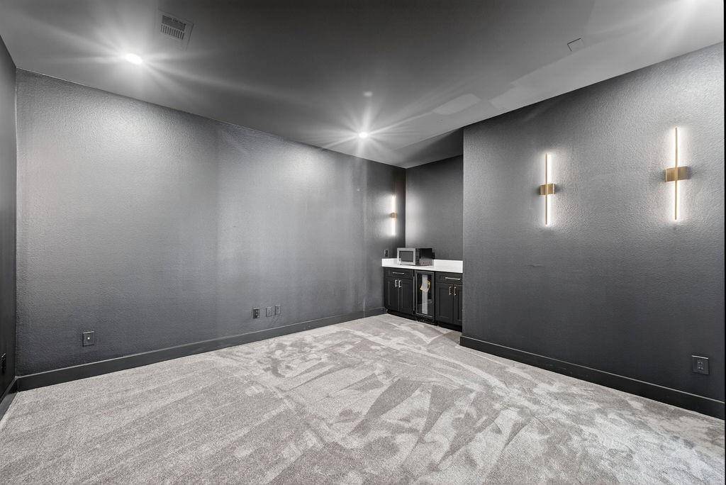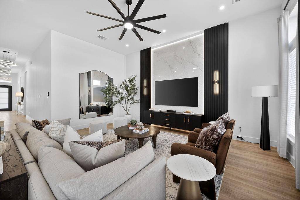 Recent renovations include fresh interior and exterior paint, brand-new flooring throughout, remodeled bathrooms, custom closet systems in every closet, expanded primary closet, and upgraded lighting fixtures throughout the home. The kitchen features a quartz waterfall island and pot filler. The living room has been redesigned with a custom accent wall, and the media room includes a newly added dry bar.