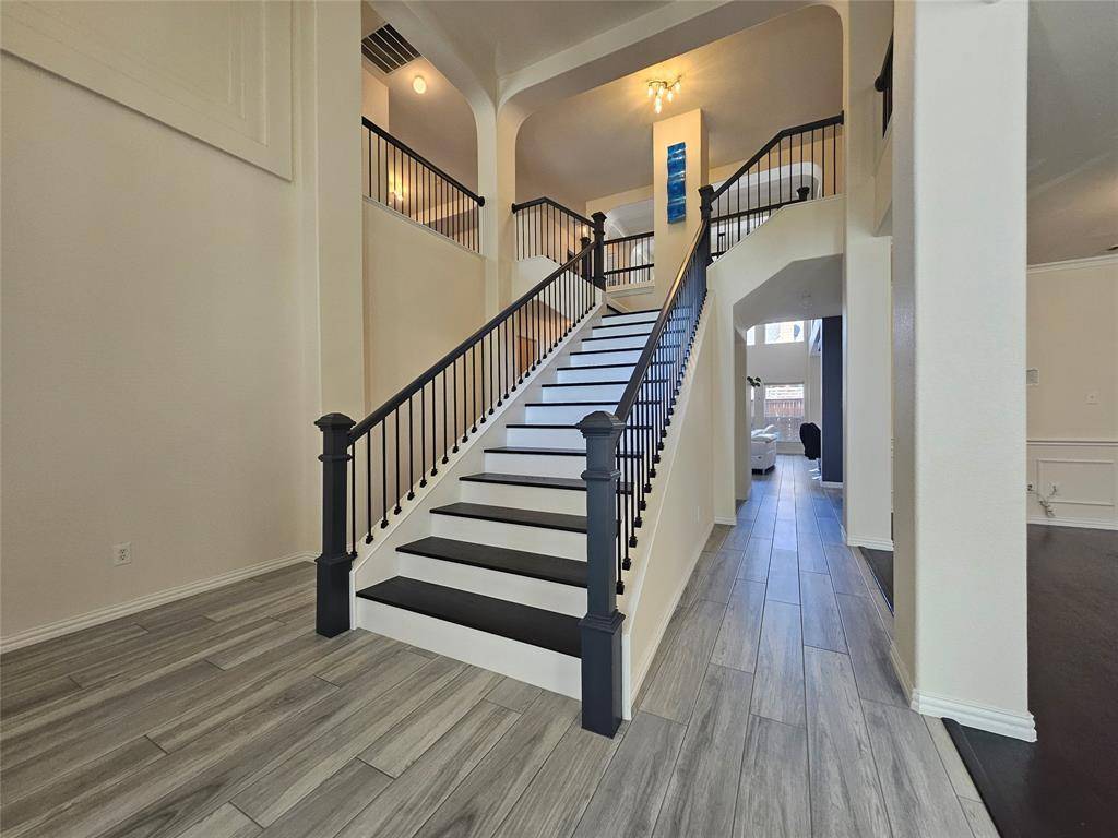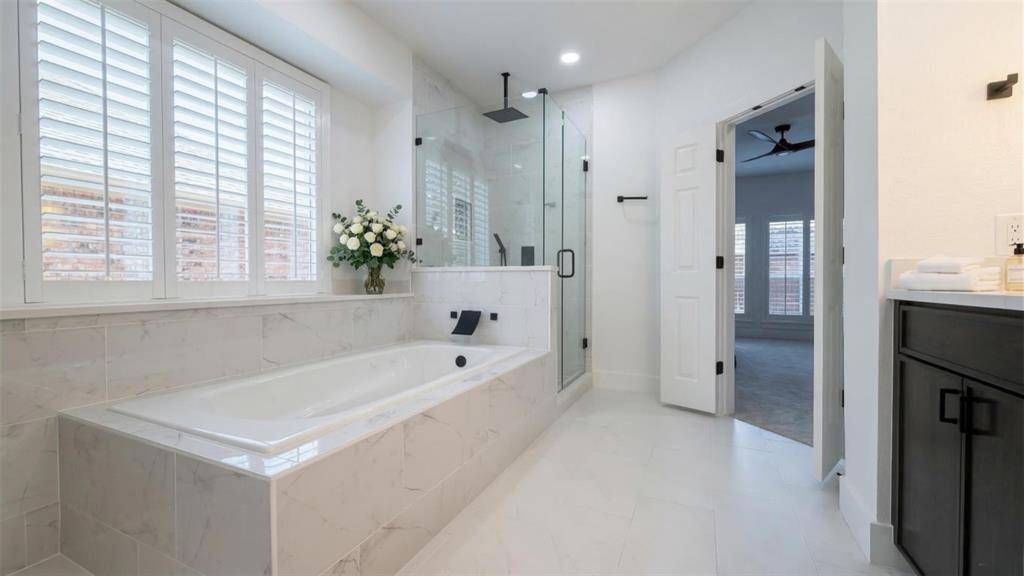 This 5-bedroom, 3.5-bath brick home offers modern luxury, great curb appeal, and landscaped lawn. The expansive open-concept interior boasts soaring ceilings and high-end finishes, creating a warm, sophisticated atmosphere ideal for both quiet evenings and grand entertaining. The interior of this home continues the theme of modern elegance with a light-filled, open-concept floor plan featuring sleek gray tile flooring and a sophisticated neutral palette. Highlights include a chef-inspired kitchen with high-gloss cabinetry and oversized kitchen island, seamlessly flowing into a dramatic living area anchored by a striking fireplace, windows from the floor to the ceiling, and an overlooking balcony. The spacious primary suite serves as a private retreat, complete with its own integrated electric fireplace set in marble-style tile and a ceiling fan for year-round comfort. Experience ultimate relaxation in the primary bath, which boasts a deep soaking tub surrounded by elegant marble-patterned tiling, a frameless glass-enclosed rainfall shower, and chic black hardware finishes. Step outside to your own private oasis, featuring a sleek custom-designed pool with integrated steps and a modern, low-profile aesthetic. The backyard retreat is accented by a stacked-stone water feature wall topped with three elegant scupper bowls, creating a tranquil atmosphere perfect for relaxation. Enclosed by a high-quality privacy fence, this space offers a sophisticated outdoor setting for entertaining or quiet afternoons by the water.