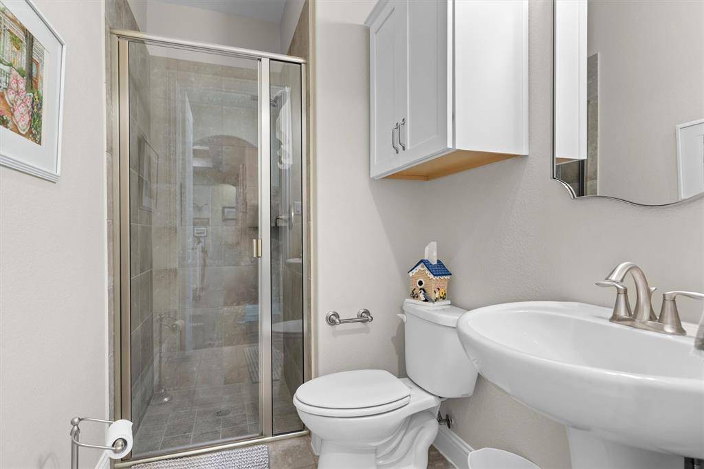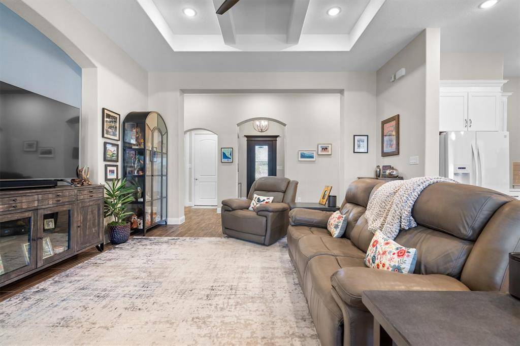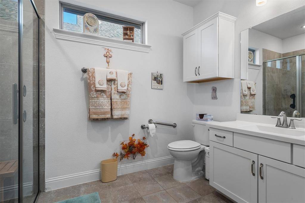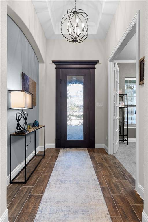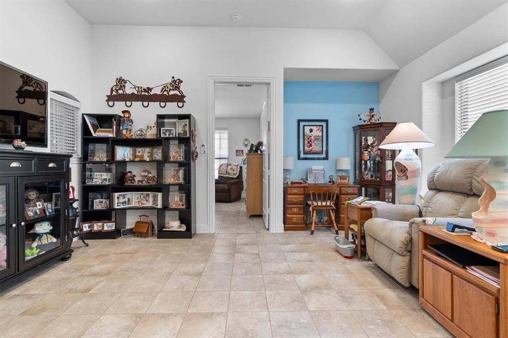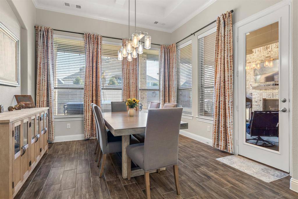 Luxury and flexibility meet lifestyle in this masterfully customized Coventry home in the award-winning Harvest, zoned to the highly acclaimed Argyle ISD. Situated on a premium corner lot, this 1-story striking brick residence offers 3,474 square feet designed for true multi-generational living. A gated 22x20 courtyard with wrought iron detail creates a grand yet welcoming entrance, with separate access to the private next-gen wing. The standout feature is a private wing complete with its own kitchen, living area, bedroom with ensuite bath and walk-in closet, private laundry, dedicated front entrance, and direct backyard access, ideal for extended family, guests, or a private retreat. Inside the main wing wood-look porcelain tile floors lead to a refined executive study behind French doors and a stunning living room anchored with a stunning coffered ceiling, and a wall of windows overlooking the outdoor living space. The chef's kitchen impresses with quartz counters, glass subway tile backsplash, double ovens, 5-burner gas cooktop, an under counter ice maker and a walk-in pantry, all open to a versatile dining area. The primary suite features quartz vanities, an oversized tiled shower, and a spacious walk-in closet. Two additional bedrooms and baths with the larger fourth bedroom with double doors, perfect as a game or media room, bring the total to four bedrooms and four baths. Enjoy year-round entertaining on the 30x20 covered outdoor living area with gas fireplace, dual fans, and gas and water connections ready for your future outdoor kitchen. A 3-car side-entry garage with epoxy floors adds both functionality & polished appeal. Harvest offers a true lifestyle experience with scenic parks, miles of trails, a community pavilion, fitness amenities, gardens, and engaging neighborhood events that foster connection and community. This is more than a home, it's a rare opportunity to enjoy privacy, versatility, and resort-style living all in one extraordinary property.