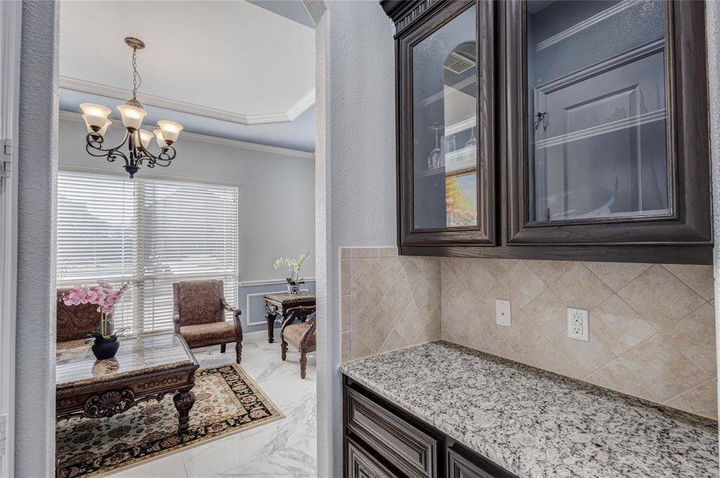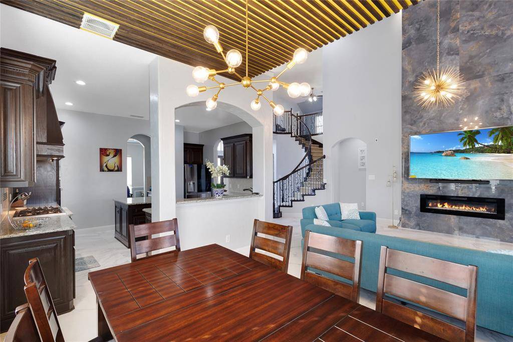 This expansive 5-bedroom, 4-full-bath home showcases sophisticated design and upscale finishes throughout. The show-stopping kitchen is a chef's dream, featuring premium stainless-steel appliances, a 5-burner gas cooktop, double ovens, granite countertops, a large center island, and custom cabinetry with crown molding. A refined casual dining area offers serene views of the backyard oasis and sparkling pool.