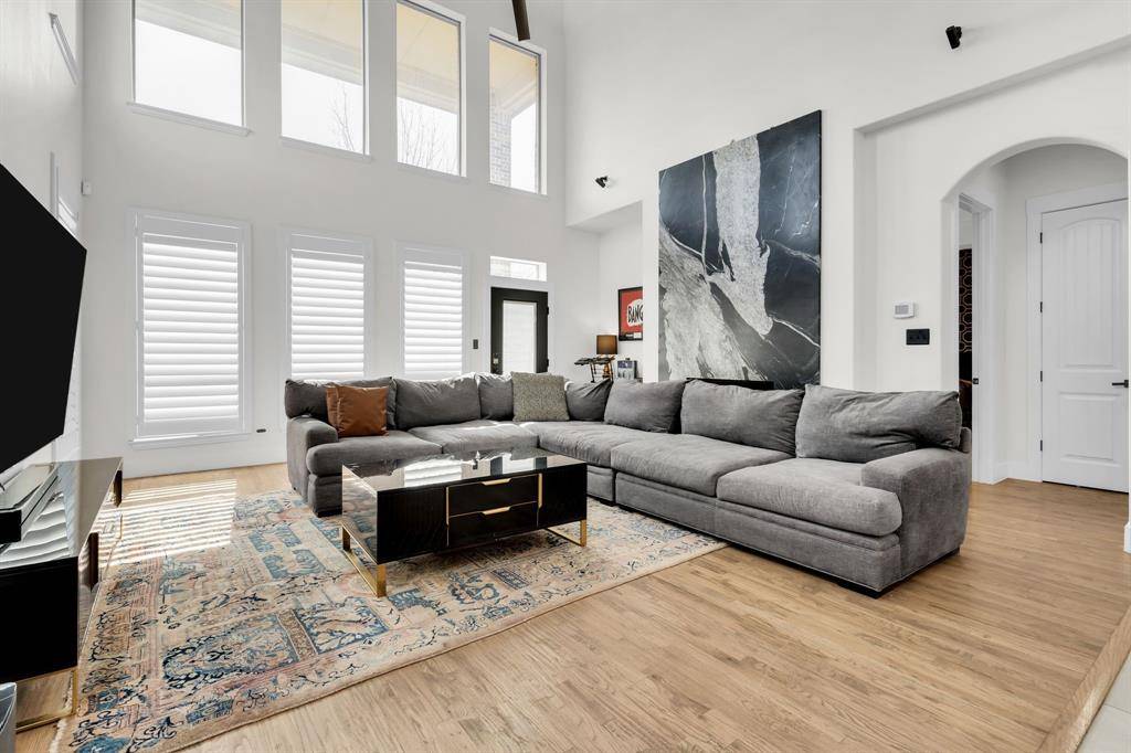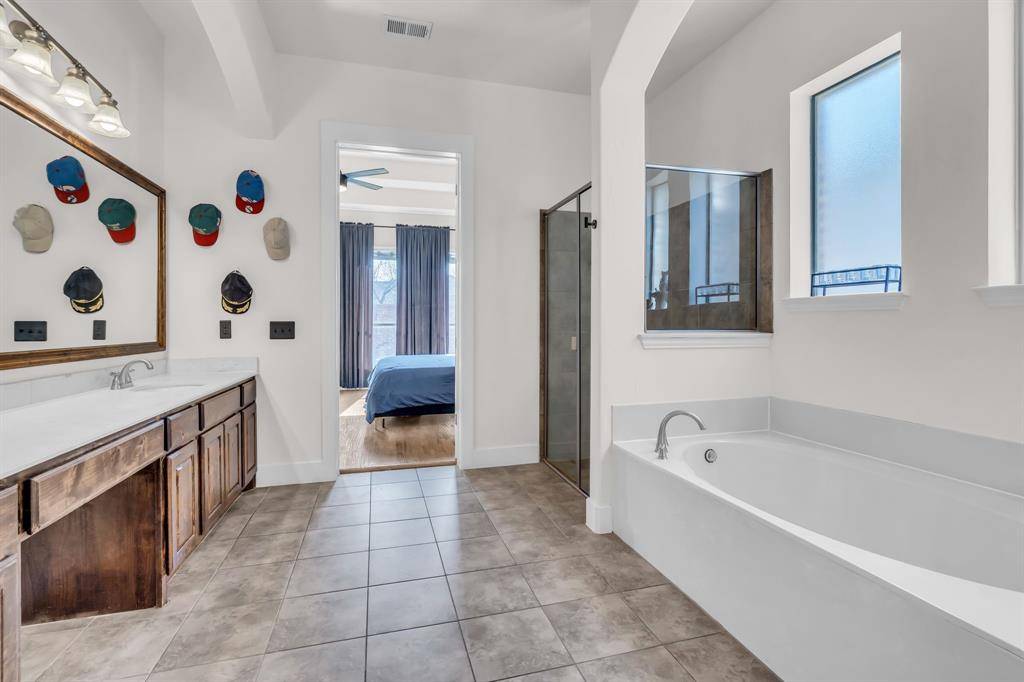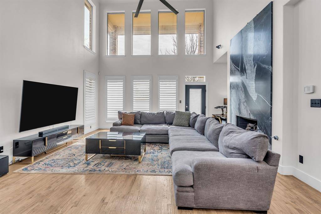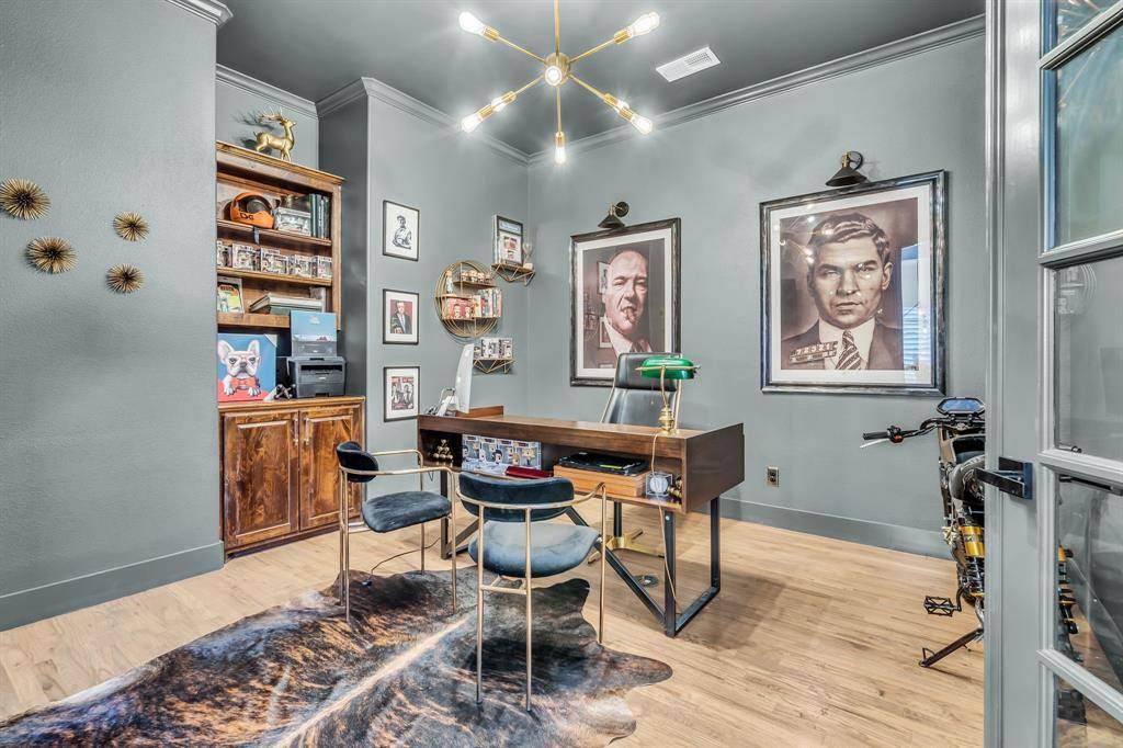 The living room features soaring ceilings and a striking granite fireplace that anchors the space with warmth and style. Plantation shutters throughout the main level, while the dedicated office with glass door entry and moody designer paint creates a sophisticated work-from-home retreat. The primary suite is privately situated on the main level and delivers a true spa inspired experience with dual separate sinks, a garden tub, and a separate shower. Upstairs, you'll find plush carpeted bedrooms, a spacious loft with custom built-ins, and media room perfect for movie nights or game days. The expansive laundry room includes built-in cabinetry and even a pet wash station for added convenience.