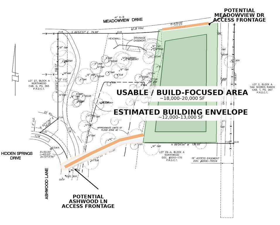 Rare opportunity to purchase a corner homesite in the established Corinth Northwood neighborhood with frontage along both Meadowview Dr and Ashwood Ln. This property offers a unique combination of privacy, mature trees, and flexibility for a future custom build. Marketing materials include an estimated usable, build-focused area and an estimated building envelope to help buyers better understand the site layout and potential access frontage. Potential driveway access may be feasible from Meadowview Dr and or Ashwood Ln, subject to city, engineering, and contractor approval. Ideal for buyers seeking a distinctive homesite rather than a standard interior lot. Survey available. Buyer to verify all information, including setbacks, easements, access, floodplain, buildability, and development requirements.