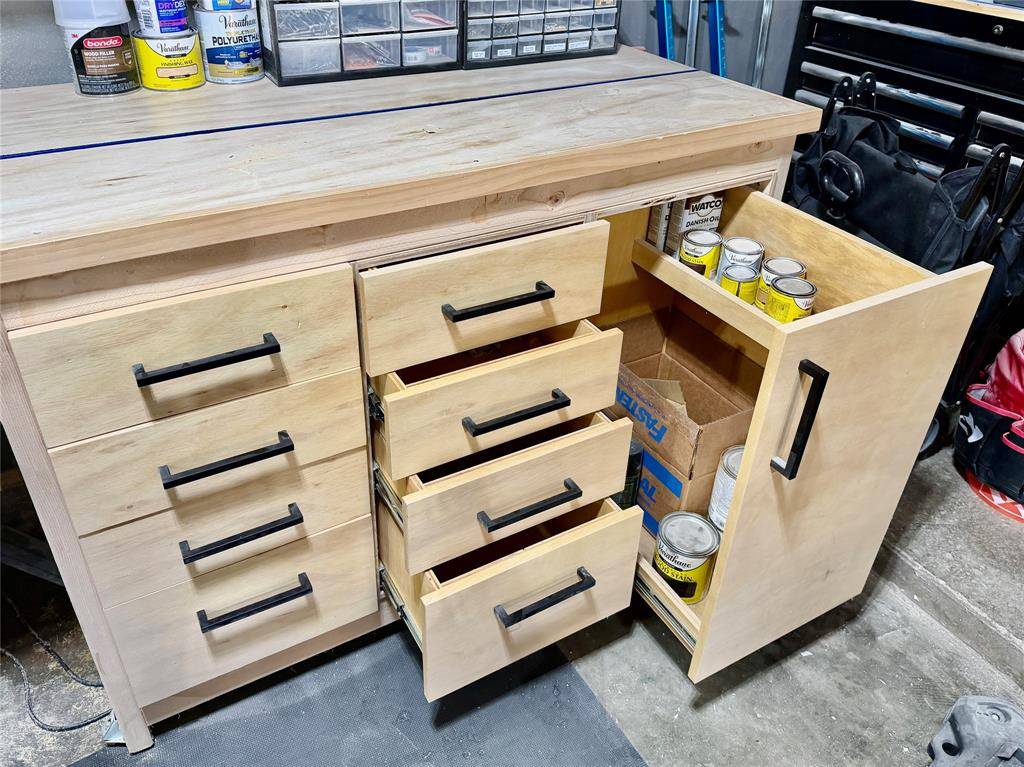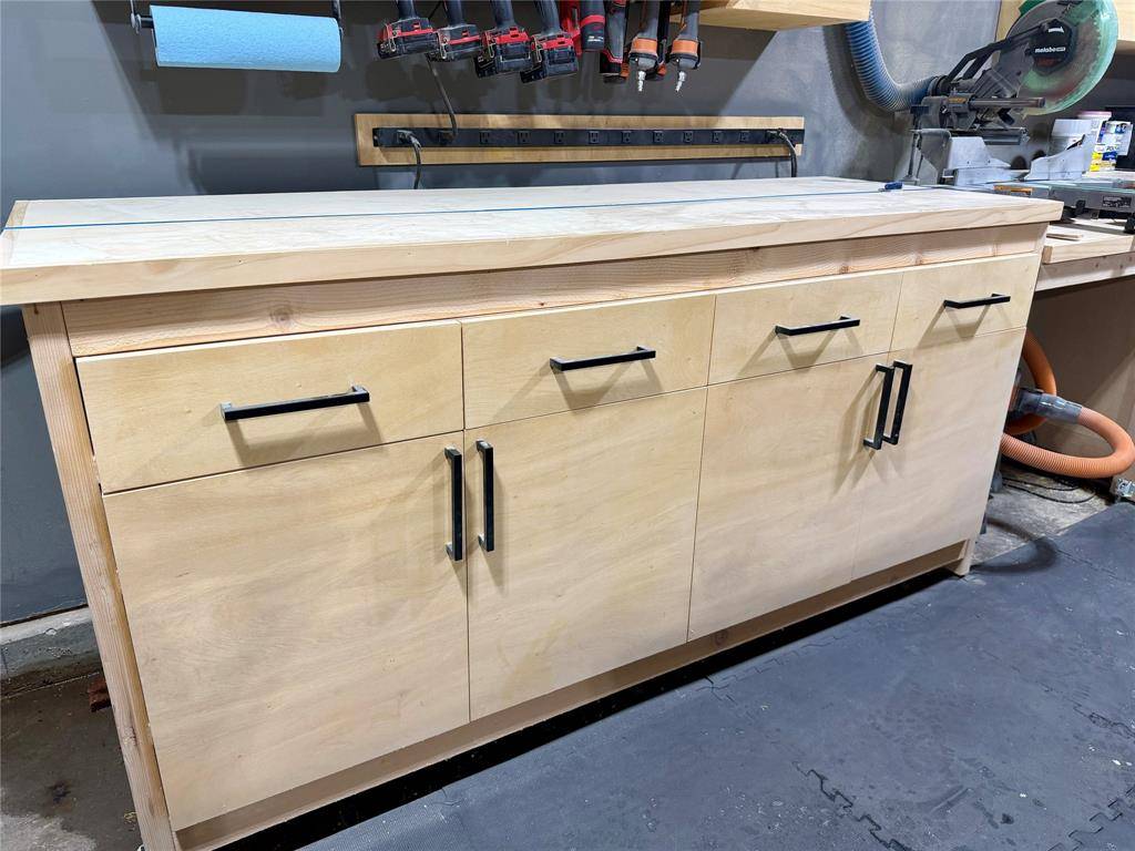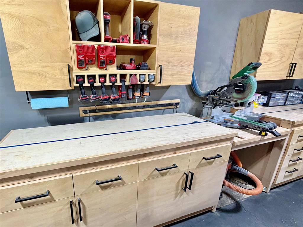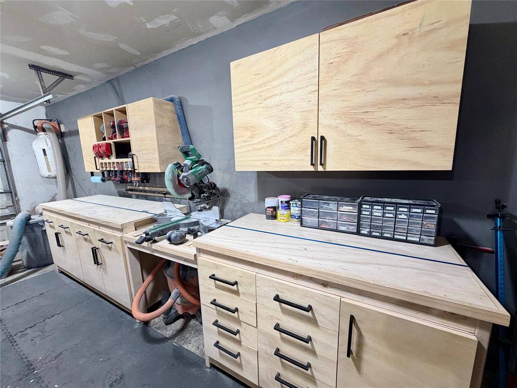 And the craftsmanship continues beyond the kitchen. The garage features an incredible set of custom handmade cabinets as well, designed for woodworking, gardening, automotive projects, or organized storage. These custom garage cabinets are built to last and will remain with the home, offering a rare level of functionality and value.