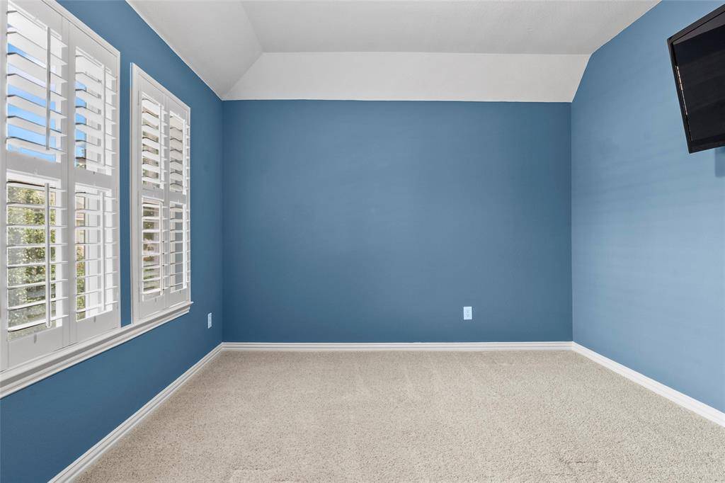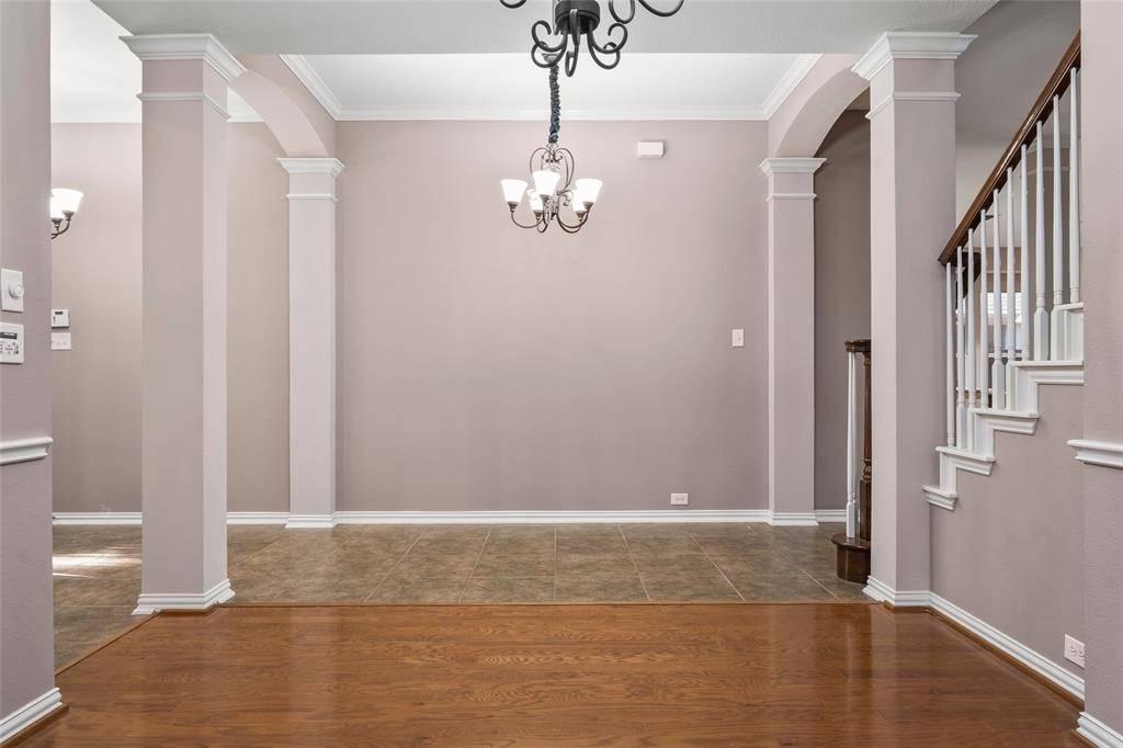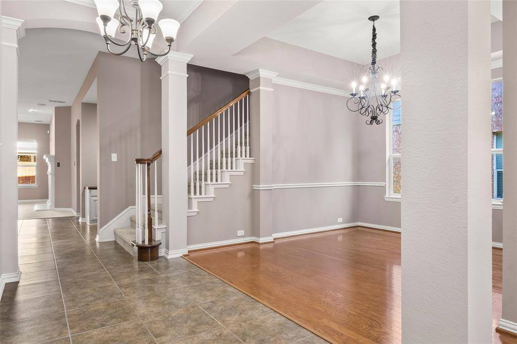 The elegant dining room highlights tray ceilings, crown molding, and a chandelier, creating a beautiful setting for hosting dinners. The deluxe eat-in kitchen is truly the heart of the home, featuring granite countertops, a large island with pendant lighting, 42-inch cabinetry and GE Profile appliances including a convection double oven, built-in 5-burner gas cooktop, microwave, and dishwasher and a pantry complete this well-designed kitchen. One of the most unique features of this home is the two primary en-suite bedrooms, one downstairs and one upstairs. Each offers a garden tub, separate shower, and walk-in closet, making it perfect for guests or an older child wanting their own private retreat. Enjoy movie nights in the media room with surround sound, complete with an 80-inch screen TV and deluxe theater seating. There is crown molding, a 7-room sound system including garage and patio, multiple ceiling fans, a grand entryway with a wood staircase, and an oversized patio perfect for outdoor entertaining.