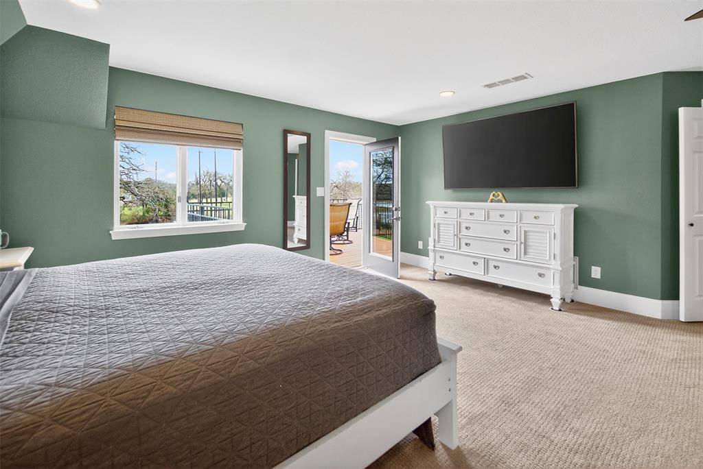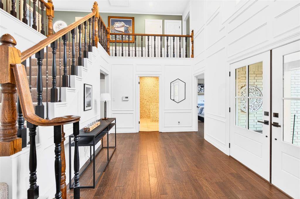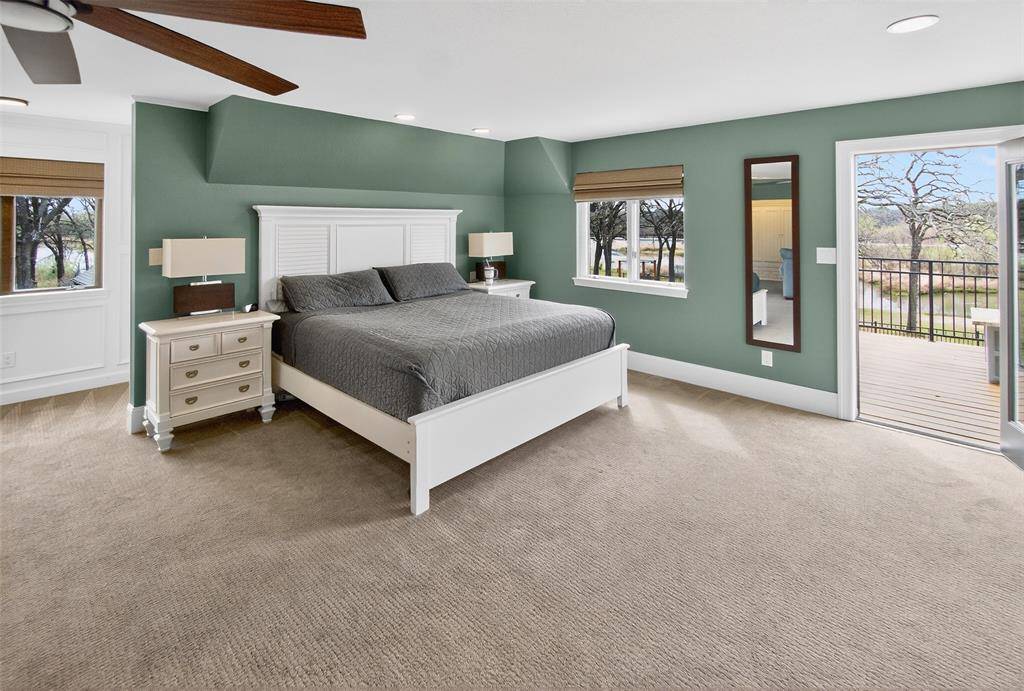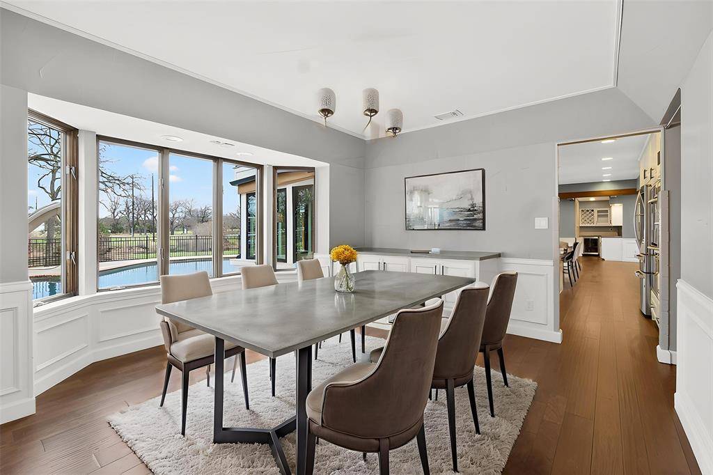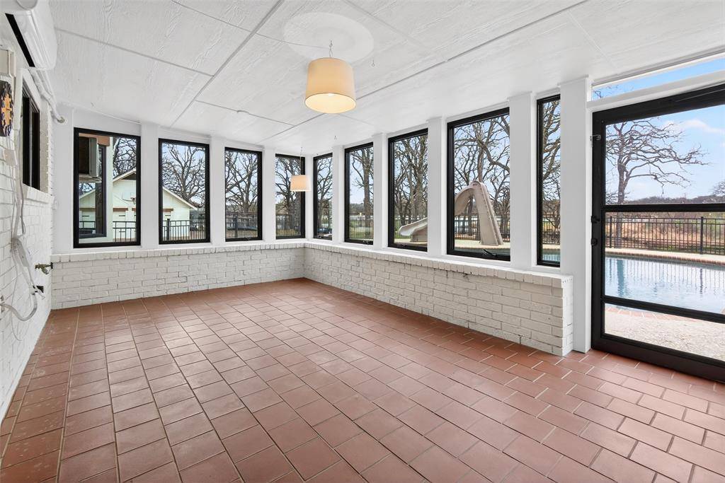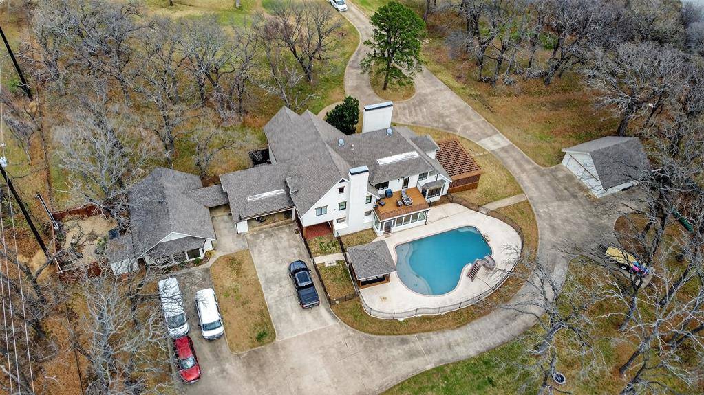 Experience waterside living in the heart of Highland Village on this rare 4+ acre private retreat overlooking the water and scenic views of Doubletree Ranch Park. Tucked away at the end of a long, inviting driveway, this impressive estate offers space, privacy, and exceptional amenities in a truly one-of-a-kind setting. Step inside the main home and be welcomed by a dramatic open stairwell with cathedral ceilings, rich wood floors, classic white paneling, and a stunning chandelier that creates an elegant first impression. The main level offers a versatile layout with two spacious living areas, a secondary bedroom, private study, formal dining room, and the heart of the home, the kitchen and family living space. The living room features decorative wood beams, adding warmth and character, while the kitchen is beautifully appointed with abundant white cabinetry, accent granite countertops, double ovens, and stainless appliances. Just beyond, a bright sunroom frames picturesque views of the backyard and pool, seamlessly connecting indoor and outdoor living. Upstairs, the primary suite is a true retreat, featuring an oversized bedroom with a private sitting area, a remodeled spa-like bathroom with a large walk-in shower, and a private balcony overlooking the water, the perfect place to start or end your day. The upper level also includes three additional secondary bedrooms, providing ample space for family and guests. Step outside to enjoy the resort-style backyard, complete with a large pool, expansive deck, and sweeping water views, all backing to the natural beauty of Doubletree Ranch Park. A separate guest house offers incredible flexibility with a bedroom, living and kitchen combo, and full bathroom, making it perfect for guests, multigenerational living, or private retreat. The property's value is uniquely enhanced by two newly surveyed additional lots, offering a rare opportunity for further development or the creation of a multi-generational family compound.