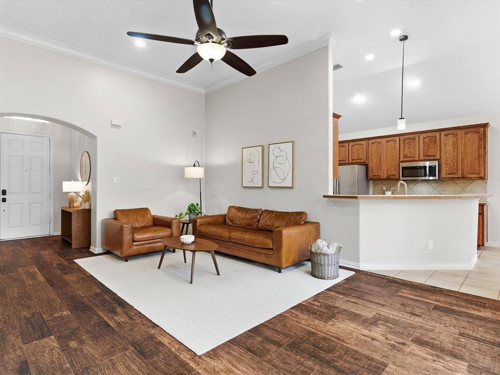 Your New Chapter Begins in Lantana! Welcome to the perfect backdrop for your next big milestone. Nestled in the sought-after, master-planned community of Lantana, this rare one-story gem combines a low-maintenance lifestyle with high-end, staycation, vibes. Whether you're chasing a toddler or planning for the future, this home is designed to grow with you. Enjoy stress-free living inside and out. The backyard is a showstopper. Imagine crisp Texas evenings by your private stone firepit, morning lattes on the back patio, or hosting the ultimate game-day BBQ in your gorgeous gazebo (both the house and gazebo received new roofs in 2024!). Inside, you'll find hardy wood-look floors—perfect for pets and play—and soaring vaulted ceilings that make the open-concept living area feel massive. This home is truly move-in ready with a remodeled hall bath, fresh paint, just-replaced carpet in the secondary bedrooms (2026), and a new stove and microwave (2026). Forget spending your Saturdays behind a lawnmower. The Lantana HOA handles your front lawn maintenance, giving you more time to enjoy the incredible local lifestyle. You are minutes away from the best of the area. Enjoy easy access to Highland Village shopping, local preschools, and the legendary Marty B's—where you can grab dinner, a morning coffee, or a treat at the brand-new ice cream shop. A community built for YOU - Lantana isn't just a neighborhood; it's a lifestyle. You'll be steps away from top-tier amenities including: Spray parks, multiple pools, state-of-the-art gyms, and the recent community center with shuffleboard. Outdoors, experience miles of hiking, biking trails, fishing ponds, and basketball-tennis courts.