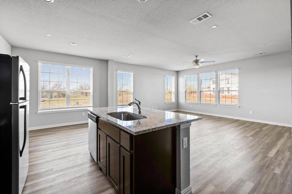2 STORY CORNER TOWNHOME with views of the park in VISTA DEL ARROYO community in Denton, just off 35 and Loop 288. Convenient location, at a short driving distance to the Universities, Dog Park, Shopping, Restaurants, Entertainment, REC Center, Fishing, Playgrounds, Sports complex, Lakes and Parks. The first floor features a spacious family room, great kitchen with custom cabinets, granite countertops and a bedroom with easily accessible full bathroom. Upstairs boasts the primary Bedroom with a spacious closet and en suite bath, a secondary bedroom, a full bath and the laundry closet. Refrigerator, Washer and Dryer included.