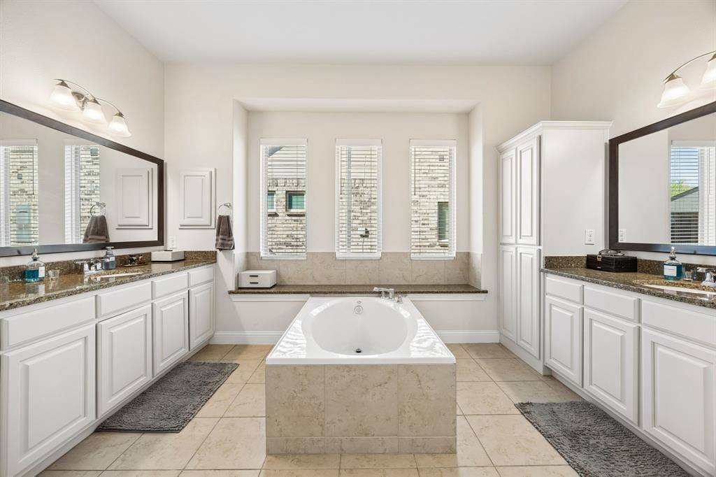 Primary Suite Downstairs A massive sanctuary featuring a spa inspired bath with double vanities and a deep garden tub.