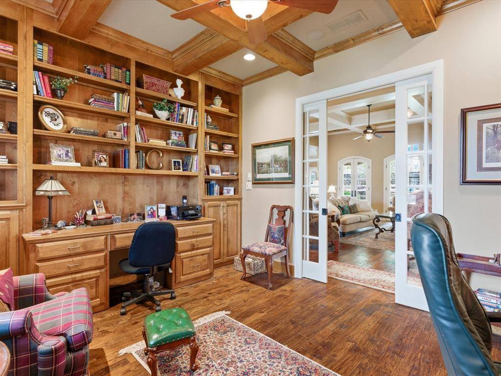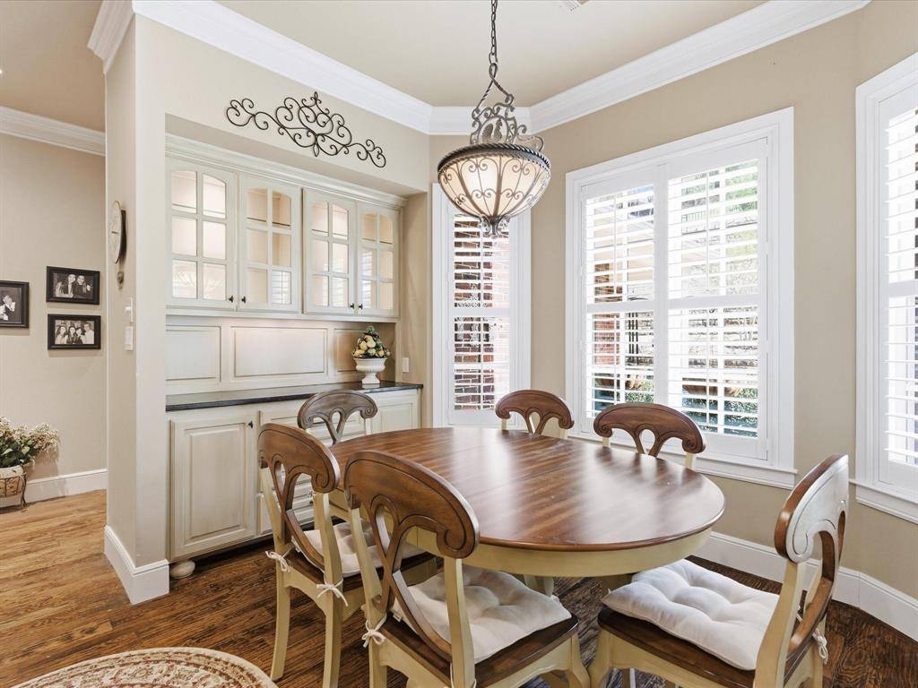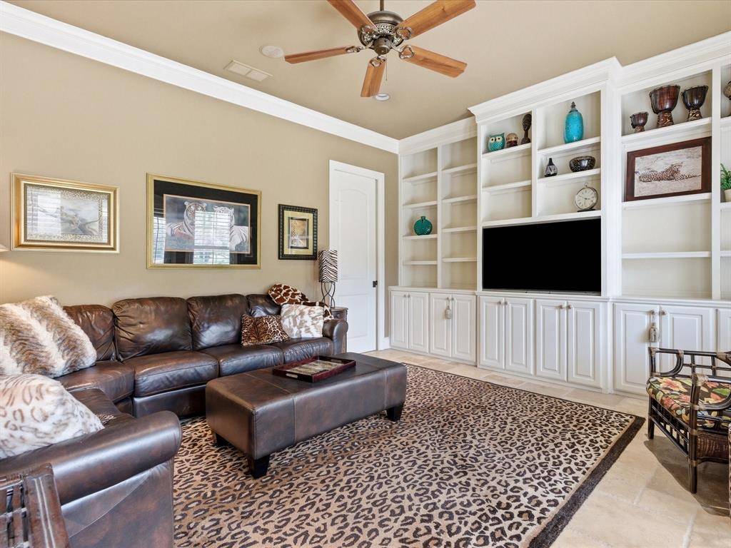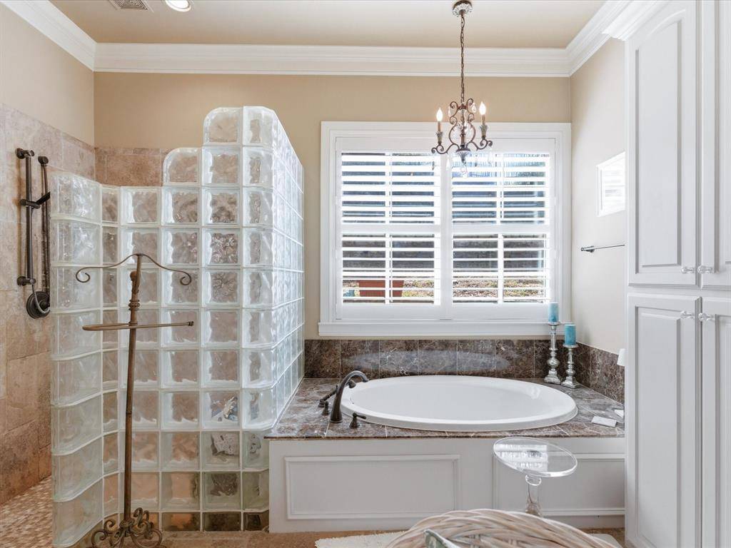 A beautiful custom one story home in Highland Village is nestled on a hill in a quiet cul-de-sac. This southern design home features a private covered porch with elegant columns, which provides a view of Lake Lewisville. Abundant built-ins can be found throughout the home as well as all the closets. The extra large master closet is impressive with ample built-ins and two walls of shelves. The large master bath has a walk-in shower and nice linen storage. The other two bedrooms each has a private bath, and a well decorated powder bath is near the family room. A storage room off the family room has many shelves and space for an exercise room, hobby area, or 4th bedroom if needed. All rooms except wet areas have hand scraped hardwood floors and custom ceiling treatment in both the living room and the study office. This lovely home features a tandem garage, which can accommodate three vehicles or simply more needed space. Overall, these many sophisticated upgrades create the perfect balance of a comfortable and elegant lifestyle.