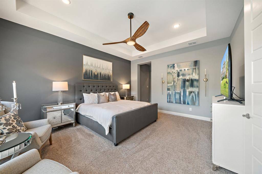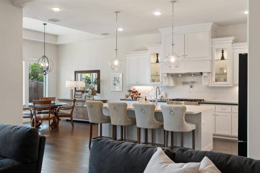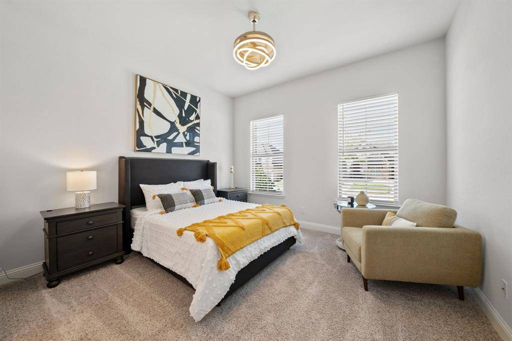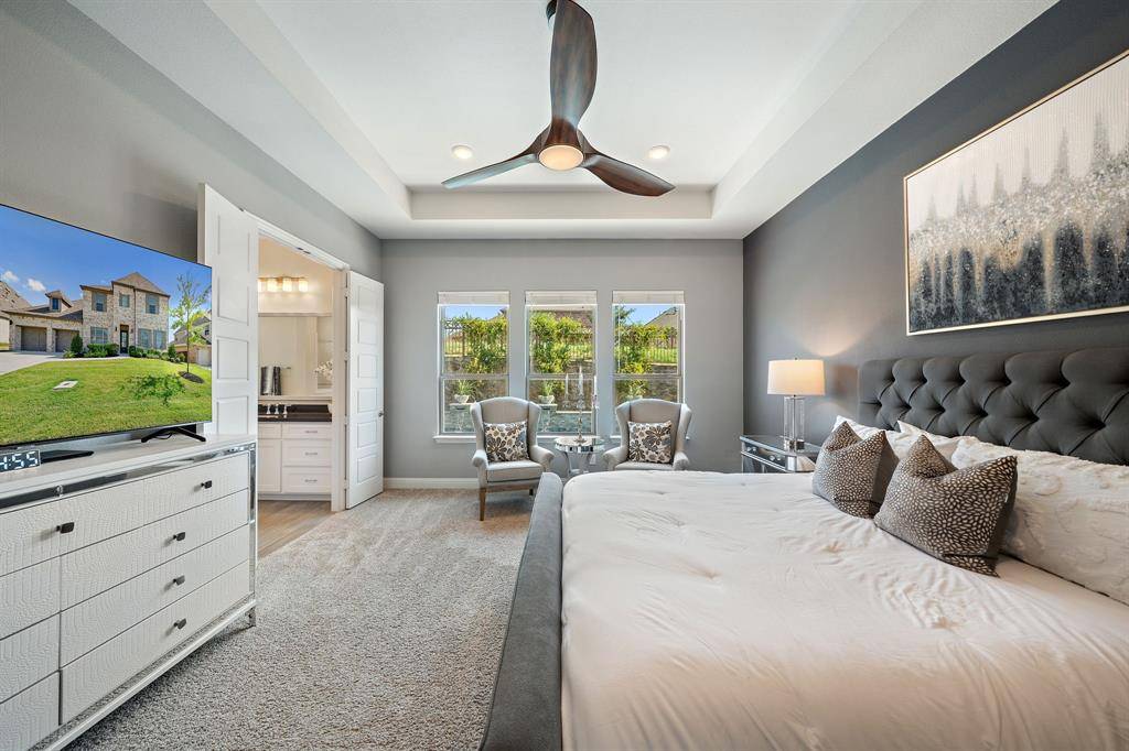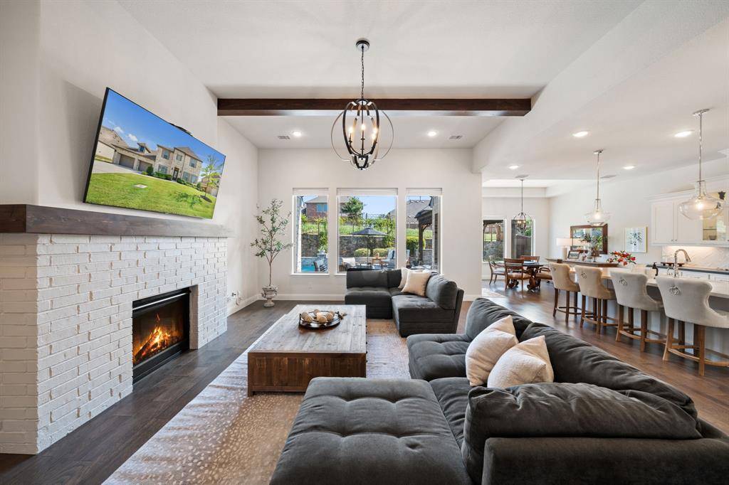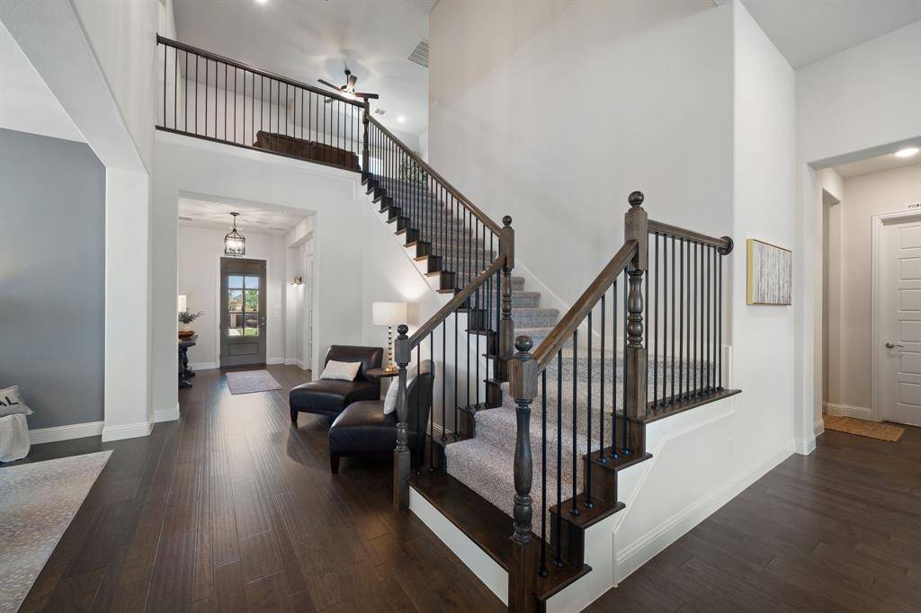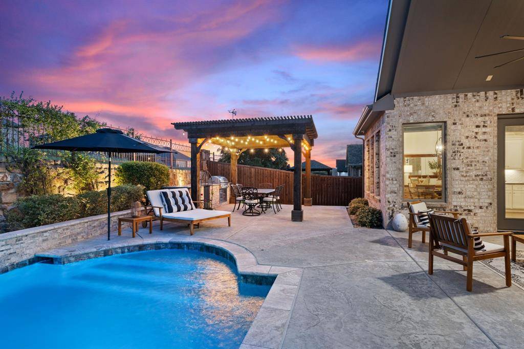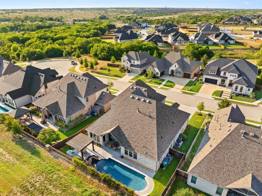 Gorgeous and immaculately maintained! Situated on a culdesac street with direct access to one of many paved trails of the master planned community Canyon Falls. This home exudes warmth and luxury from the moment you walk in. Warm wood flooring and neutral paint tones greet you as you enter. The main floor is perfectly laid out offering a dedicated office that could be utilized as a 5th bedroom, generous sized guest suite w full bath, half bath, massive utility room and a grand living room w wood beams, upgraded lighting and gas fireplace. Your dream kitchen awaits w tons of cabinetry, plenty of counter space, seated island, 6 burner gas stove, pot filler, double oven, pull out spice rack, polished nickel finishes and tons of natural light. The primary suite is tucked away with a spa like bath featuring separate vanities, soaking tub and frameless glass shower. You'll have sparkling pool views from almost every room on the main floor! The second story offers an additional living space, two bedrooms and two full bathrooms, one being ensuite and a bonus room, currently being utilized as a gym, but could be the perfect media room as it is wired for surround sound. The back yard is perfect for entertaining w covered patio overlooking the pool with waterfall features and LED lighting w smart app. The pergola is wired for surround sound and provides the perfect spot for outdoor cooking. There is extensive counter space for meal prep and serving, built in beverage fridge and direct plumbed Bull gas grill. Your new home comes w smart features for your sprinkler system, thermostats, pool and security. Canyon Falls is where nature meets community and offers tons of fabulous amenities for residents including pool, fitness center, pooch park, fishing, hiking, biking and tons of activities and events. HOA dues cover front yard maintenance, cable and internet. Located in one of the most desirable suburbs and zones to highly rated Argyle ISD and within walking distance to schools.