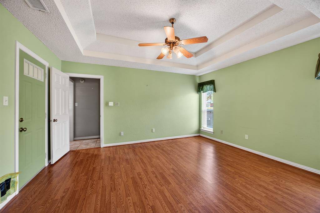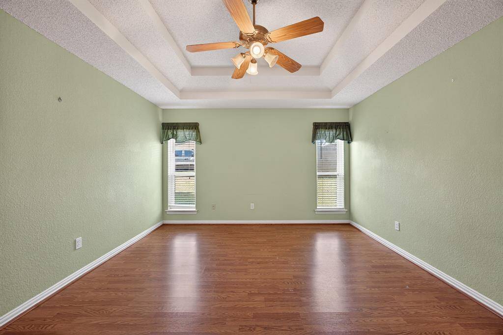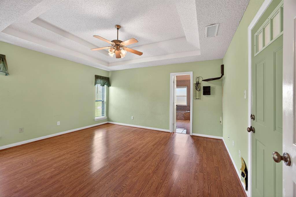 The island kitchen is both functional and welcoming, boasting durable granite countertops, black appliances, and beautiful solid red oak cabinets that provide ample storage. The formal dining has a massive vaulted ceiling and can easily be converted to an office. The thoughtfully designed layout includes split secondary bedrooms that offer privacy from the primary suite. The spacious primary suite includes its own ensuite bath, creating a comfortable retreat at the end of the day.