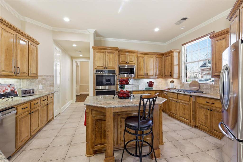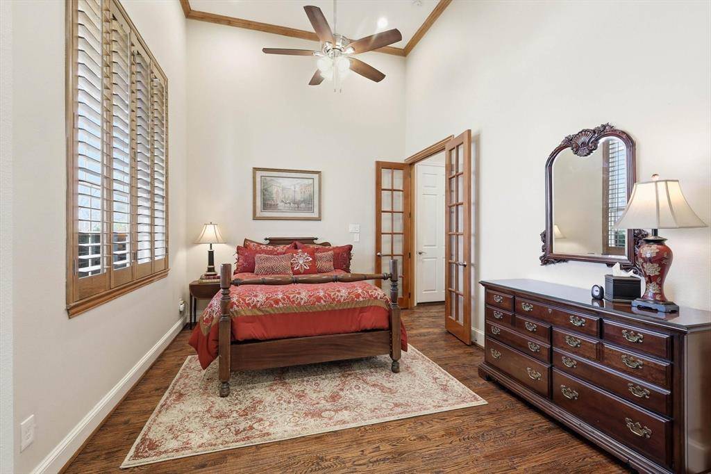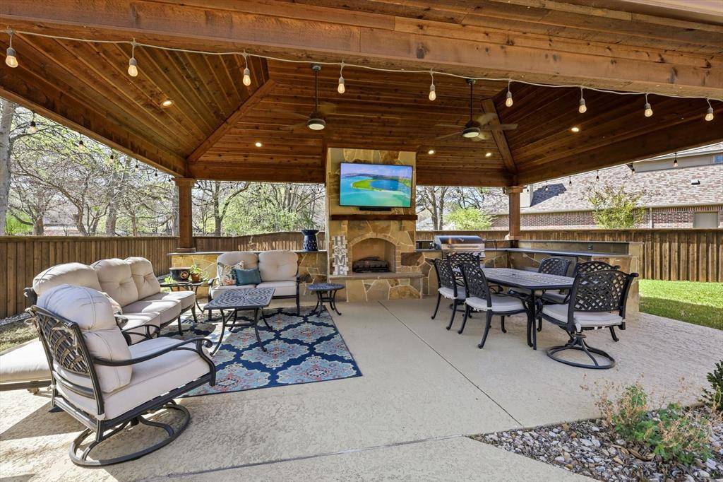 This stunning custom-built true Multi-Generational Home, originally crafted by Sanders, sits in the heart of the highly sought-after Bridlewood at Coventry Golf Community. Featuring five bedrooms, four and a half baths, a three-car garage with extended drive, fenced exterior storage, and a fabulous 25 x 19 outdoor kitchen-living space complete with grill, fridge, stone fireplace, alfresco lighting, cedar-beamed ceiling, and a gorgeous pool with extra grassy play area for kids and-or pets—all on an oversized, beautifully landscaped 0.38-acre double cul-de-sac lot. The floorplan allows for privacy and independence, attached in-law wing is one level & first floor and offers own private front and back entrances, a full kitchen, and a living room highlighted with vaulted beamed ceiling and abundant natural light! The first level of home including guest wing boasts extensive hand-scraped hardwoods, tall ceilings, fresh neutral paint, arched entryways, plantation shutters & blinds, custom wood trim finishes & built-ins, granite c-tops, enjoy gas cooking, stainless-steel appliances, designer fixtures, LED lighting, and Wi-Fi extender throughout. The spacious main living and kitchen areas are perfect for entertaining, with seamless indoor-outdoor flow to the pool-patio framed by palm trees. The first-floor primary suite offers backyard access, pool views, a spa-like bath, and walk-in closet, while upstairs you'll find a media-game room and three additional bedrooms—one en-suite and two sharing a Jack & Jill bath. Just minutes from DFW International Airport, with easy access to I-35E and I-35W, top-rated LISD schools, lakes, parks, trails, marinas, dining, shopping, and entertainment. The Bridlewood community offers pickleball, tennis, basketball, pools, a fitness center, clubhouse, golf club, and restaurant, plus nearby Bridlewood Farms Equestrian Center amenities. Floor plan, features list, aerial photos, and video tour available online.