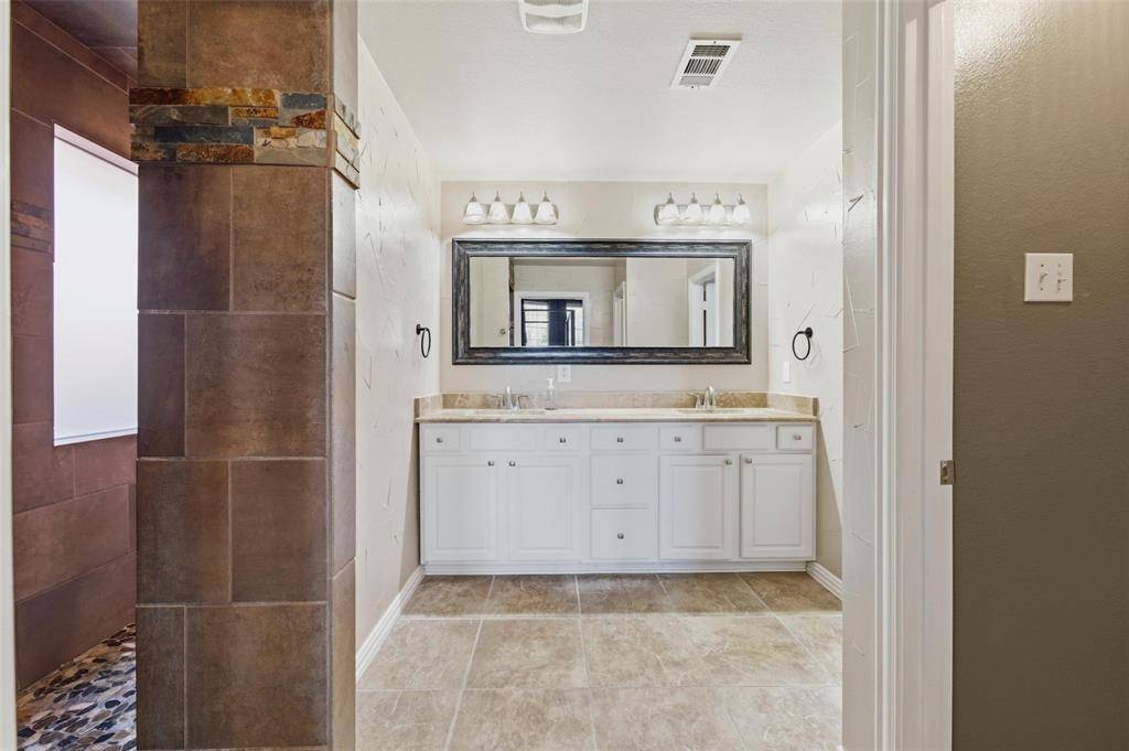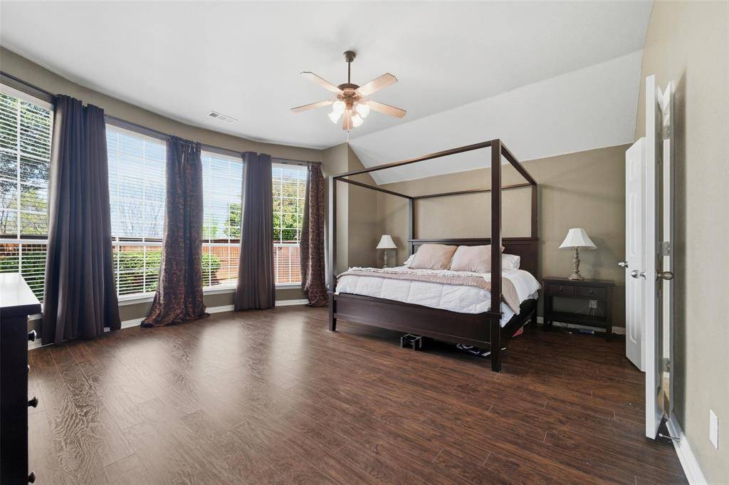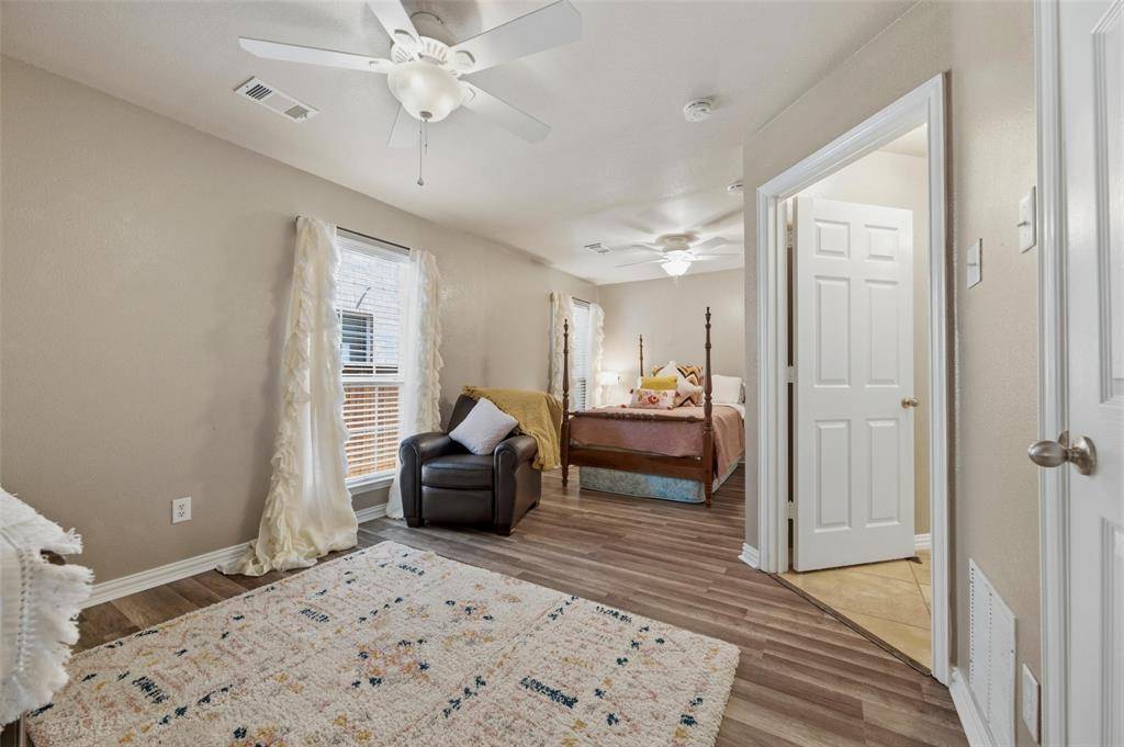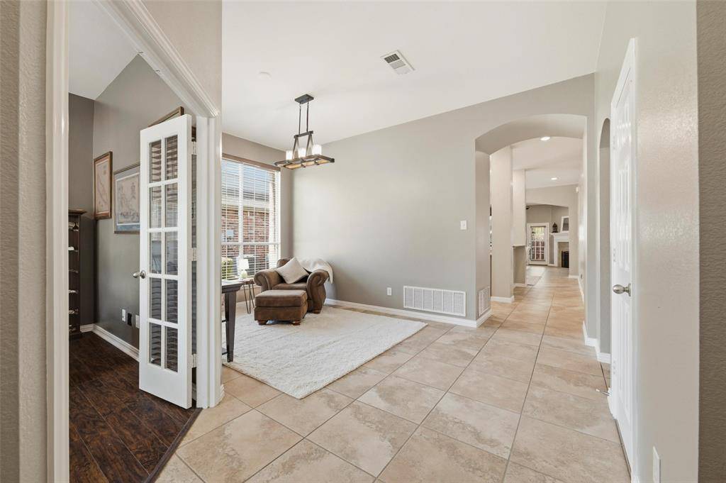 This beautifully maintained home is situated in the highly sought after, award winning master planned golf course community of Lantana. The home features an open concept floorplan filled with light and has three spacious bedrooms and three full bathrooms. Stepping into the home you are greeted by a large dedicated study with French doors making working from home a pleasure. The formal dining room and large eat in kitchen provide ample space for large gatherings. The family room has large windows that offer a view of the covered back patio and well manicured back yard. The guest bedroom downstairs is super sized and has an adjacent full bathroom, making it a perfect in-law or next generation suite. The primary bedroom is also located on the first floor and features a cozy sitting area. The primary bath has a 9 ft. walk-in shower with custom stone and tile with four shower heads! Upstairs is a large game room, bedroom and another full bathroom. The home features manufactured wood plank and tile throughout making it low maintenance and allergy friendly. Other upgrades include granite countertops in the kitchen and bathrooms. The roof was replaced in 2024 and the Carrier brand AC unit is just over two years old. The home includes surround sound wiring, wood blinds, landscape lighting, exterior surveillance system and attic insulation. An extra bonus of this home is that it backs up to a 30 foot greenbelt and is within walking distance of the community club house. Lantana living includes multiple pools, fitness centers, tennis, pickleball and basketball courts. The HOA fee includes front yard maintenance! This amazing community is conveniently located adjacent to Highland Village Shopping Center which features high end shopping, dining and spas!