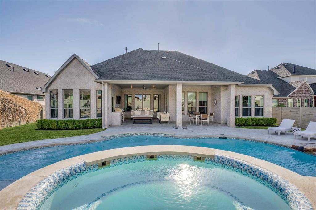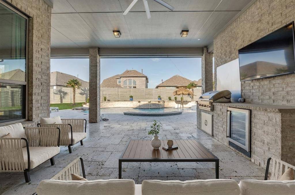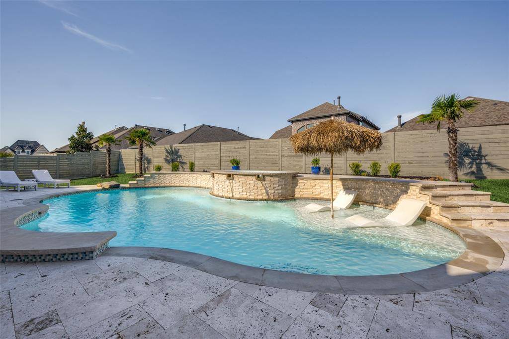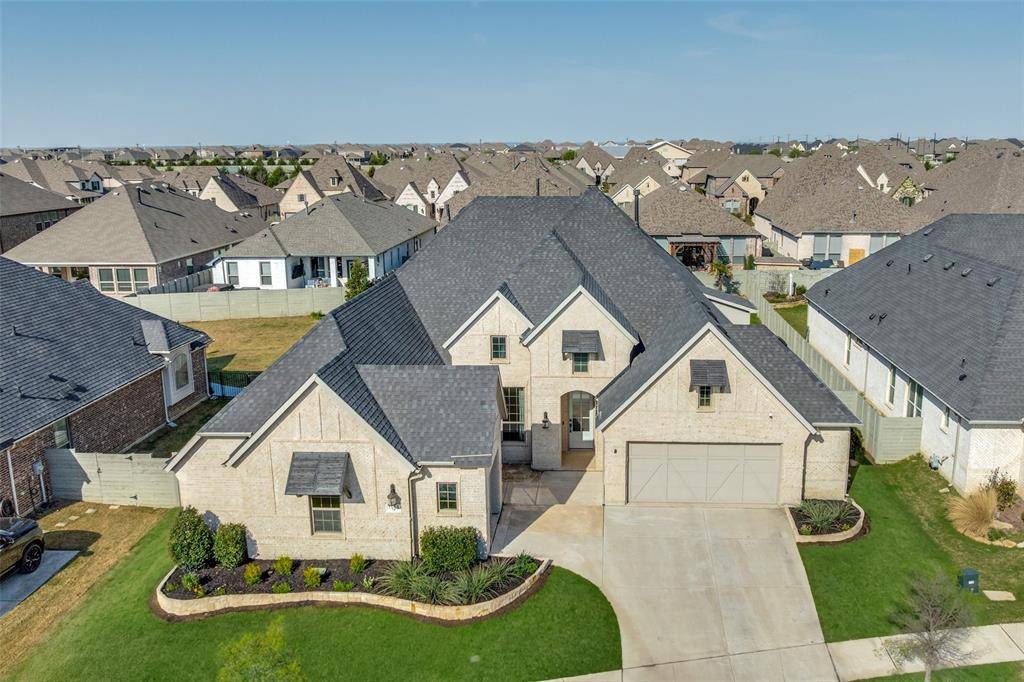 Like-new, one-story home at its best, located on one of the few cul-de-sacs in the highly desirable, award-winning Harvest community within Argyle ISD. This thoughtfully upgraded 4-bedroom, 3.5-bath, 3-car garage home also features a dedicated office and a media room, which offers flexibility and can easily function as a 5th bedroom if needed.One of the secondary bedrooms is designed as a private en-suite with its own separate entrance, ideal for generational living, guests, or extended stays.The open-concept living area seamlessly extends to the outdoor entertaining space. Step outside to a true resort-style retreat featuring premium travertine pool decking, a custom pool and spa, and a fully equipped outdoor kitchen—creating a backyard experience unlike any other in the community.Upgrades a custom stone landscaping border, enhanced professional landscaping, fresh interior paint, designer light fixtures, extended hardwood flooring flowing through the primary suite, primary closet, and private generational suite, and an enhanced in-ceiling speaker system in the main living and outdoor areas.This smart home makes life easy. Preheat the double oven, warm the spa, control HVAC and watch any of the 4 security cameras from anywhere.Harvest offers an unmatched lifestyle with multiple pools, fitness centers, parks, dog parks, volleyball and basketball courts, scenic walking trails, and a stocked catch-and-release fishing pond.A rare opportunity to own a move-in ready home with elevated upgrades in one of Argyle's most sought-after neighborhoods.