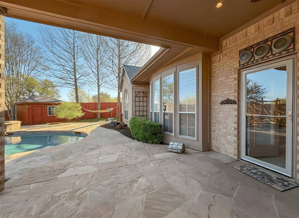 Step outside to your private backyard oasis, complete with a resort-style pool featuring a waterfall and attached spa, along with a fully equipped outdoor kitchen offering a built-in gas grill, mini refrigerator, stainless steel storage, bar seating, and a ceiling-mounted TV—perfect for entertaining year-round.