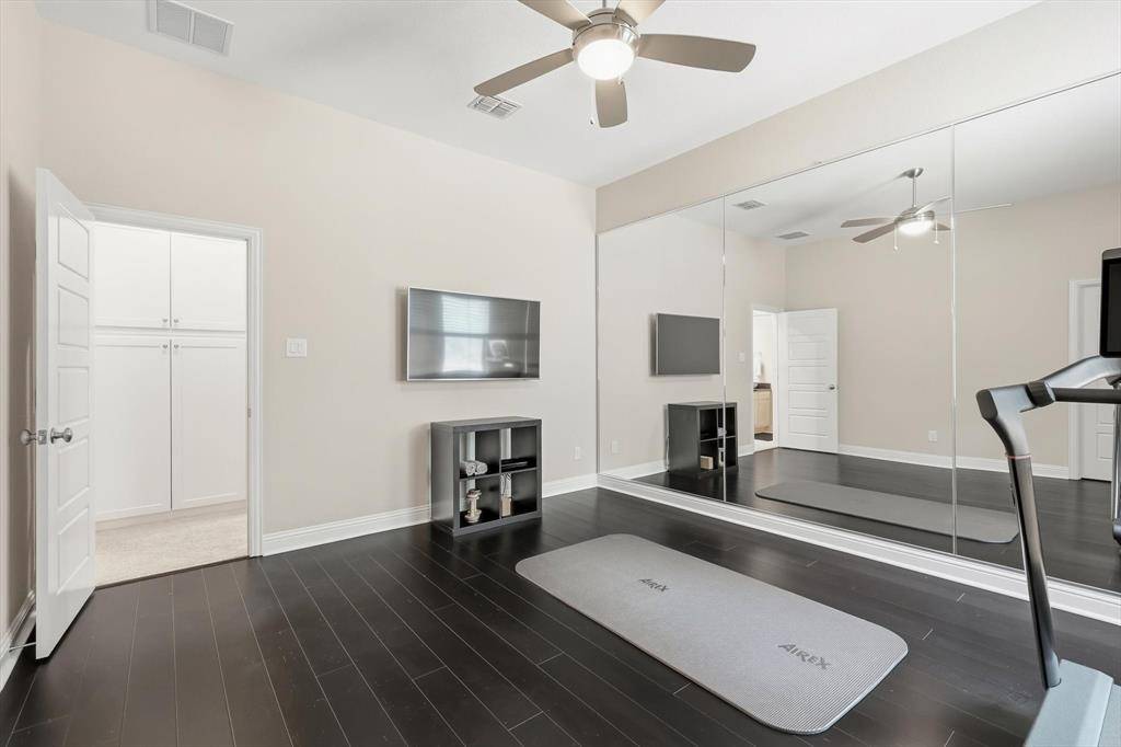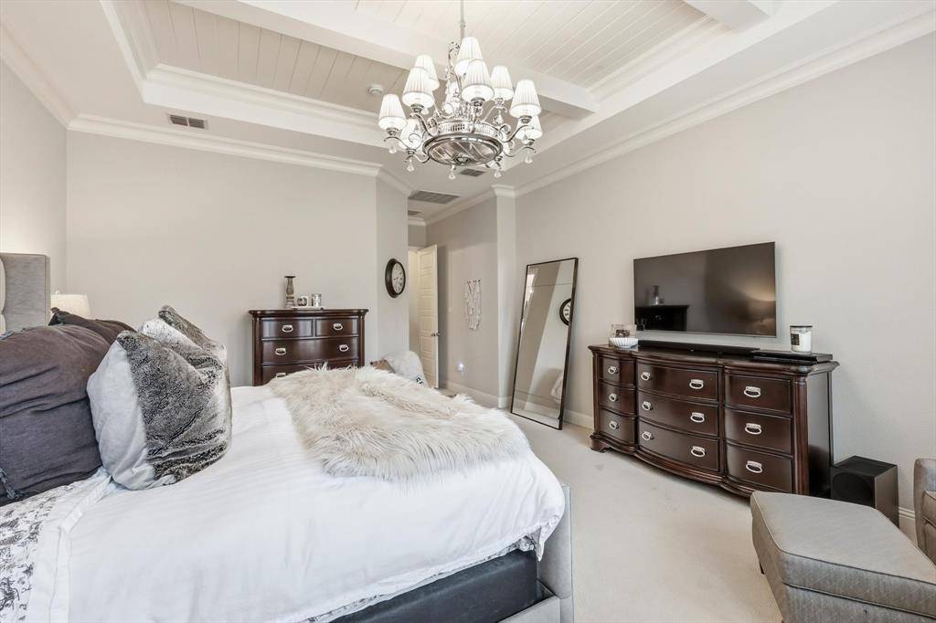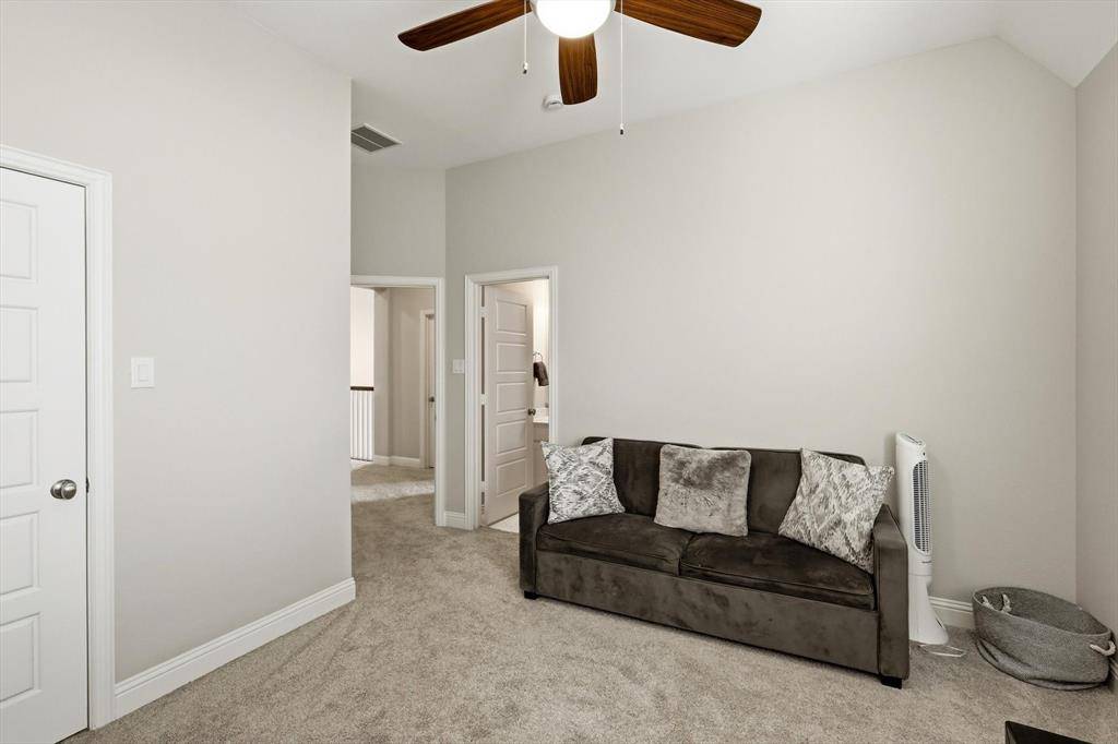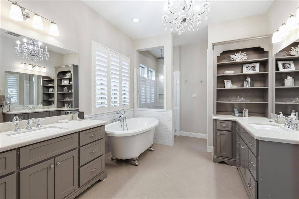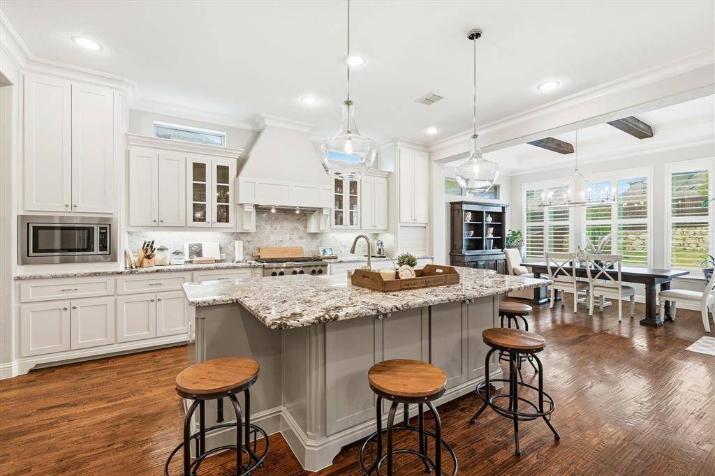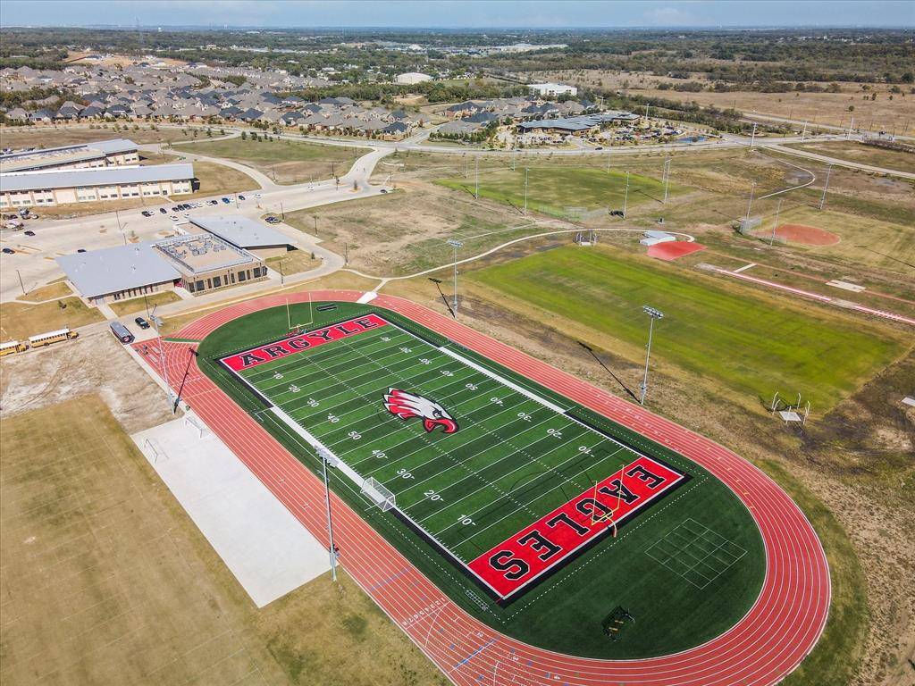 TALK ABOUT LEVELING UP! Rare Canyon Falls find! A combination of architectural grandeur and true comfort. Sophisticated transitional manor, built by Drees Homes (Ravena layout) tucked away in a private cul-de-sac on a massive 0.326-acre lot. This estate offers the luxury of no side neighbors and a backyard white canvas perfectly sized for a resort-style pool, outdoor kitchen, or extra-large playground for kids and pets. Step through the grand foyer to discover a dramatic entrance with elegant chandeliers, double-height ceilings, hardwood flooring, and a private home office behind French doors and a downstairs guest bedroom. The family room exudes Timeless Elegance, featuring a cozy fireplace and Plantation Shutters throughout that bathe the home in soft, natural light. The heart of the home is the stunning kitchen—a chef's dream featuring a massive, upper-grade granite island designed for both prep space and grand-scale entertainment. Tucked away for ultimate privacy, the Primary Retreat offers a spa-style bathroom with a clawfoot tub and a huge walk-in closet that conveniently connects directly to the laundry room. Upstairs, the Texas-sized layout continues with a split-plan featuring two en-suite bedrooms, a large loft, a separate media room, and a 5th bedroom currently transformed into a hot yoga and fitness studio. Permanent holiday jellyfish lighting included. Enjoy the unique topography of Canyon Falls—where the HOA includes front yard maintenance, cable, internet, and amenities like resort pools, a fitness center, and coming-soon pickleball courts. With the lower Flower Mound tax rate and top-rated Argyle ISD, this impactful home is the sophisticated, Timeless Organic upgrade your family has been waiting for!