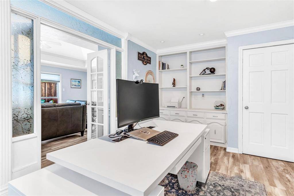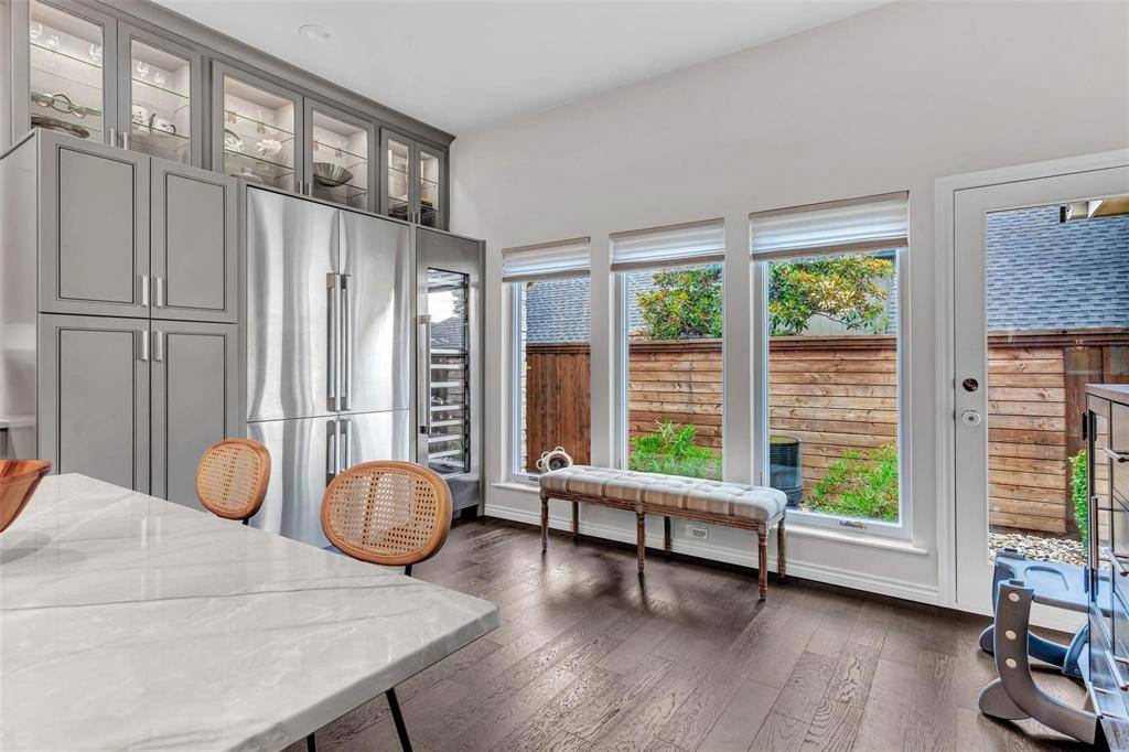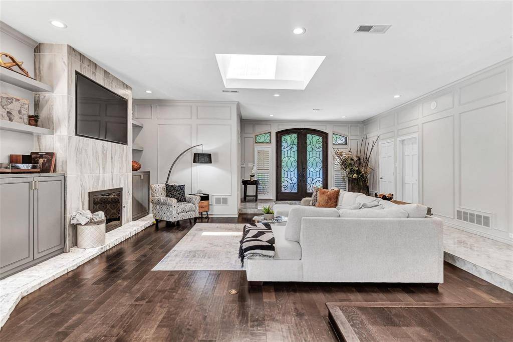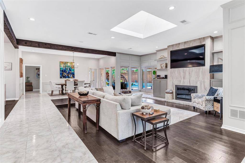 Stunning single story home features $200K in recent updates, including a complete remodel of the kitchen! This gourmet showcase will impress: professional Dacor 6 burner gas range with double convection ovens, Thermador wine refrigerator, built-in Dacor refrigerator and so much more. Other updates include engineered wood flooring, sunken jacuzzi tub and heated floors in the primary bath. The floorplan is open and airy, with the step-down living room, dining and kitchen flowing together to make entertaining a breeze. A versatile exercise or game room features a glass wall and flooring designed for free weights and other gym equipment. Spend your summer lazing by the pool with refreshing waterfalls or lounging under the covered patio. The primary suite also offers a custom plank wall with floating fireplace. A private family room offers exceptional pool views. Fabulous location close to DNT and 121!