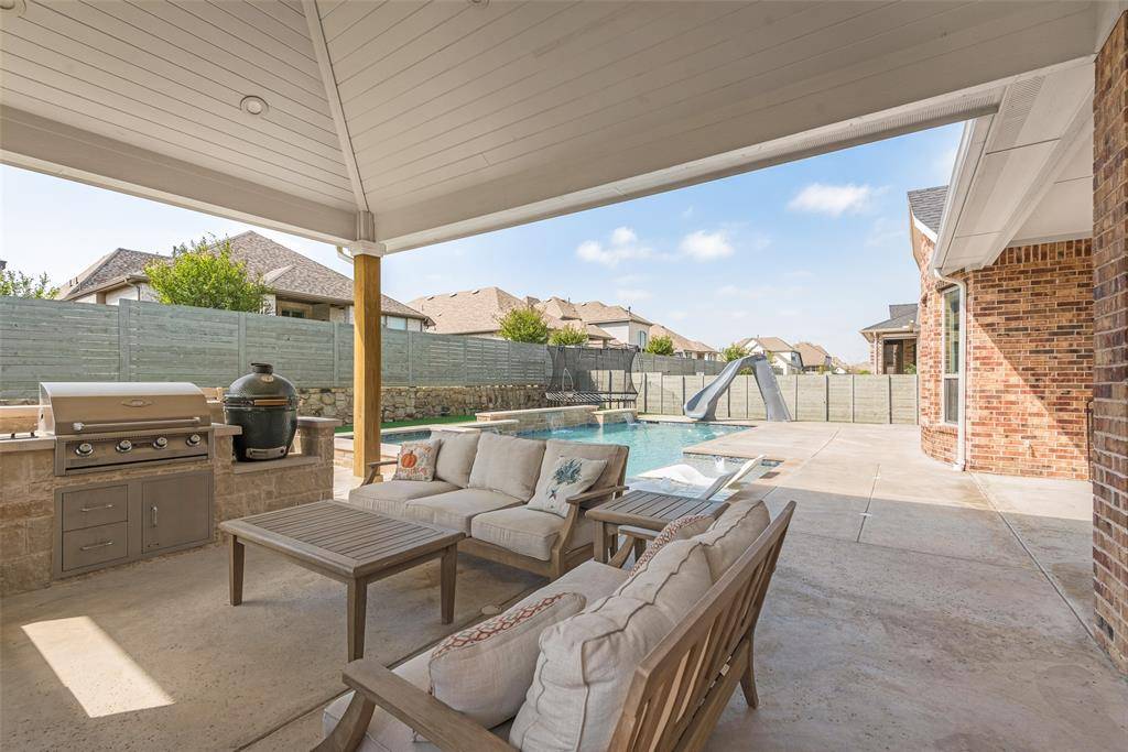 Step outside to your low maintenance backyard oasis complete with turf grass throughout, a sparkling swimming pool with spa and slide, a private putting green, and an incredible outdoor living space featuring a covered patio, outdoor kitchen, grill, and fireplace. This backyard truly feels like a private resort and is perfect for entertaining year round. The outdoor TV will convey with the home, making this space even more ready for game days and entertaining.