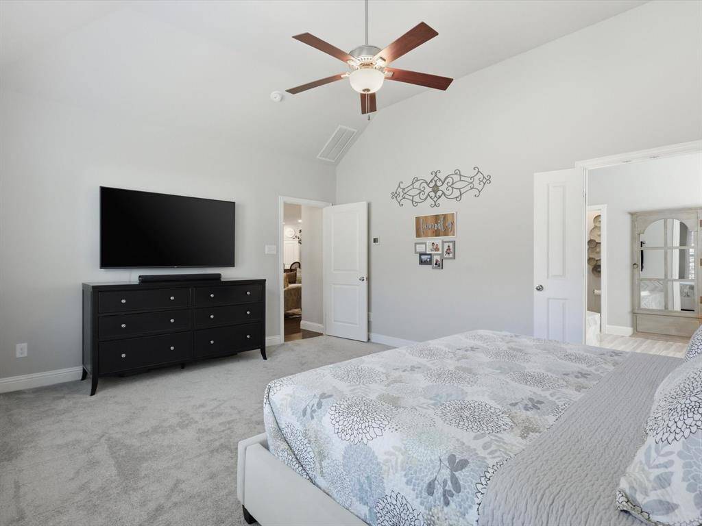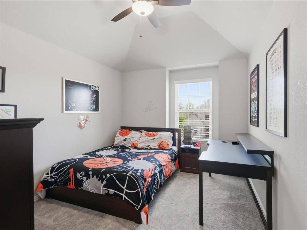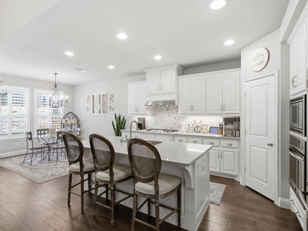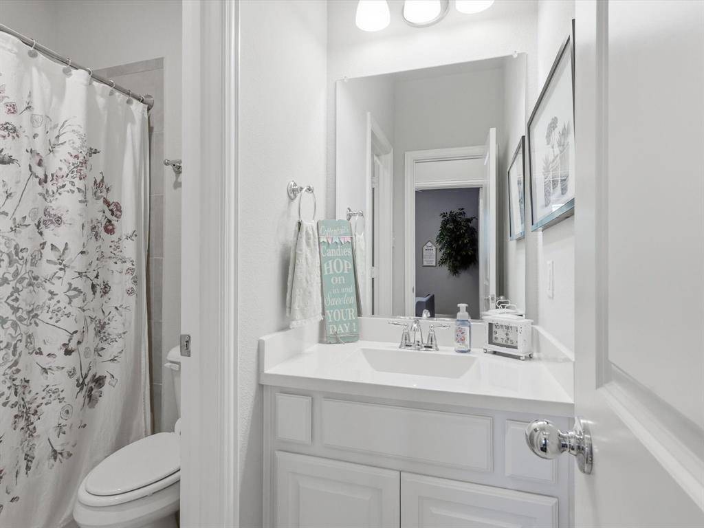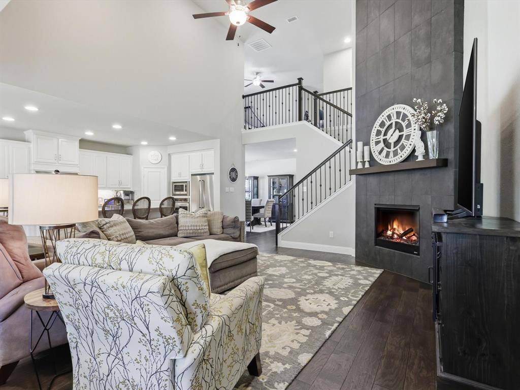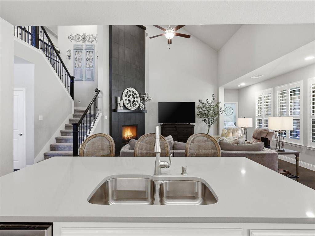 Beautiful and pristine Highland home on an oversized corner lot! The spacious living room features soaring ceilings, a statement fireplace, and a wall of windows that fill the space with natural light while overlooking the private backyard—creating an ideal setting for both everyday living and entertaining. The chef's kitchen is open to the living area and offers quartz countertops, a large island with seating, stainless steel appliances including a gas range, and a bright breakfast nook. Wood flooring flows through the main living areas, complemented by plantation shutters throughout for a timeless look - and enjoy new carpet installed 2025. The private primary suite is tucked away downstairs and includes an en suite bath - dual vanities, a walk-in shower, soaking tub, and an oversized walk-in closet with direct access to the laundry room. The laundry room is generously sized with abundant cabinetry, counter space, and a farmhouse sink. Additional downstairs features include a formal dining room, private study, powder bath, and a guest bedroom with a full bath. Upstairs offers exceptional flexibility with three spacious bedrooms—all with walk-in closets—along with two full baths, a large game room, dedicated media room, and an oversized flex space perfect for a second office, playroom, workout room, or hobby space. Step outside to your private backyard with a covered patio and plenty of grassy space, ready for outdoor entertaining and everyday enjoyment. 3 car tandem garage has nice epoxy flooring and elevated shelves for storage. A beautifully maintained home with space, flexibility, and thoughtful details throughout. Community amenities include pool and playground. Easy access to 75, 380; close to Baylor Scott & White Hospital as well as all the shopping, dining and entertainment McKinney has to offer!