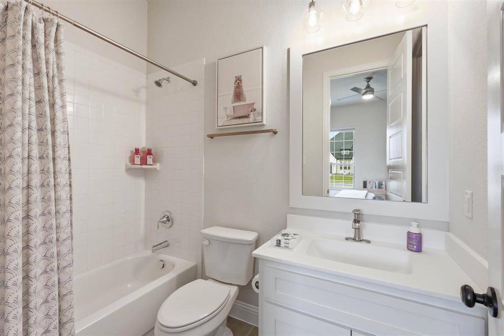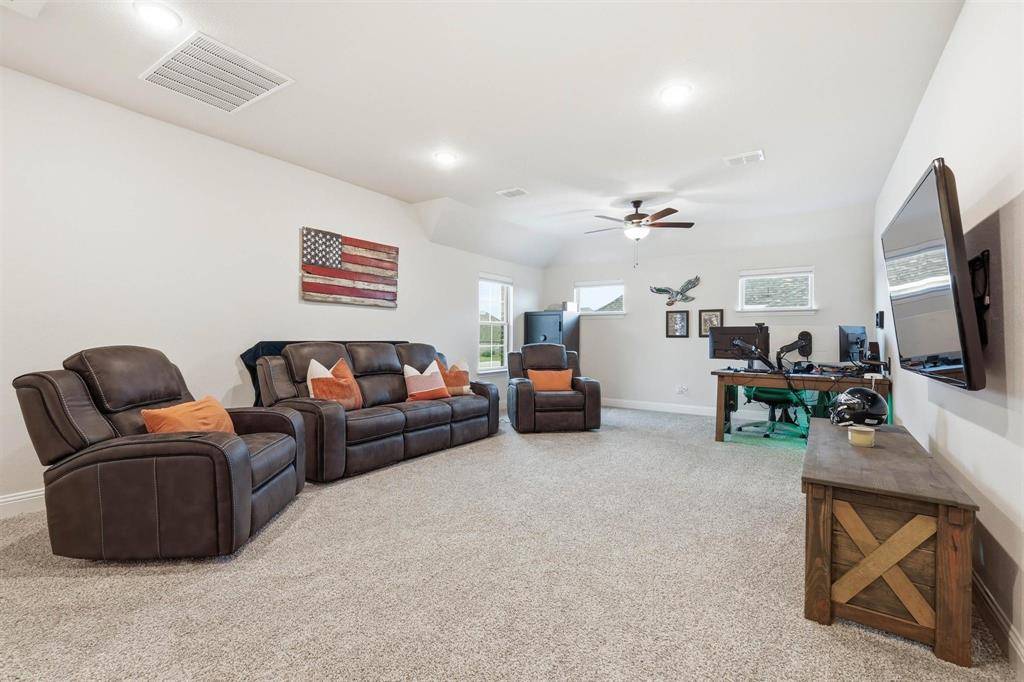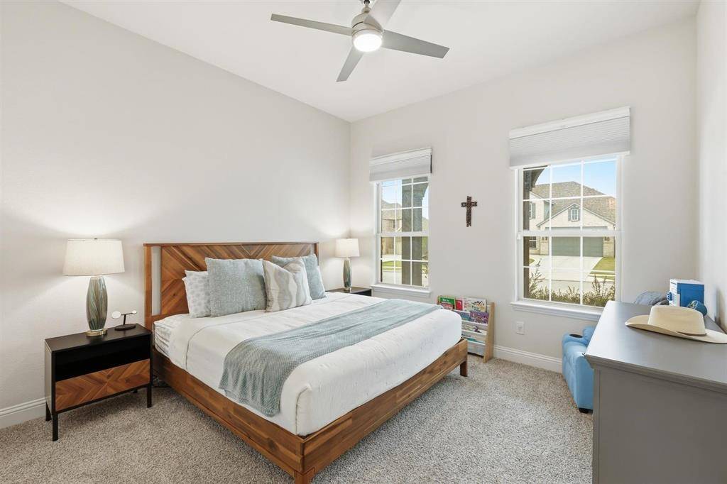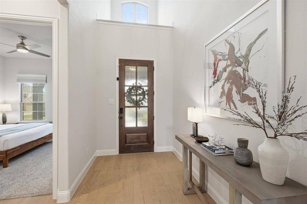 Exceptional Drees Custom Home in Argyle ISD. The experience begins with a deep, inviting front porch that sets a welcoming tone before entering through a dramatic double-height foyer. The grand entrance immediately reveals the home's thoughtful layout: private guest bedroom with an adjacent full bathroom at the front of the home, alongside a dedicated study featuring elegant glass French doors. The elongated foyer leads into a vast, open-concept living space where soaring ceilings are anchored by a striking architectural beam that spans both the kitchen and great room. The modern yet classic white kitchen serves as a bright focal point, flowing seamlessly into the living area anchored by a stately fireplace. A massive sliding glass door floods the space with natural light and provides a transparent transition to the outdoors. The primary suite is a private retreat located on the main floor, along with a secondary bedroom featuring a full ensuite bathroom. Upstairs, a sprawling loft offers a versatile footprint for gaming, entertainment, or a dedicated home-schooling environment, complemented by another spacious bedroom and a well-appointed full bathroom. The functional design extends to the three-car split garage, which features a separate one-car bay ideal for a private workshop, studio, or golf cart storage. Situated on an expansive lot, the Texas-sized backyard is a true blank canvas ready for a custom pool, professional landscaping, or a premier outdoor kitchen. This property is located within the highly acclaimed Argyle ISD and the premier community of Canyon Falls. Residents enjoy a true lifestyle destination, with HOA-provided front yard maintenance, cable and internet, plus access to miles of hiking and biking trails, a dog park, a fitness center, and multiple resort-style pools. Argyle ISD High School and elementary school are located within the Canyon Falls!