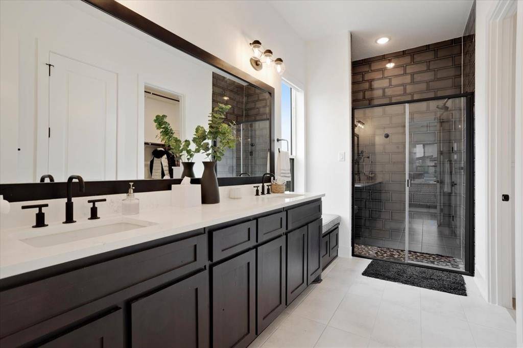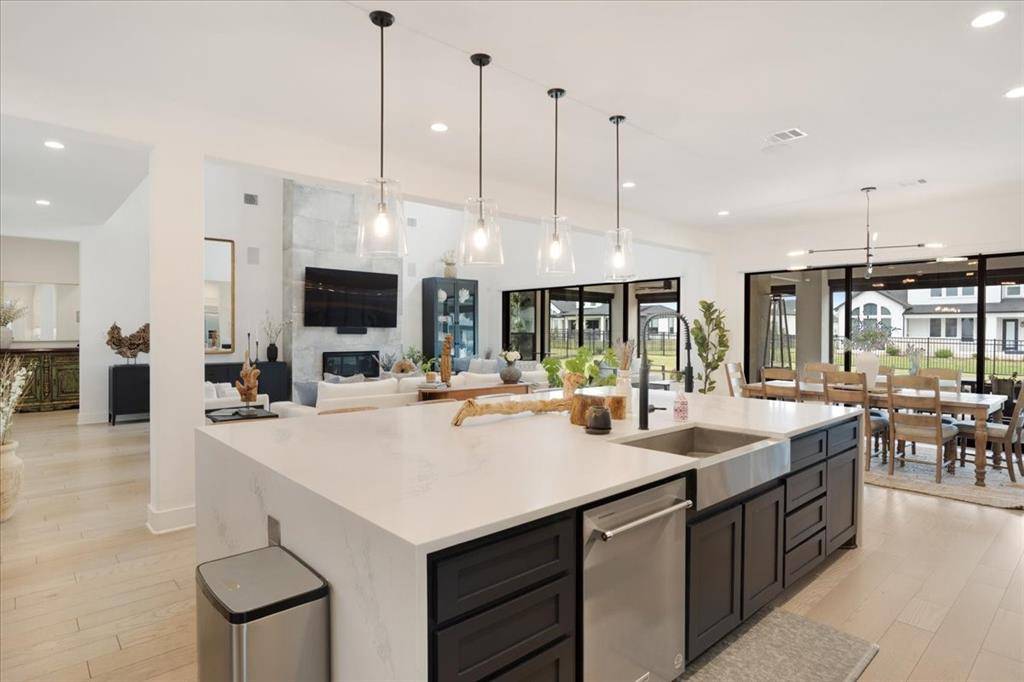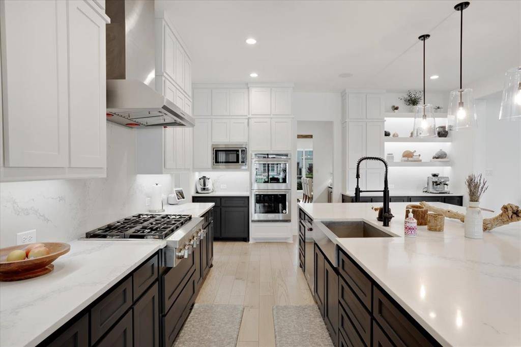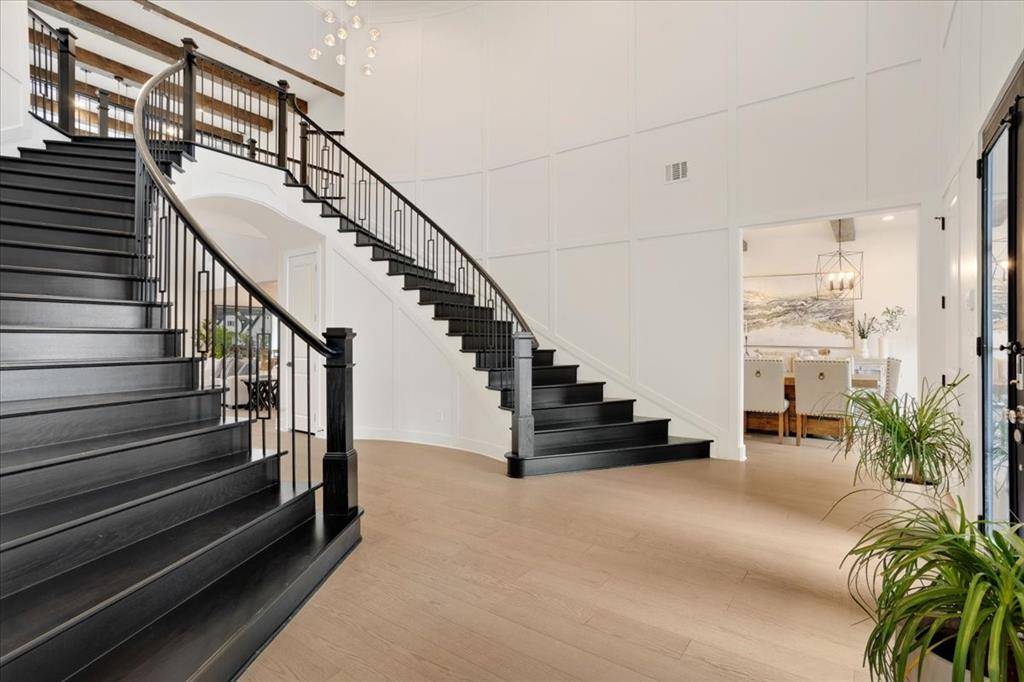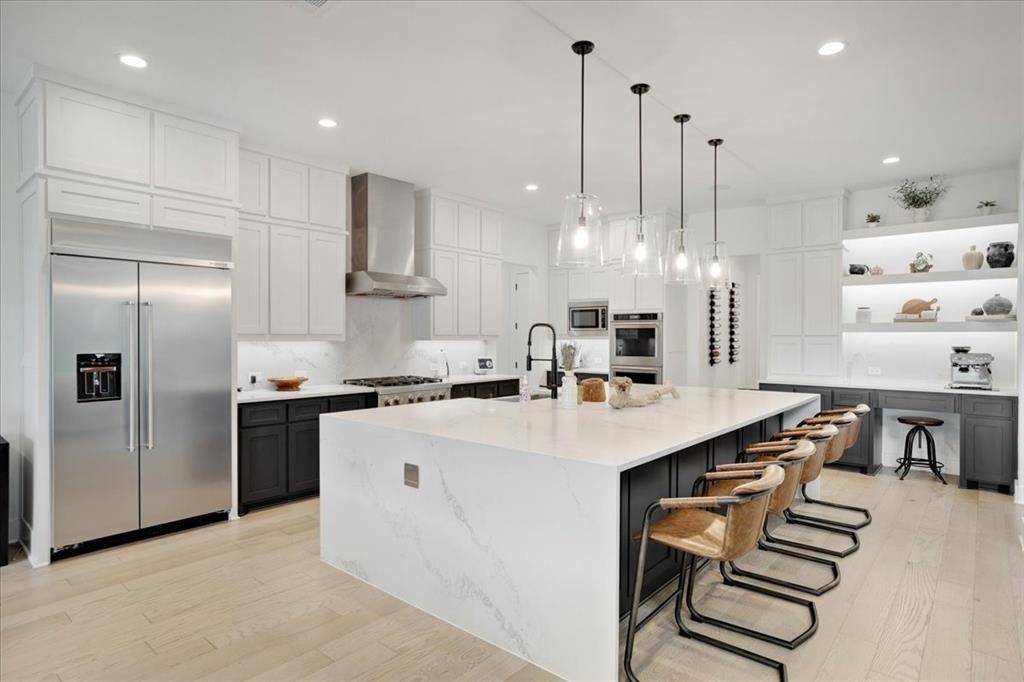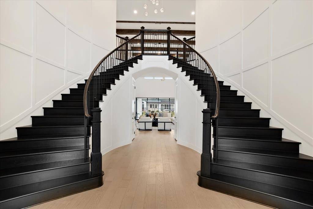 Upon entry, you are welcomed by a grand foyer highlighted by a dramatic double staircase, setting the tone for the upscale design carried throughout the home. At the heart of the residence lies a chef-inspired kitchen, beautifully appointed with an oversized waterfall island, abundant custom cabinetry, and generous prep space perfect for both everyday living and entertaining.